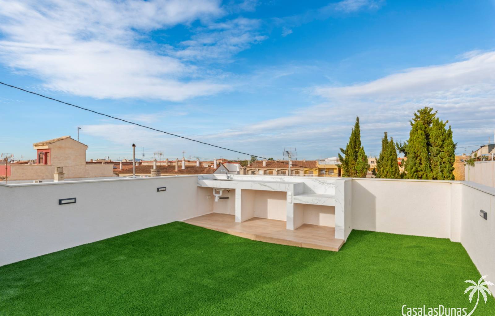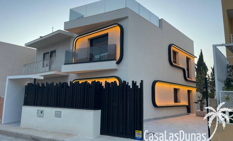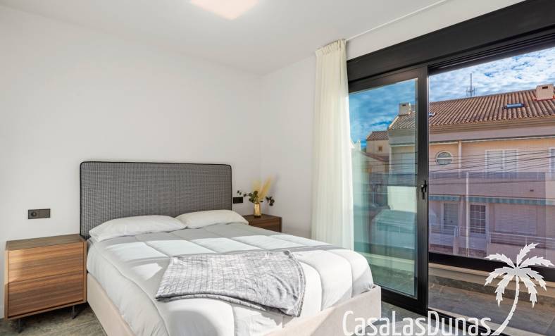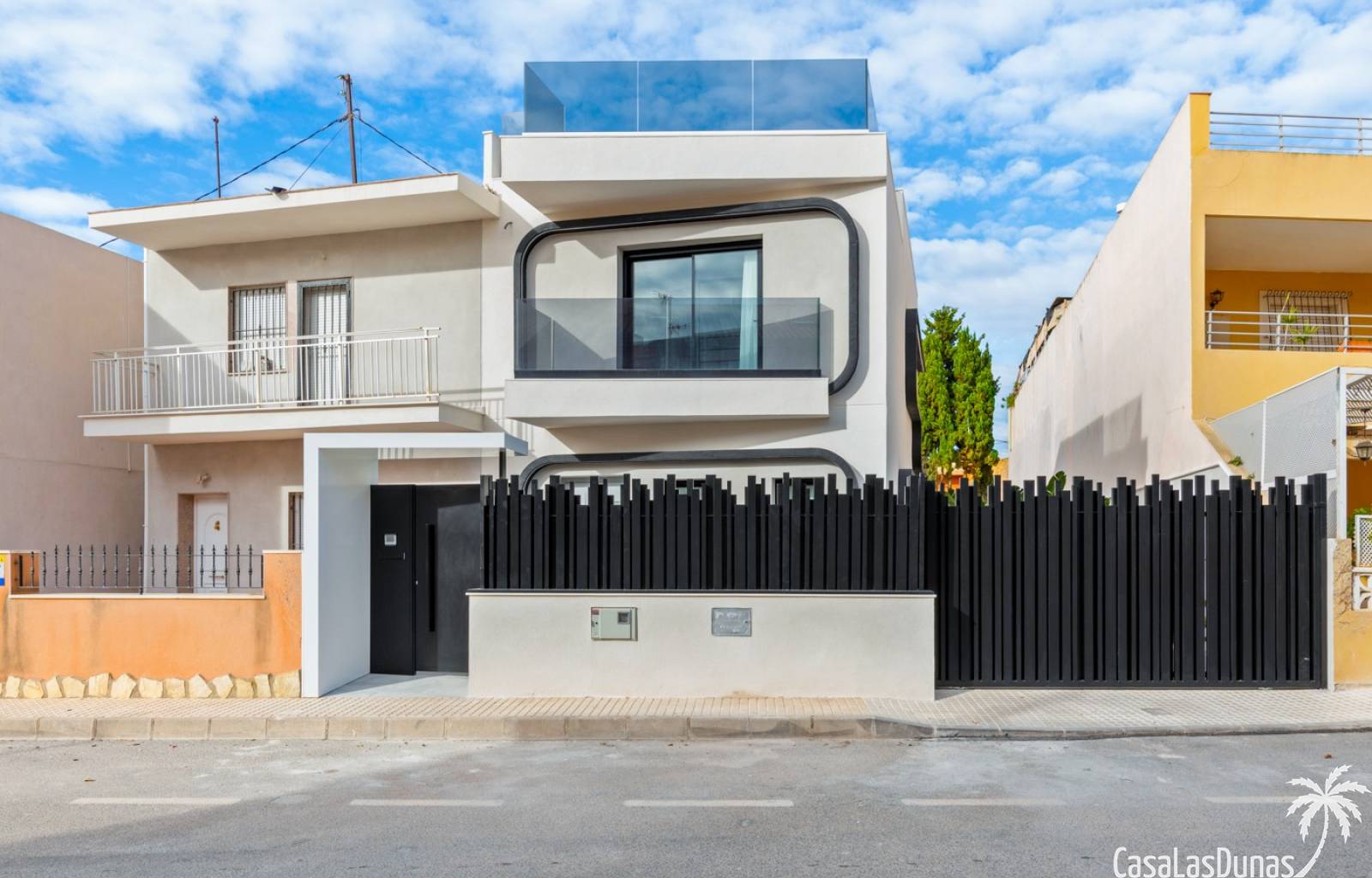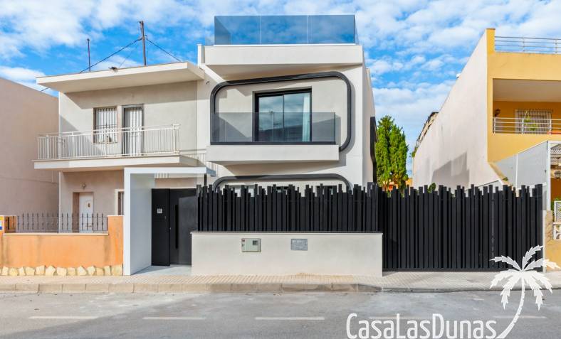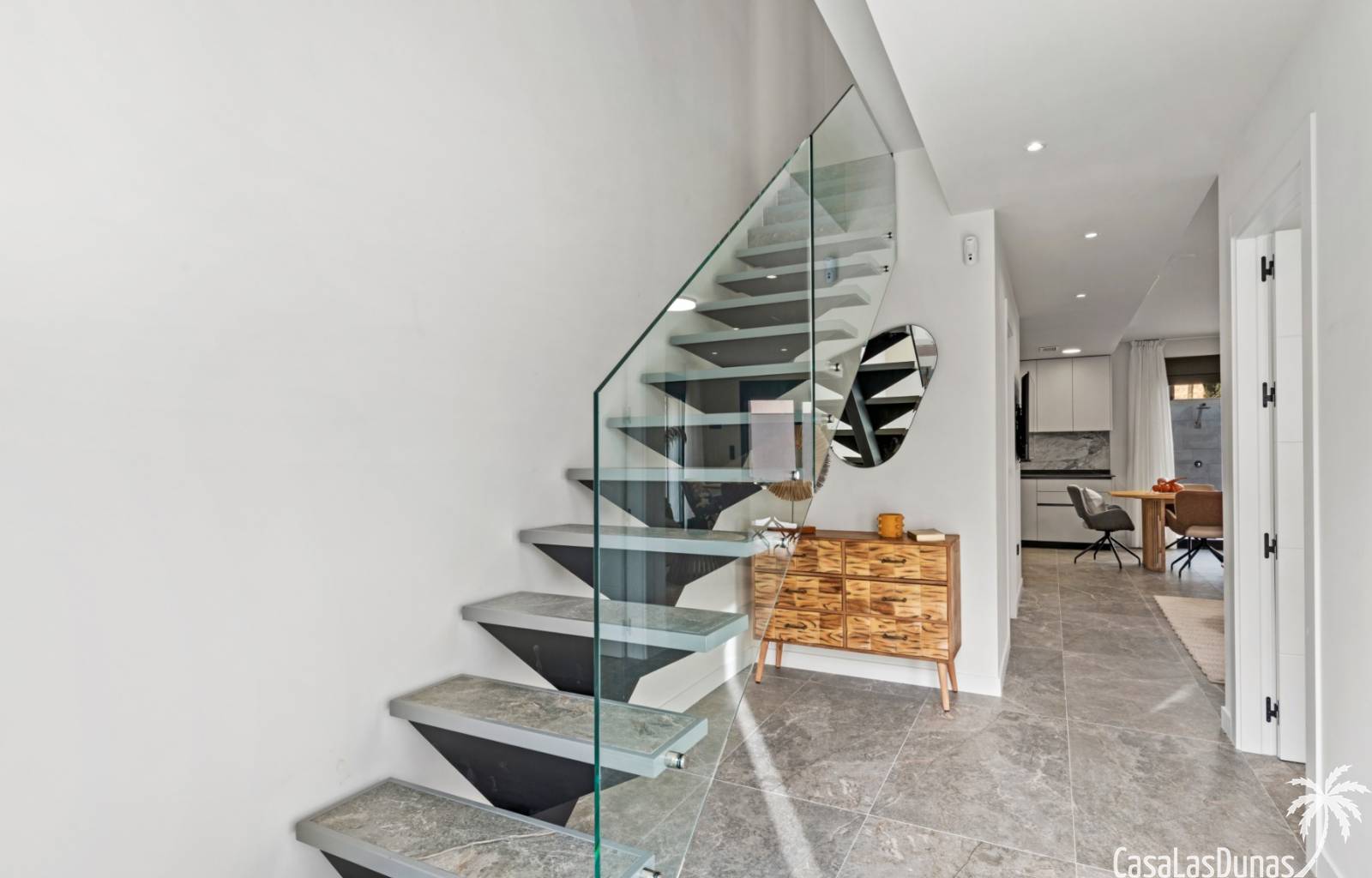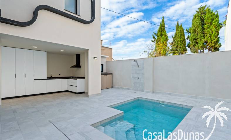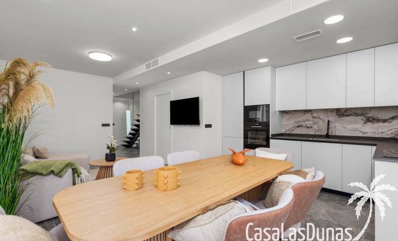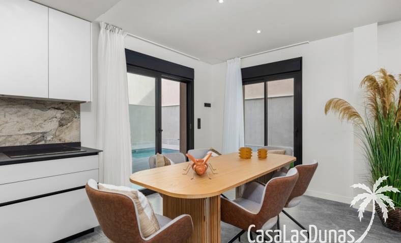 This East Facing, Four Bedroom, Renovated, Semi Detached Villa in Torre de la Horadada is located just a 3 minute walk to the beach, positioned one street behind the sea and promenade which leads you to the marina and a larger stretch of sandy coastline. Torre de la Horadada is a typically Spanish seaside town offering a variety of restaurants and café bars, while Pilar de la Horadada is just a couple of minutes’ drive away. Orihuela Costa, La Zenia Boulevard shopping centre, and several golf courses can all be reached in approximately 15 minutes. Recently renovated to a high standard with a unique and stylish design, this impressive 121m2 villa is set over two floors and even enjoys sea views. The property offers a bright open plan living space that flows seamlessly to the exterior, along with a well fitted modern kitchen. A hallway leads to the stairs for the first floor, while the ground floor also features a double bedroom with double sliding glazed doors out to the garden, and a contemporary shower room. On the first floor, there are three further double bedrooms, including a spacious master with dressing area and an en suite shower room featuring a double vanity. Bedroom four benefits from its own private terrace, and there is also an additional modern family shower room. The 45m2 private solarium is laid with artificial grass and includes a brick-built area with sink — ideal for outdoor entertaining. The garden is tiled and partly laid with artificial grass, and offers off road parking, a private swimming pool, outdoor shower, and an extensive covered kitchen/work area. Additional extras include ducted air conditioning, an irrigation system, and a store room. An exceptional, fully renovated villa in a prime coastal location, perfect for enjoying modern Mediterranean living on the Costa Blanca South.