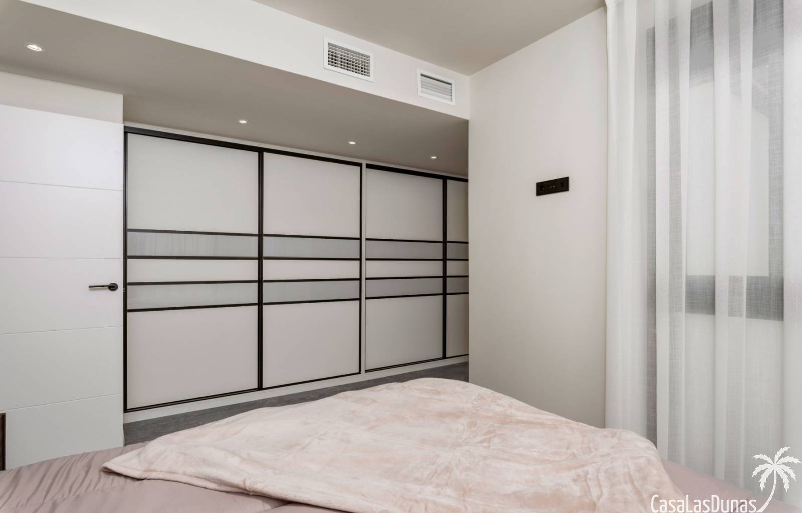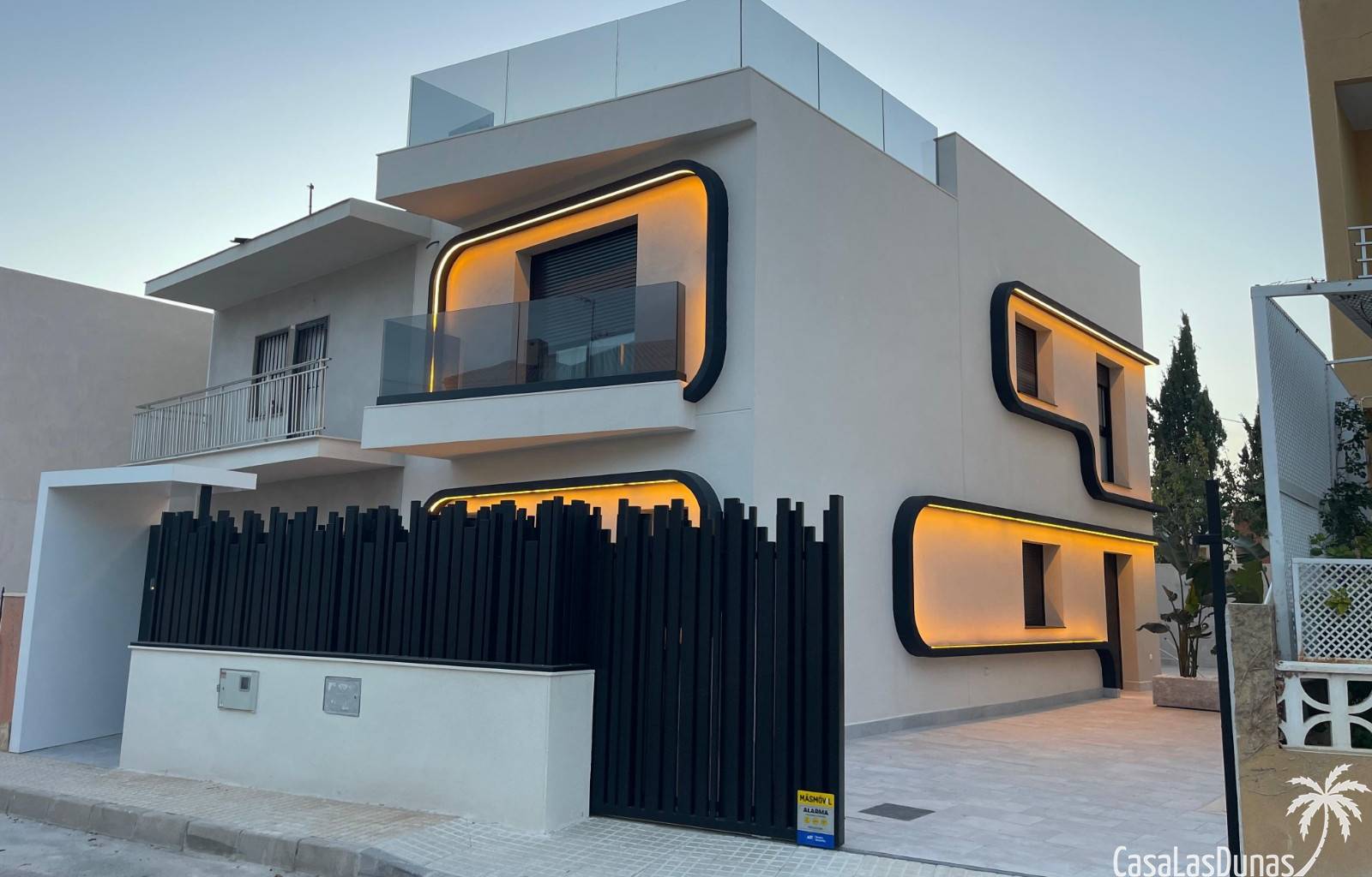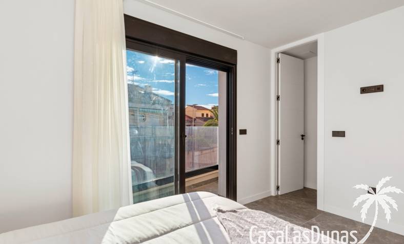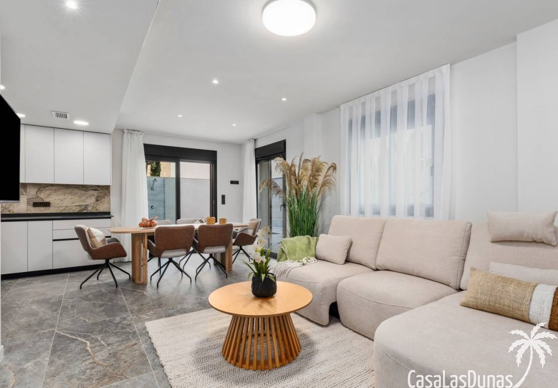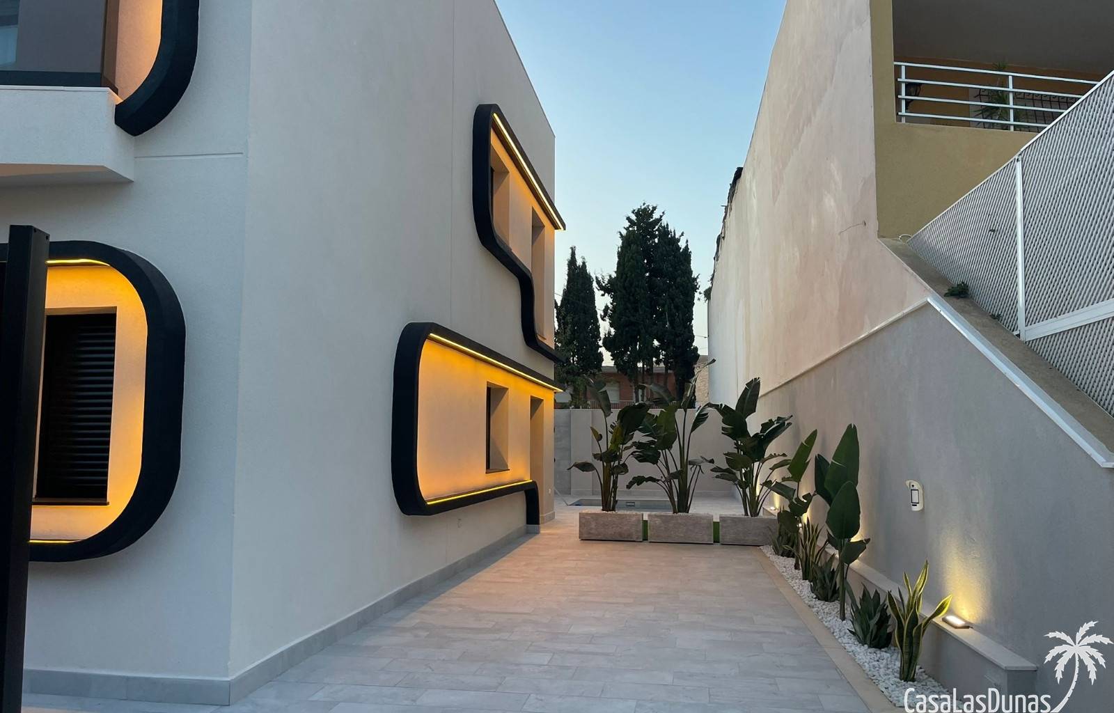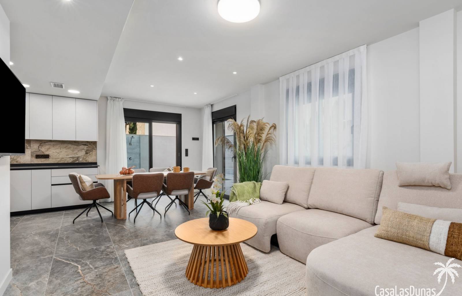 This East Facing, Four Bedroom, Renovated, Semi Detached Villa in Torre de la Horadada is located just a 3 minute walk to the beach, positioned one street behind the sea and promenade which leads you to the marina and a larger stretch of sandy coastline. Torre de la Horadada is a typically Spanish seaside town offering a variety of restaurants and café bars, while Pilar de la Horadada is just a couple of minutes’ drive away. Orihuela Costa, La Zenia Boulevard shopping centre, and several golf courses can all be reached in approximately 15 minutes. Recently renovated to a high standard with a unique and stylish design, this impressive 121m2 villa is set over two floors and even enjoys sea views. The property offers a bright open plan living space that flows seamlessly to the exterior, along with a well fitted modern kitchen. A hallway leads to the stairs for the first floor, while the ground floor also features a double bedroom with double sliding glazed doors out to the garden, and a contemporary shower room. On the first floor, there are three further double bedrooms, including a spacious master with dressing area and an en suite shower room featuring a double vanity. Bedroom four benefits from its own private terrace, and there is also an additional modern family shower room. The 45m2 private solarium is laid with artificial grass and includes a brick-built area with sink — ideal for outdoor entertaining. The garden is tiled and partly laid with artificial grass, and offers off road parking, a private swimming pool, outdoor shower, and an extensive covered kitchen/work area. Additional extras include ducted air conditioning, an irrigation system, and a store room. An exceptional, fully renovated villa in a prime coastal location, perfect for enjoying modern Mediterranean living on the Costa Blanca South.