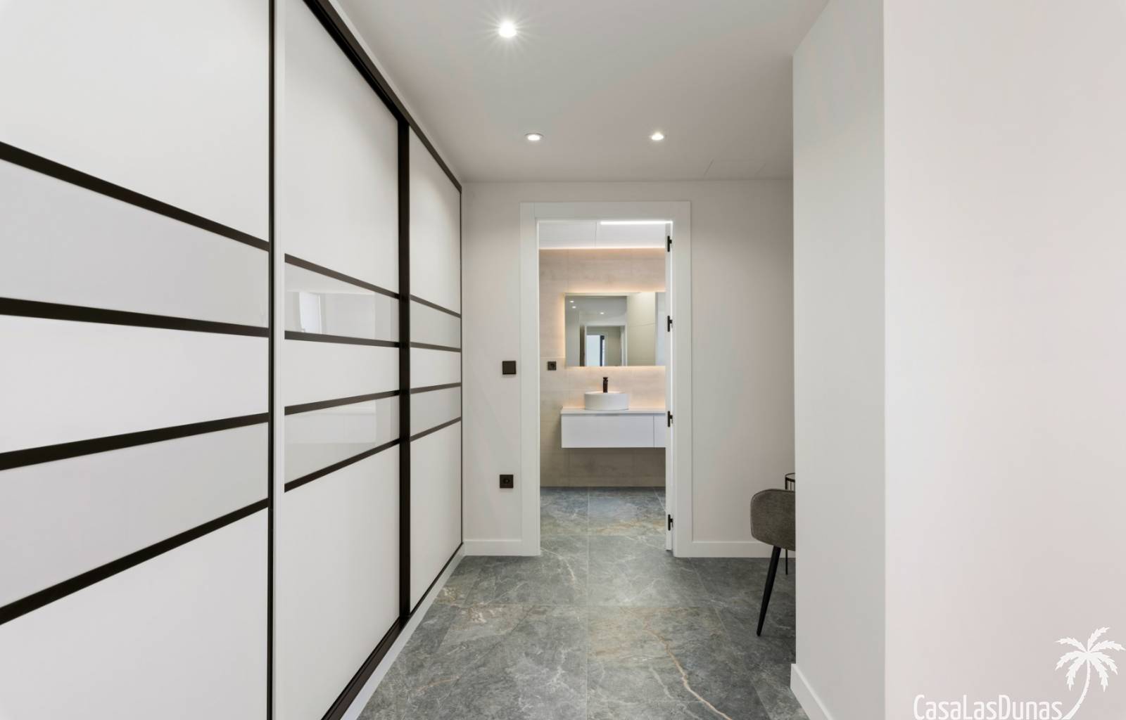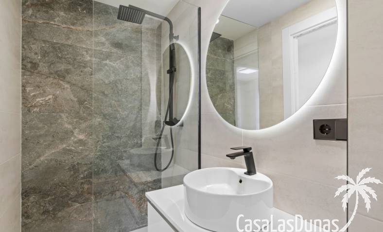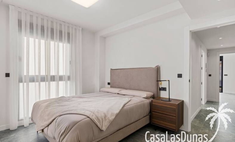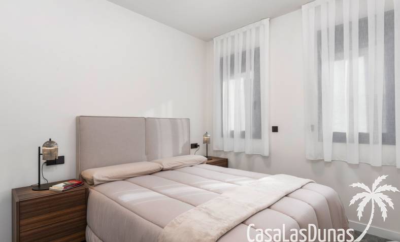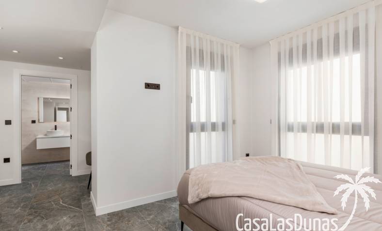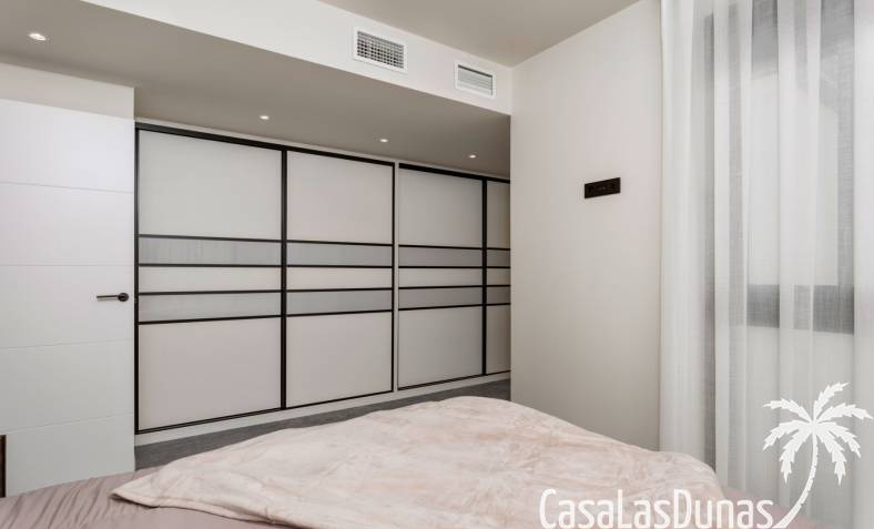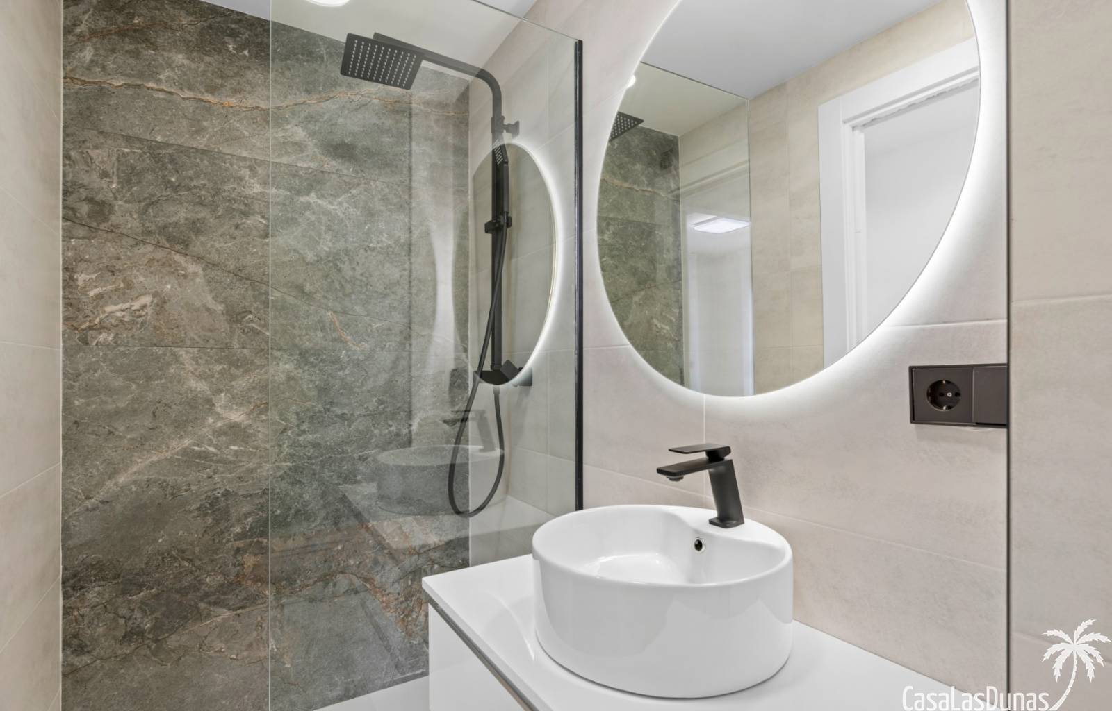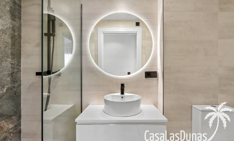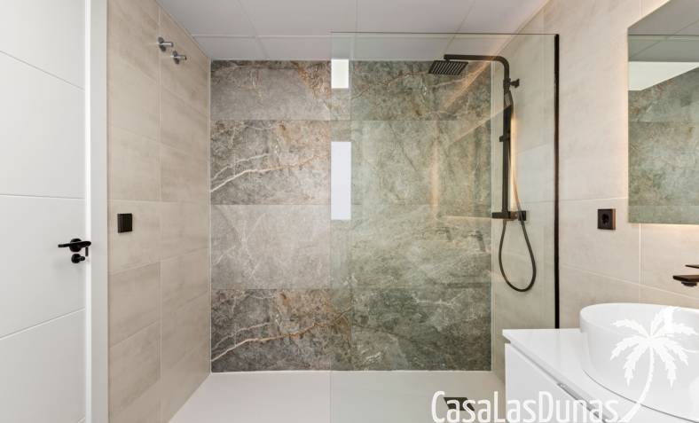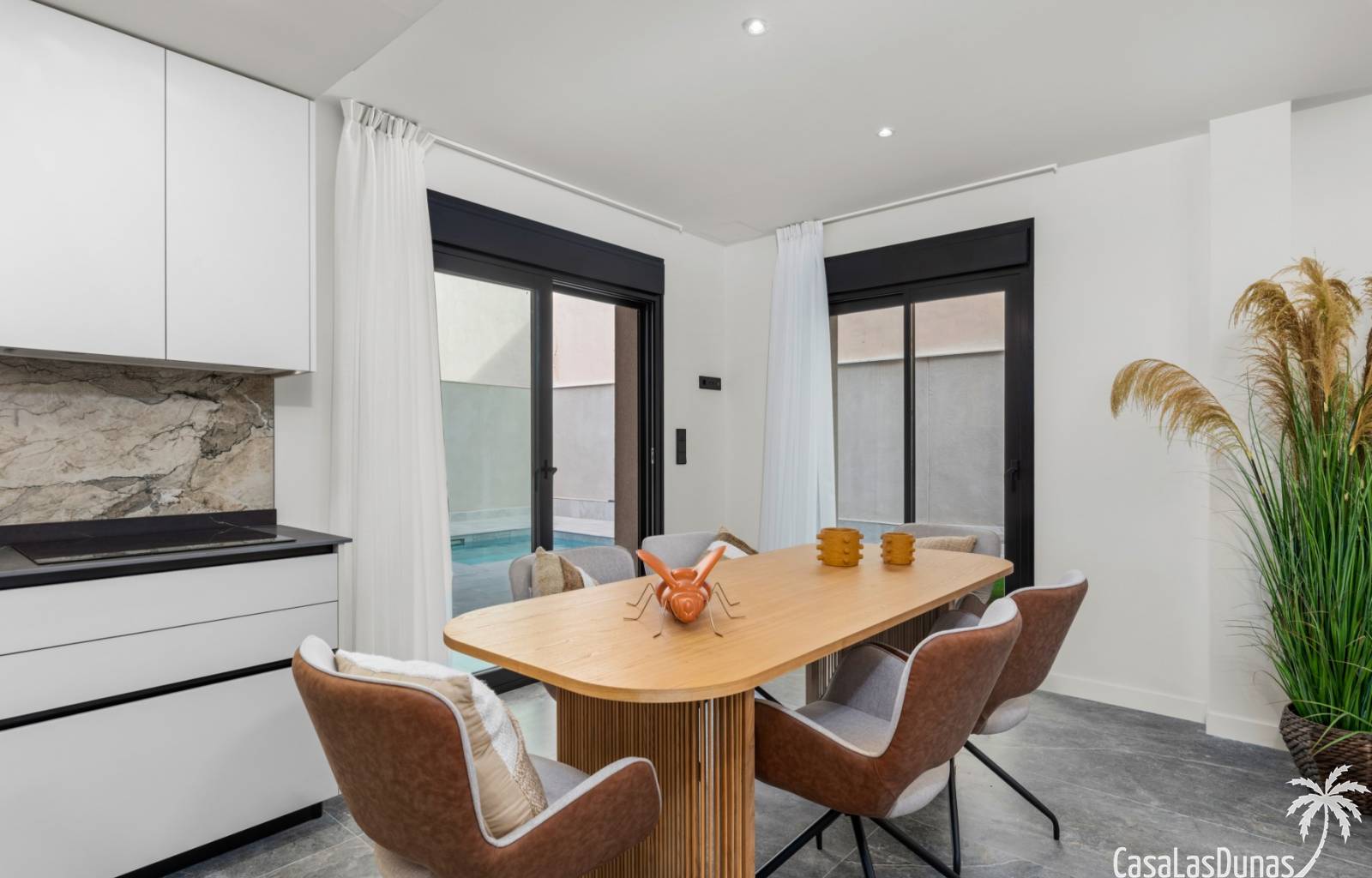 This East Facing, Four Bedroom, Renovated, Semi Detached Villa in Torre de la Horadada is located just a 3 minute walk to the beach, positioned one street behind the sea and promenade which leads you to the marina and a larger stretch of sandy coastline. Torre de la Horadada is a typically Spanish seaside town offering a variety of restaurants and café bars, while Pilar de la Horadada is just a couple of minutes’ drive away. Orihuela Costa, La Zenia Boulevard shopping centre, and several golf courses can all be reached in approximately 15 minutes. Recently renovated to a high standard with a unique and stylish design, this impressive 121m2 villa is set over two floors and even enjoys sea views. The property offers a bright open plan living space that flows seamlessly to the exterior, along with a well fitted modern kitchen. A hallway leads to the stairs for the first floor, while the ground floor also features a double bedroom with double sliding glazed doors out to the garden, and a contemporary shower room. On the first floor, there are three further double bedrooms, including a spacious master with dressing area and an en suite shower room featuring a double vanity. Bedroom four benefits from its own private terrace, and there is also an additional modern family shower room. The 45m2 private solarium is laid with artificial grass and includes a brick-built area with sink — ideal for outdoor entertaining. The garden is tiled and partly laid with artificial grass, and offers off road parking, a private swimming pool, outdoor shower, and an extensive covered kitchen/work area. Additional extras include ducted air conditioning, an irrigation system, and a store room. An exceptional, fully renovated villa in a prime coastal location, perfect for enjoying modern Mediterranean living on the Costa Blanca South.
