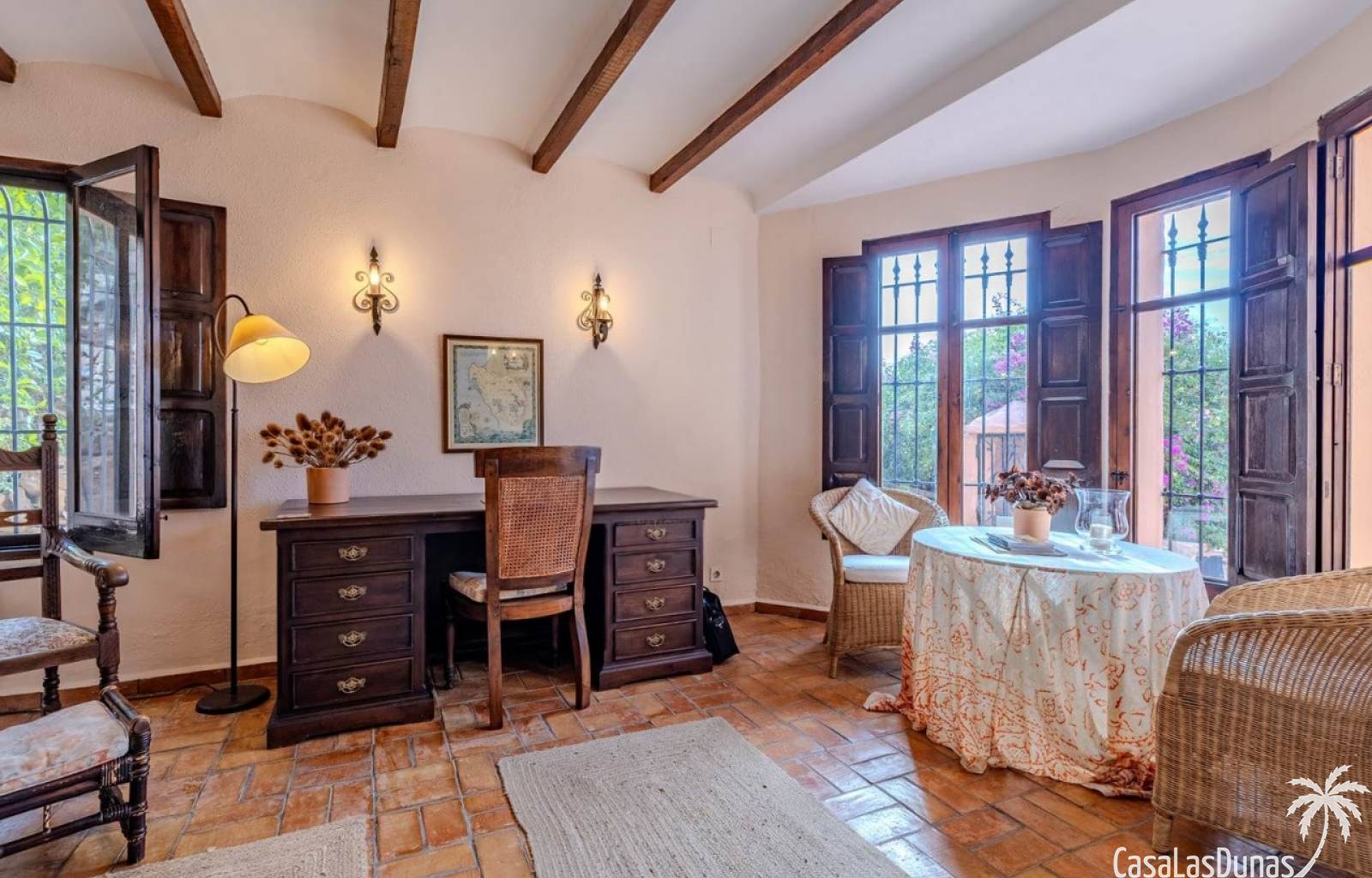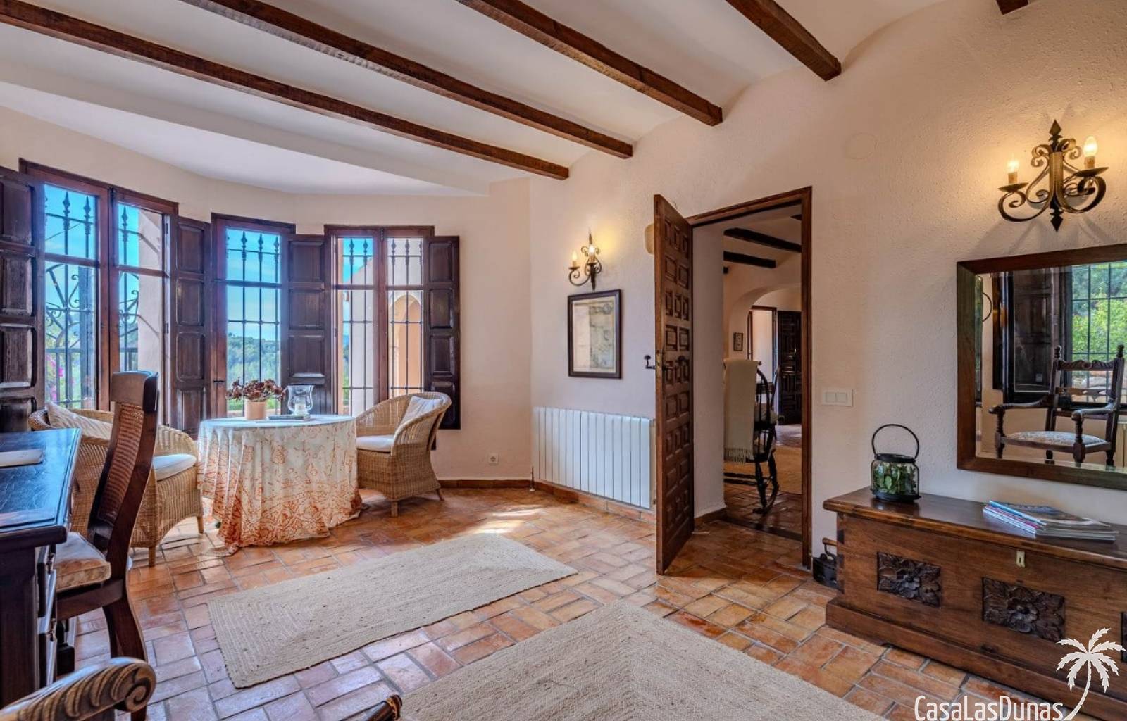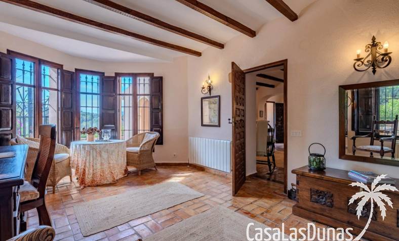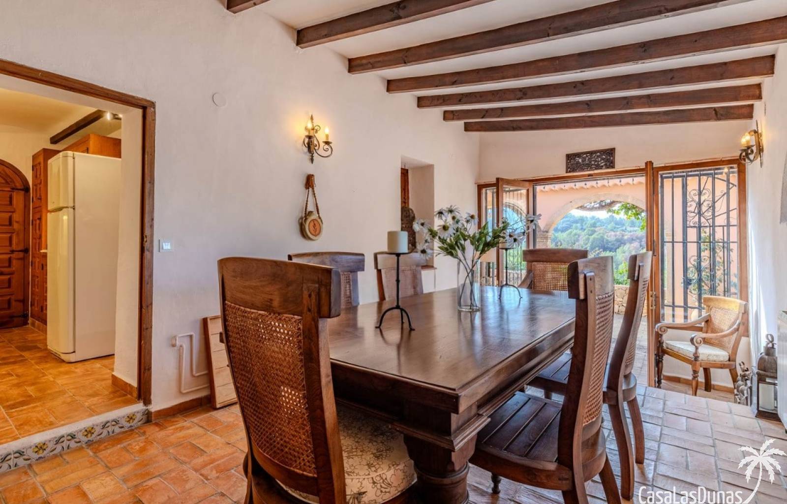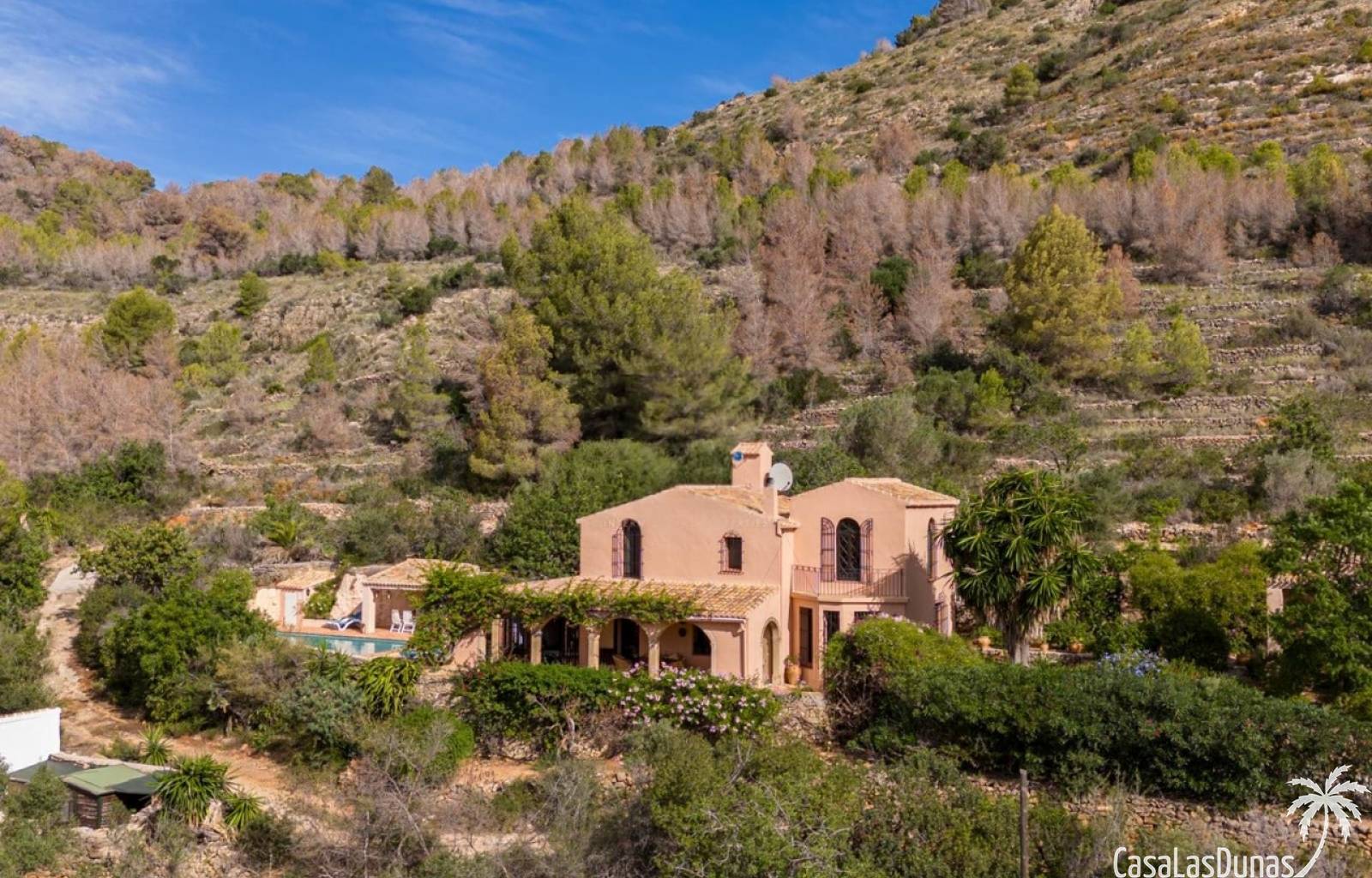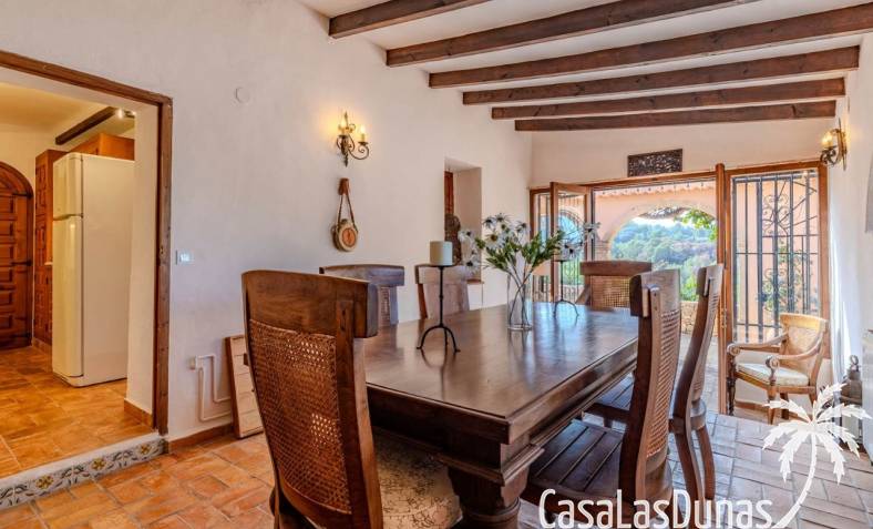 Esta encantadora y característica finca se encuentra en el Parque Natural del Montgó, a poca distancia de Jesús Pobre. Esta casa de campo tradicional irradia elegancia rústica con baldosas de terracota hechas a mano y techos con vigas auténticas. A la llegada, un camino privado conduce más allá de un encantador pozo de agua hasta la aislada terraza naya de seis arcos. Este hermoso espacio, totalmente orientado al sur, ofrece un lugar sombreado en verano y un lugar soleado y acogedor en invierno, perfecto para disfrutar de las hermosas vistas al campo. El cálido interior de la casa comienza en el acogedor salón con una chimenea tradicional, al que se accede fácilmente a través de la naya. Adyacente hay una cocina totalmente equipada con un comedor separado que se conecta perfectamente con las terrazas, ideal para cenar al aire libre y entretenerse. También en la planta baja hay una habitación con ducha y una amplia y luminosa estancia que puede servir como dormitorio, despacho o segundo salón. Una llamativa escalera nos lleva al primer piso, donde se encuentra el espacioso dormitorio principal. Este lujoso refugio cuenta con altos techos abovedados, grandes ventanas personalizadas y un balcón francés. El conjunto es luminoso y ofrece vistas panorámicas al campo. El baño principal tiene dos lavabos, bañera y ducha. Dos dormitorios adicionales comparten un baño familiar con una elegante ducha. Todos los dormitorios han sido equipados recientemente con aire acondicionado frío-calor. El exterior de la propiedad es igualmente impresionante, con una gran piscina de 12x5m, rodeada de una amplia terraza, y una terraza cubierta con vistas a la piscina.