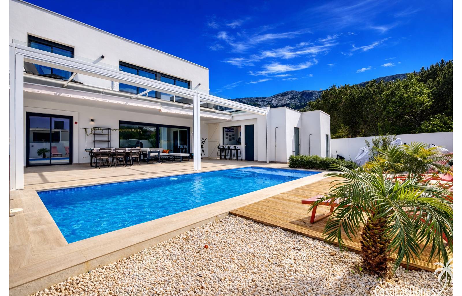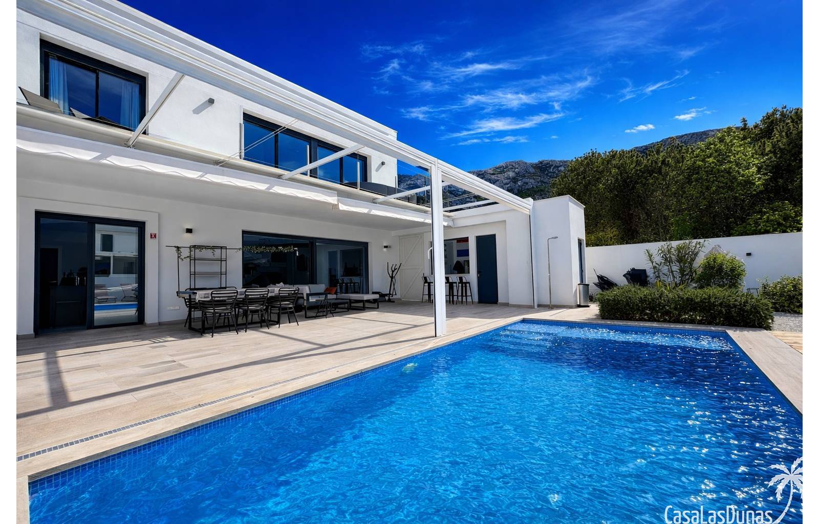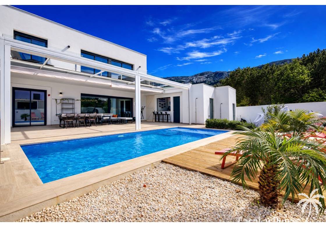 Esta villa de diseño moderno fue construida en 2022 en una parcela completamente plana a poca distancia del bullicioso centro de Denia. La casa tiene un amplio salón / comedor en la planta baja con cocina abierta y grandes puertas corredizas de vidrio hacia la terraza de la piscina. En este nivel también hay un aseo de invitados, un amplio lavadero/trastero y una gran terraza cubierta y cocina exterior con barra. Una moderna escalera desde el salón conduce a la planta superior donde hay 3 dormitorios y 2 baños (dormitorio principal con baño en suite) y también una gran terraza con hermosas vistas al Montgó y al pueblo y al castillo de Denia.