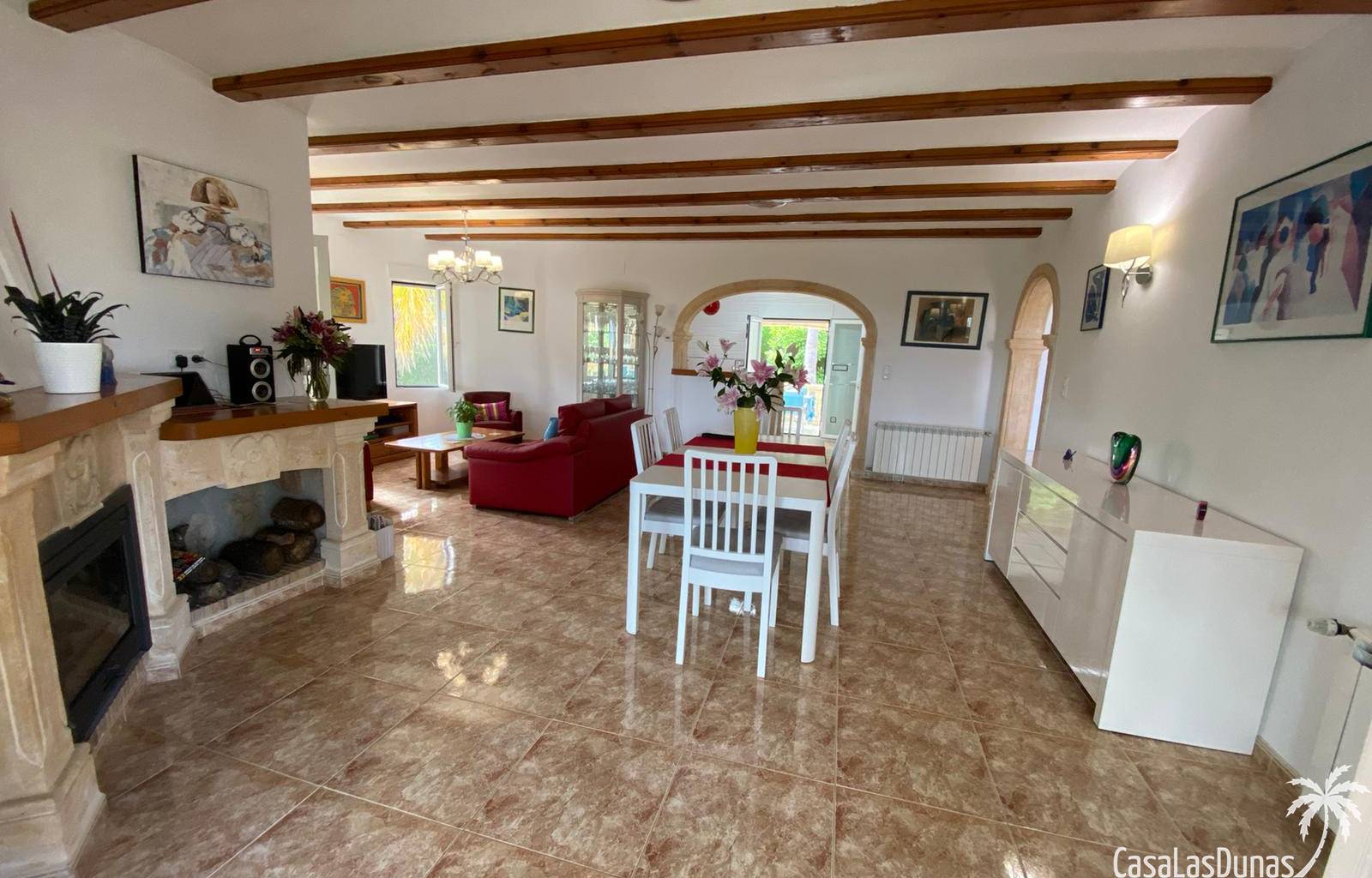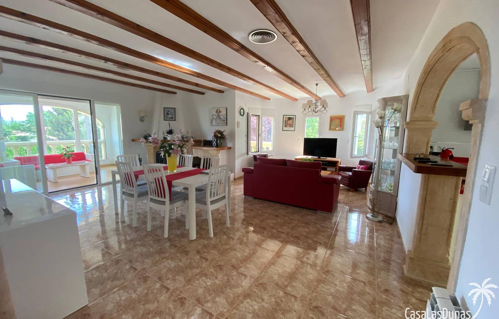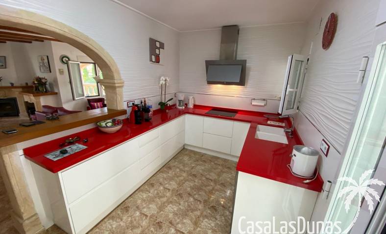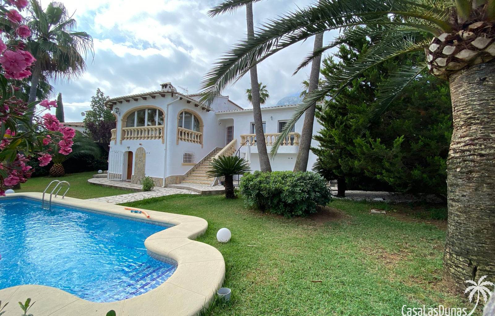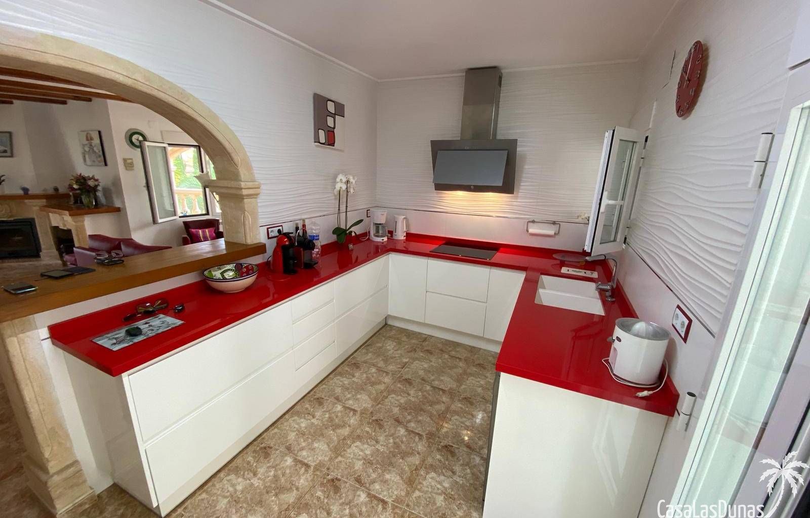 Esta encantadora villa se encuentra en una tranquila zona residencial a poca distancia del centro de Denia y fue construida en 1996 y renovada en 2015. La propiedad tiene una residencia principal en el piso superior y una casa de invitados en la planta baja con garaje independiente y trastero. La casa principal ofrece un amplio salón-comedor con chimenea y cocina abierta, dos terrazas cubiertas y una terraza acristalada, que puede servir perfectamente como segundo comedor. En este nivel hay 3 dormitorios y 2 baños. El apartamento de invitados en la planta baja ofrece una sala de estar, cocina, dos dormitorios, un baño privado con ducha y sauna y un baño con bañera separada. La casa está rodeada de un hermoso jardín con piscina privada, solárium y cocina exterior.