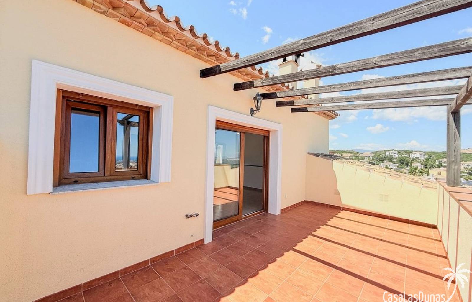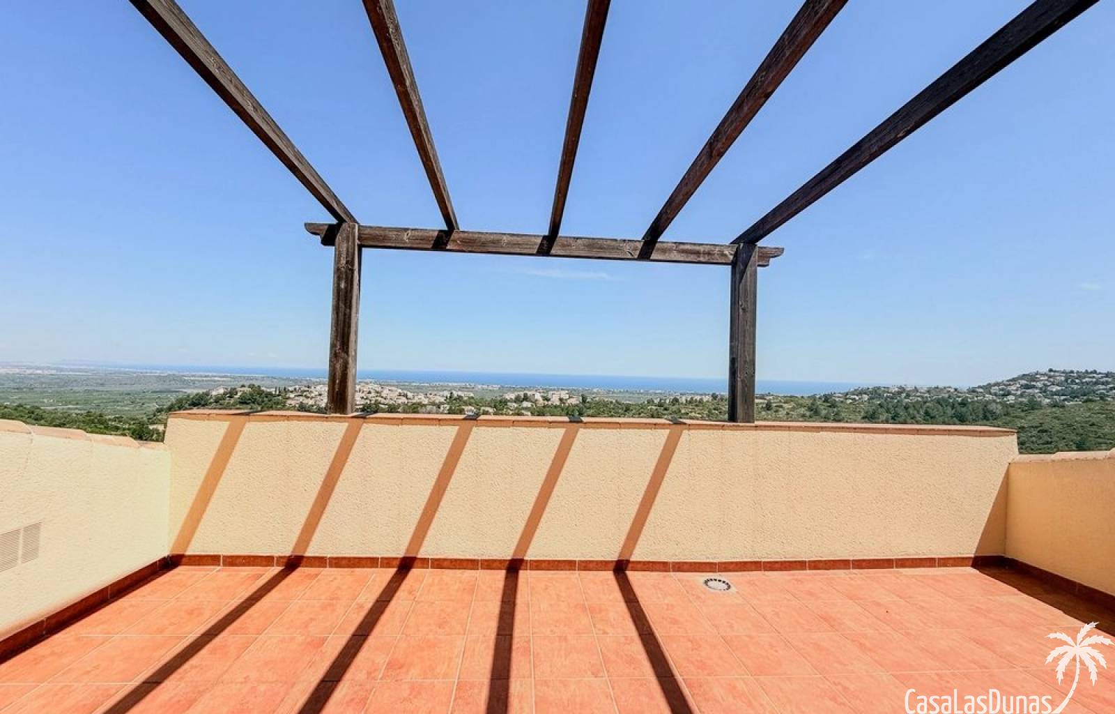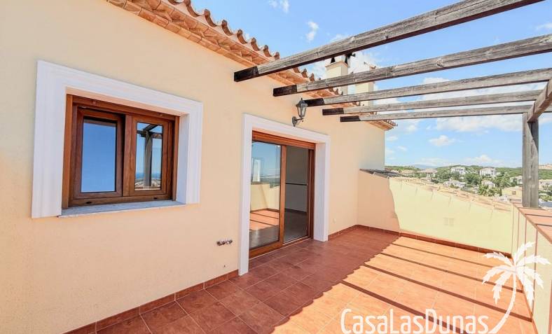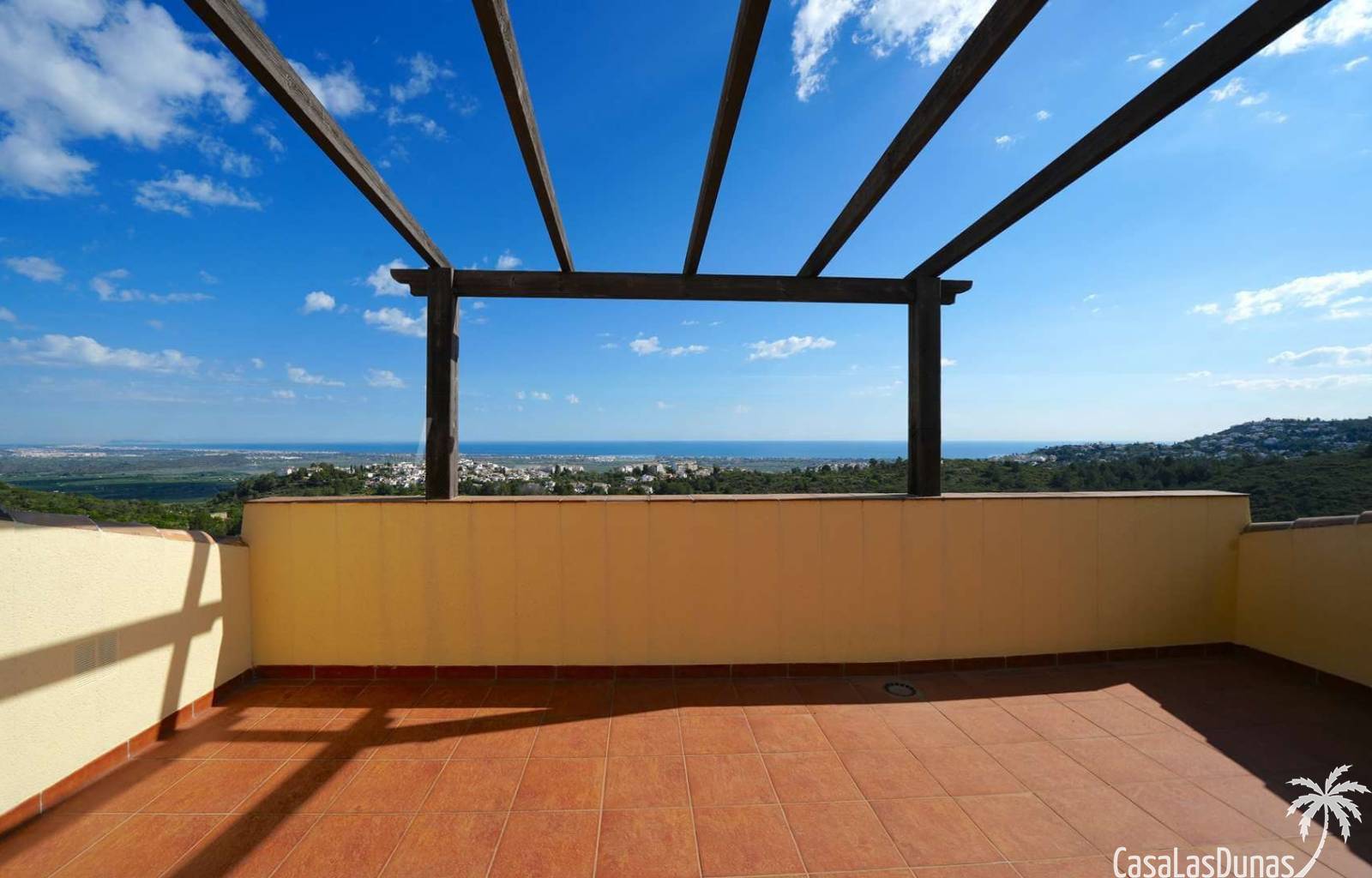 Esta hermosa casa esquinera se distribuye en dos plantas y está ubicada en un pequeño complejo de 16 casas que ofrecen vistas panorámicas sobre la costa de Denia. En la planta superior se encuentra un amplio y luminoso salón-comedor con una acogedora chimenea, una cocina abierta y acceso a una amplia terraza con vistas al mar. En esta planta también hay un lavadero con espacio para la lavadora. En la planta inferior hay 3 amplios dormitorios y 2 baños (dormitorio principal con baño en suite). Hay una plaza de aparcamiento privado y acceso a una hermosa piscina con una amplia terraza y vistas panorámicas al mar.