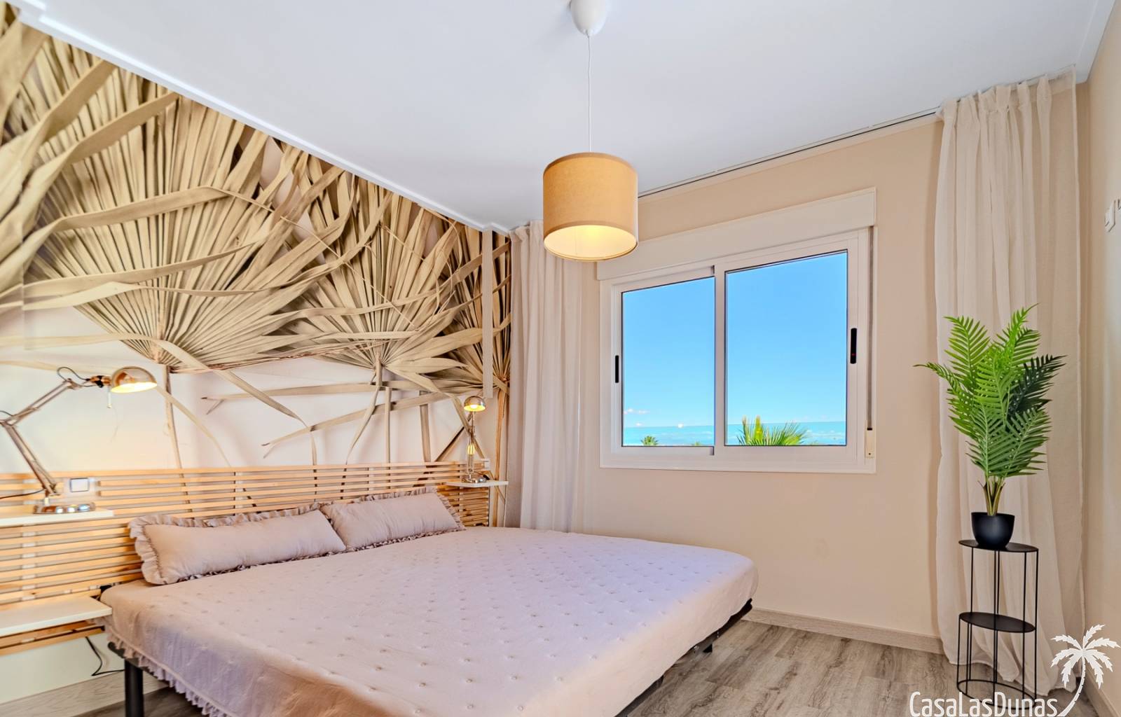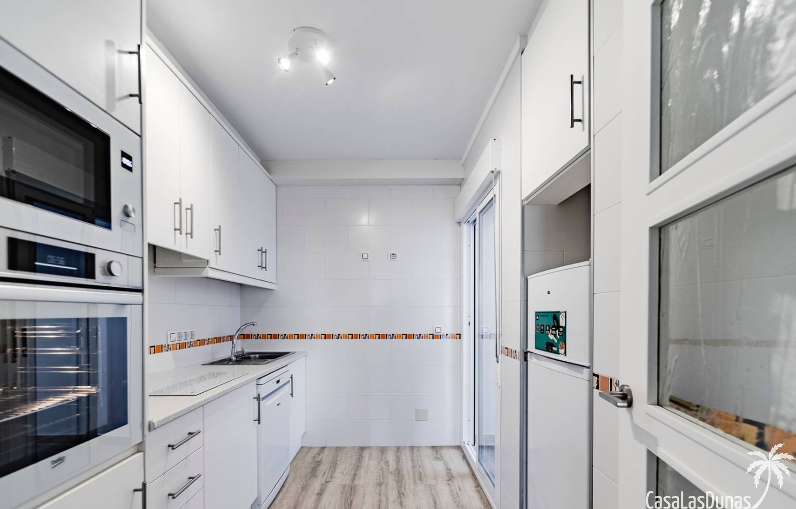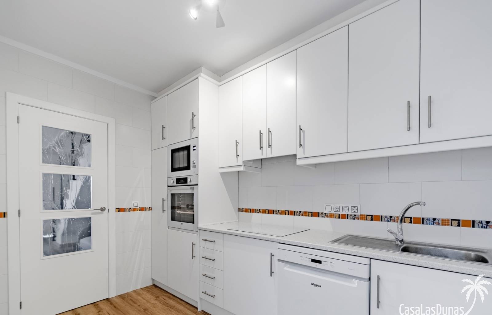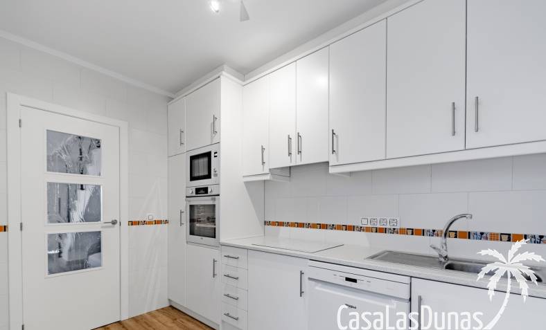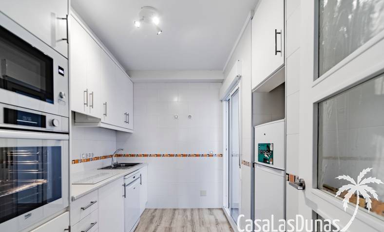 La cocina es independiente y está completamente equipada con electrodomésticos modernos. Cuenta con tres dormitorios con armarios empotrados, uno de ellos con acceso a un balcón con vistas a la piscina comunitaria. También dispone de dos baños.