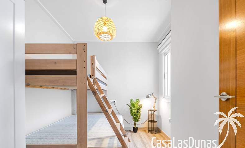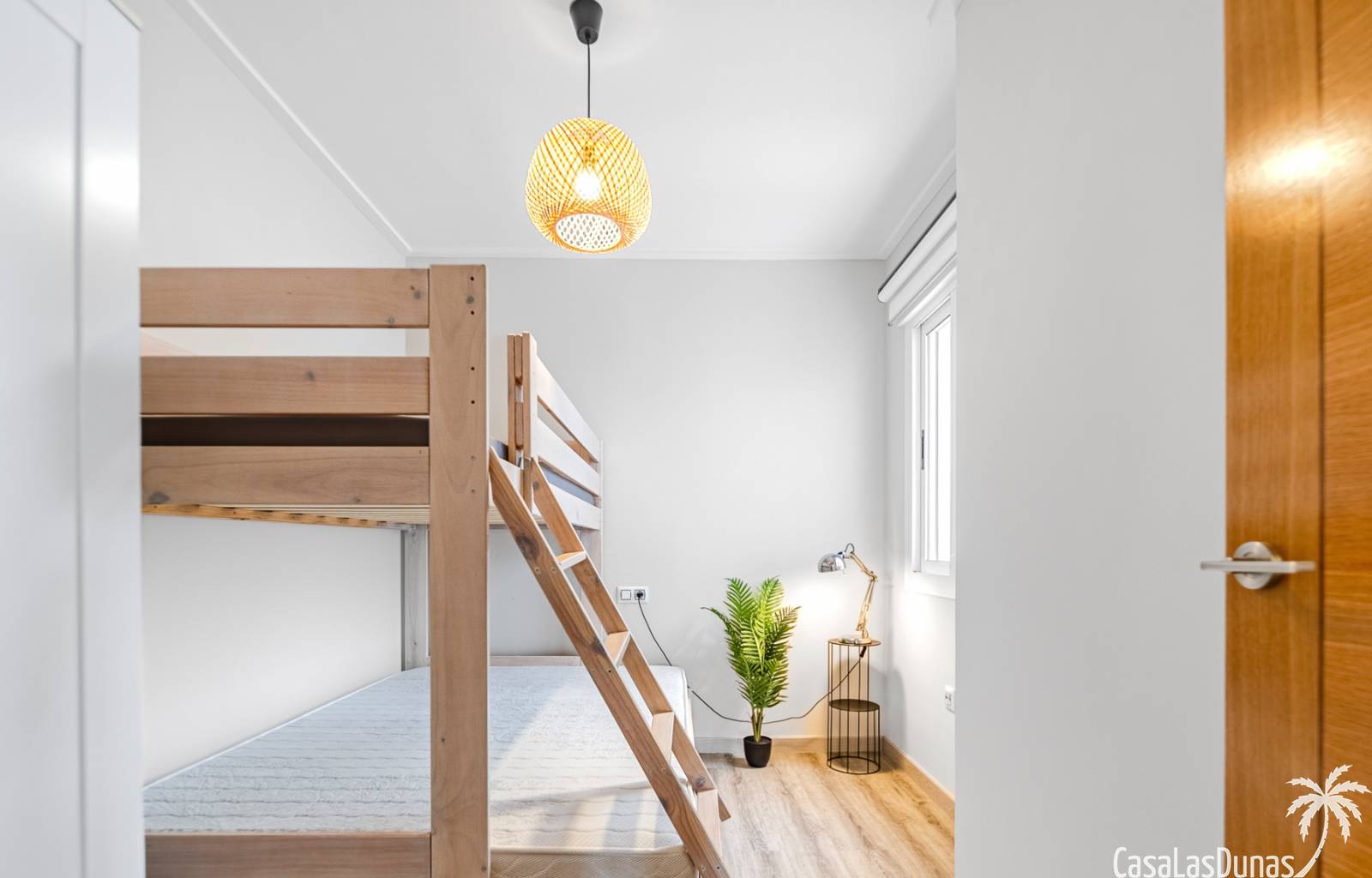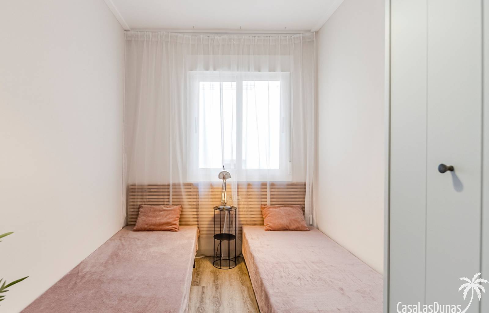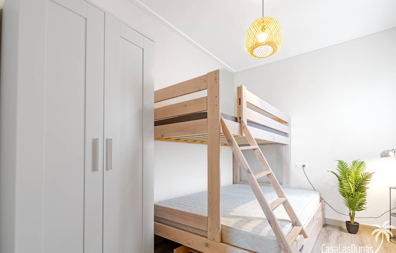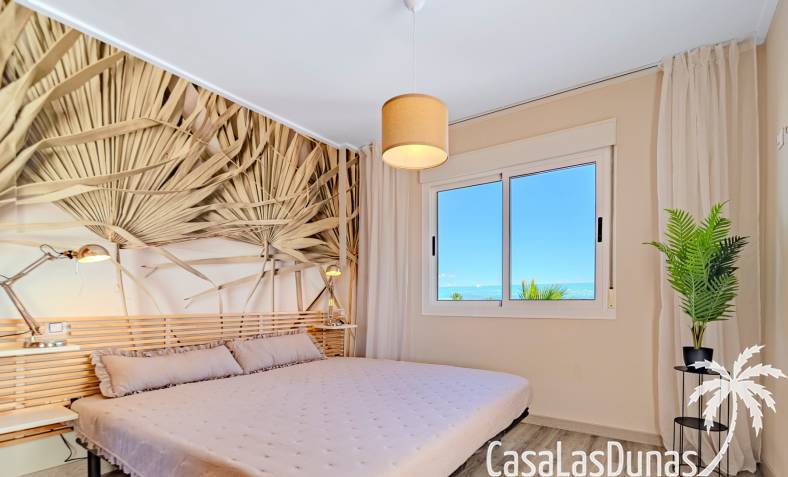 La cocina es independiente y está completamente equipada con electrodomésticos modernos. Cuenta con tres dormitorios con armarios empotrados, uno de ellos con acceso a un balcón con vistas a la piscina comunitaria. También dispone de dos baños.