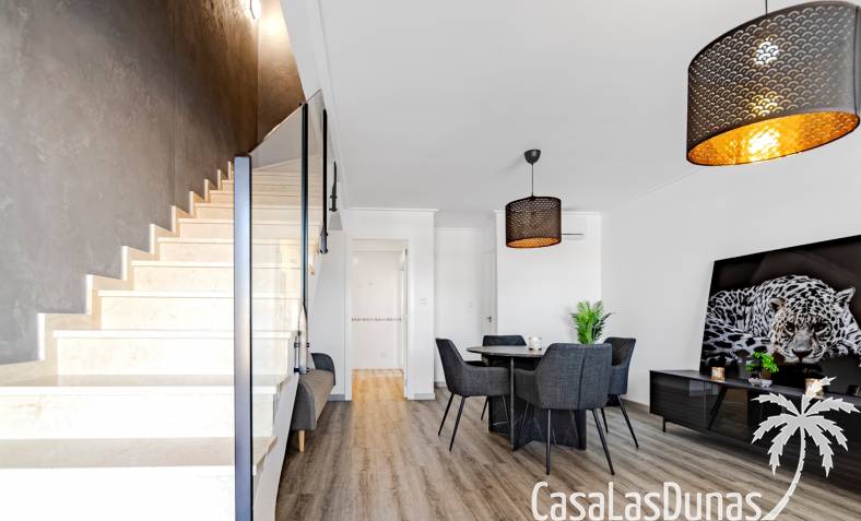 Esta casa adosada está ubicada en la zona de Los Balcones, dentro del residencial Los Altos de la Laguna en Torrevieja. La propiedad ofrece vistas al Lago Rosa y cuenta con un espacio funcional.