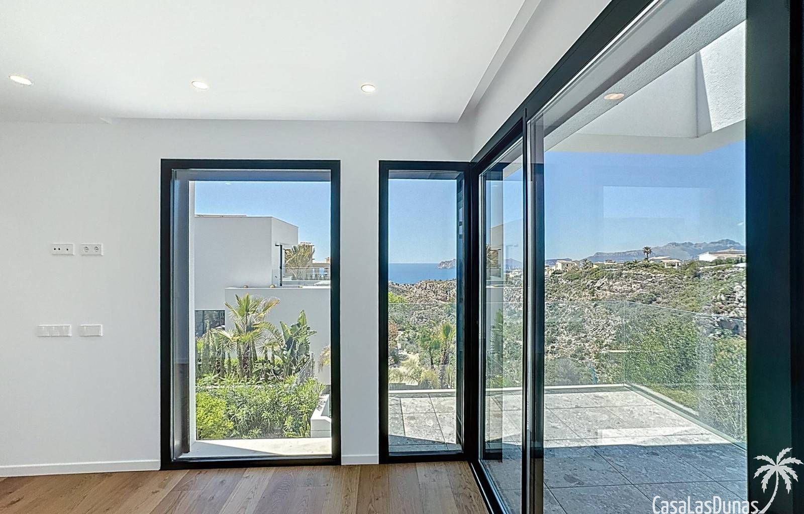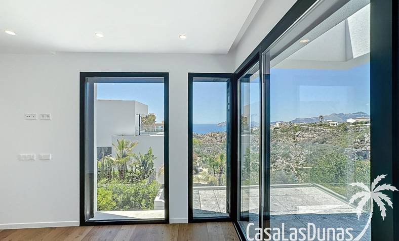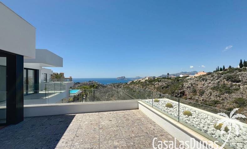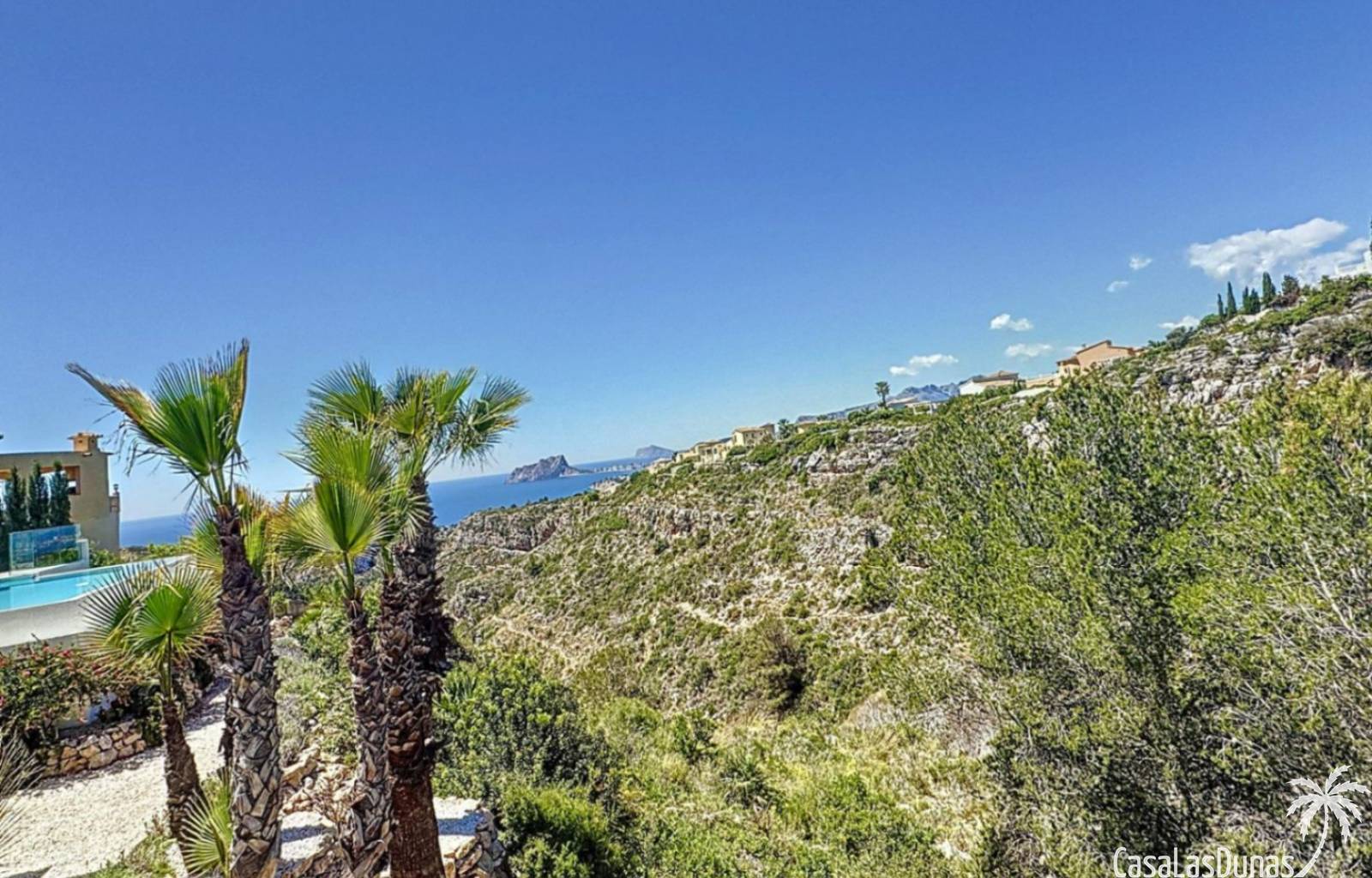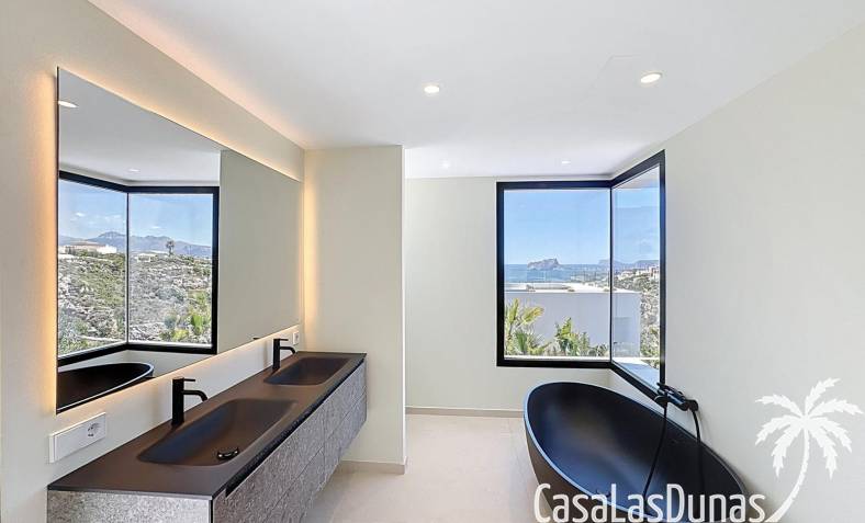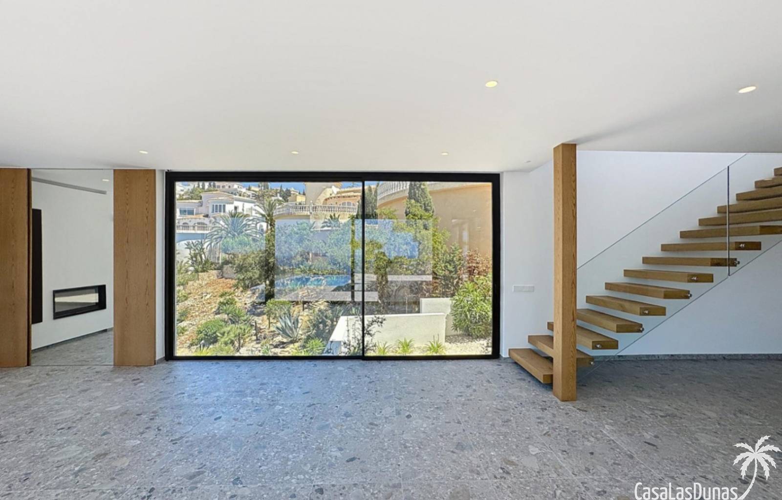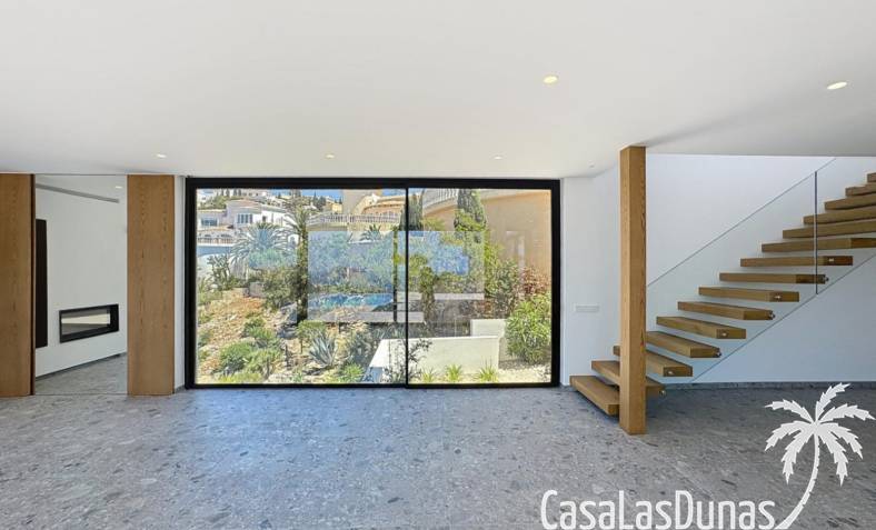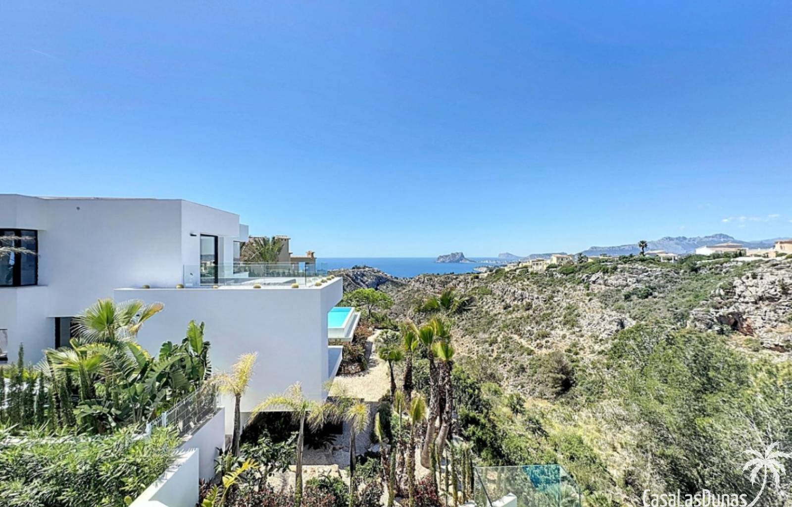 Esta elegante y moderna villa se sitúa en una parcela con orientación suroeste en Cumbre, con impresionantes vistas al mar y al Peñón de Ifach. La casa cuenta con 240 m² de superficie habitable, un sótano de 45 m², un lavadero de 4 m² y 153 m² de terrazas exteriores, ideales para disfrutar del clima mediterráneo y las vistas panorámicas. La villa cuenta con tres dormitorios dobles, todos con armarios empotrados o vestidores y baño privado, lo que garantiza comodidad y privacidad. Dos de los dormitorios tienen terraza privada con vistas al mar. Una elegante escalera interior conduce a la planta baja, donde encontramos un amplio salón-comedor con chimenea, una moderna cocina americana con zona de comedor, un aseo de invitados y un lavadero independiente. Tanto el salón como la cocina ofrecen acceso directo a la terraza con piscina privada, un lugar perfecto para relajarse o recibir invitados mientras disfruta de las impresionantes vistas al mar Mediterráneo.