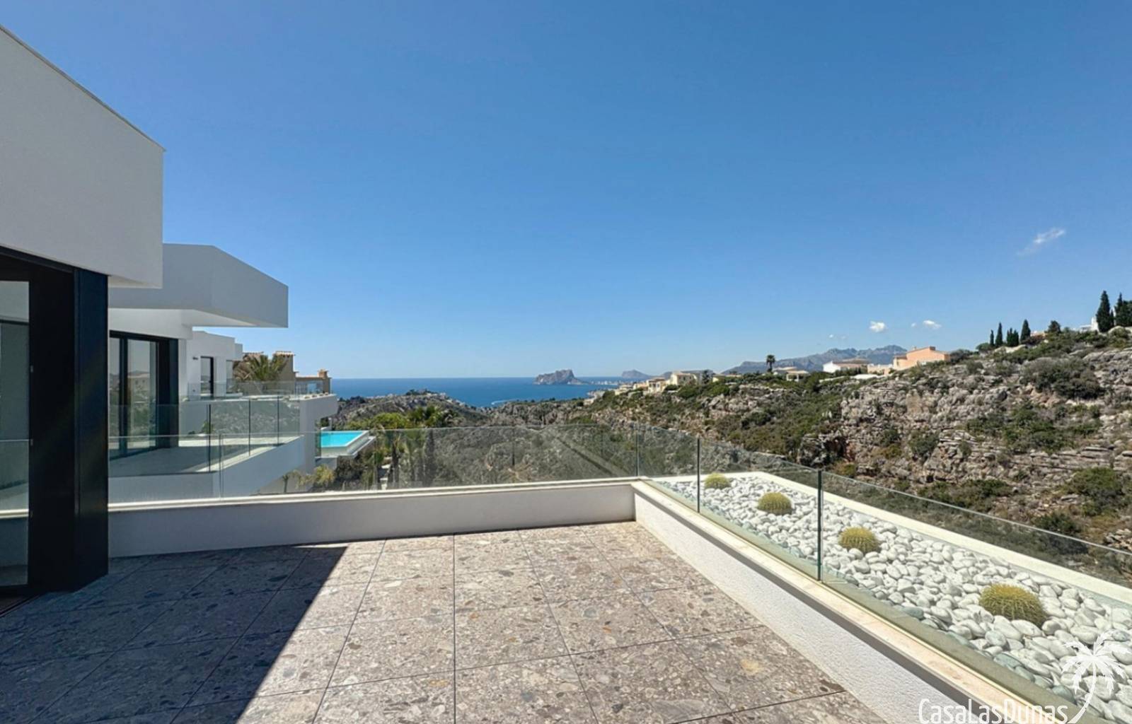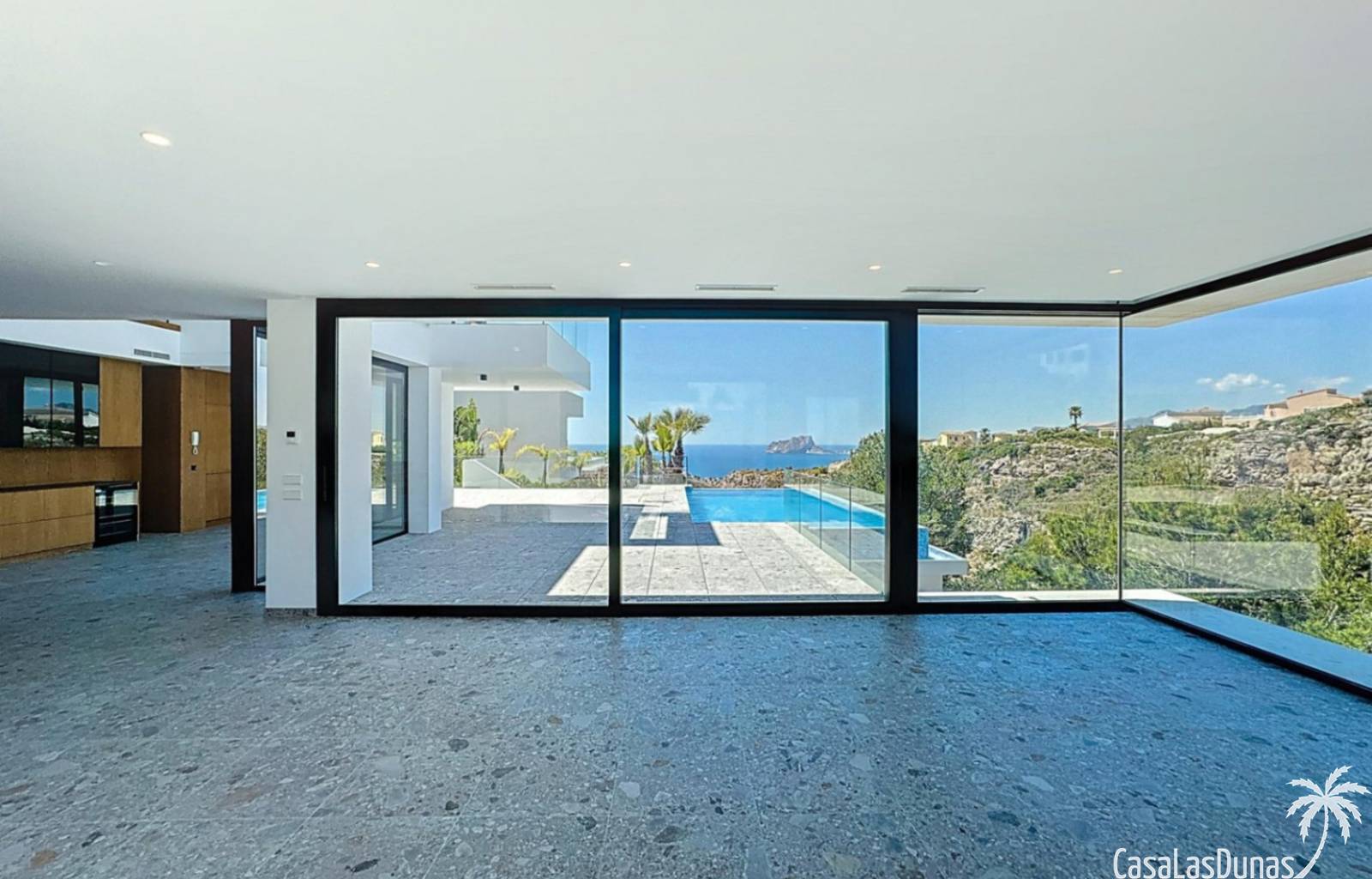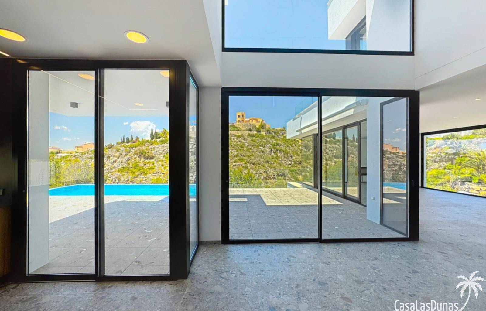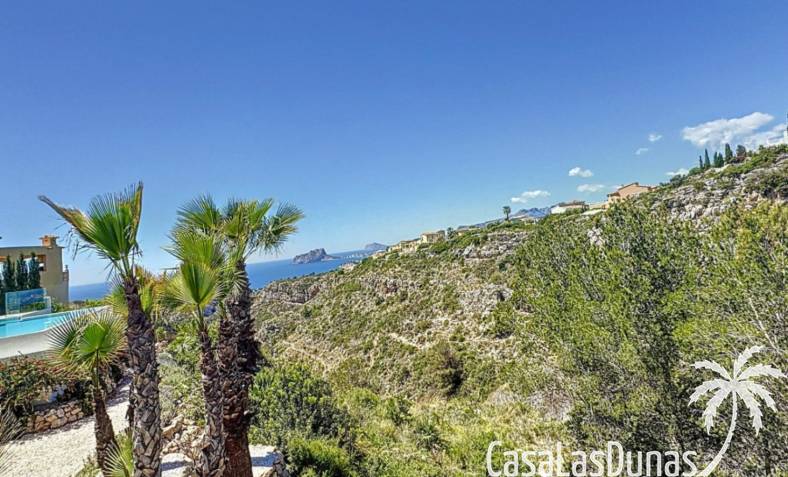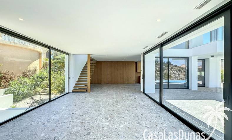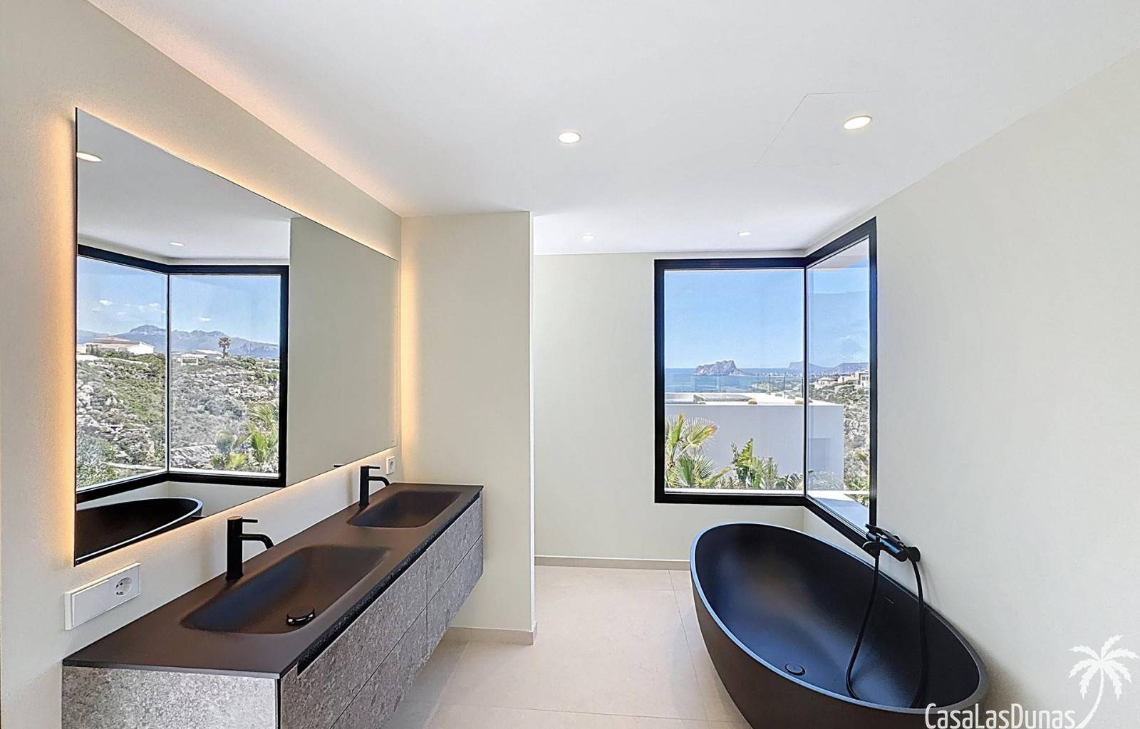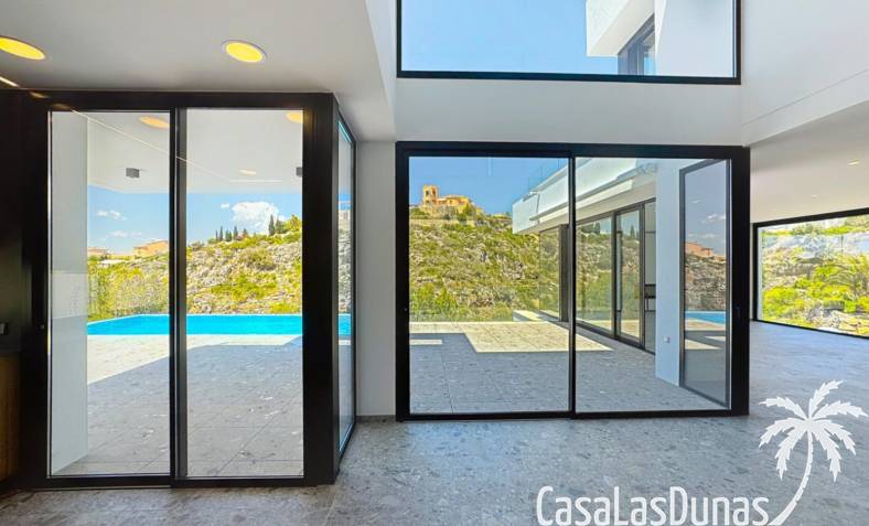 Esta elegante y moderna villa se sitúa en una parcela con orientación suroeste en Cumbre, con impresionantes vistas al mar y al Peñón de Ifach. La casa cuenta con 240 m² de superficie habitable, un sótano de 45 m², un lavadero de 4 m² y 153 m² de terrazas exteriores, ideales para disfrutar del clima mediterráneo y las vistas panorámicas. La villa cuenta con tres dormitorios dobles, todos con armarios empotrados o vestidores y baño privado, lo que garantiza comodidad y privacidad. Dos de los dormitorios tienen terraza privada con vistas al mar. Una elegante escalera interior conduce a la planta baja, donde encontramos un amplio salón-comedor con chimenea, una moderna cocina americana con zona de comedor, un aseo de invitados y un lavadero independiente. Tanto el salón como la cocina ofrecen acceso directo a la terraza con piscina privada, un lugar perfecto para relajarse o recibir invitados mientras disfruta de las impresionantes vistas al mar Mediterráneo.