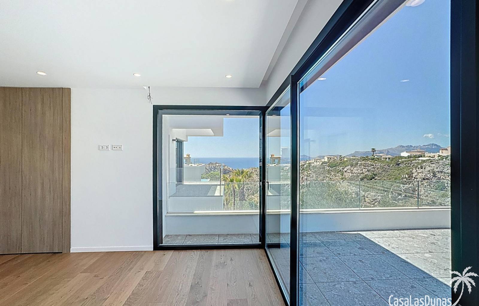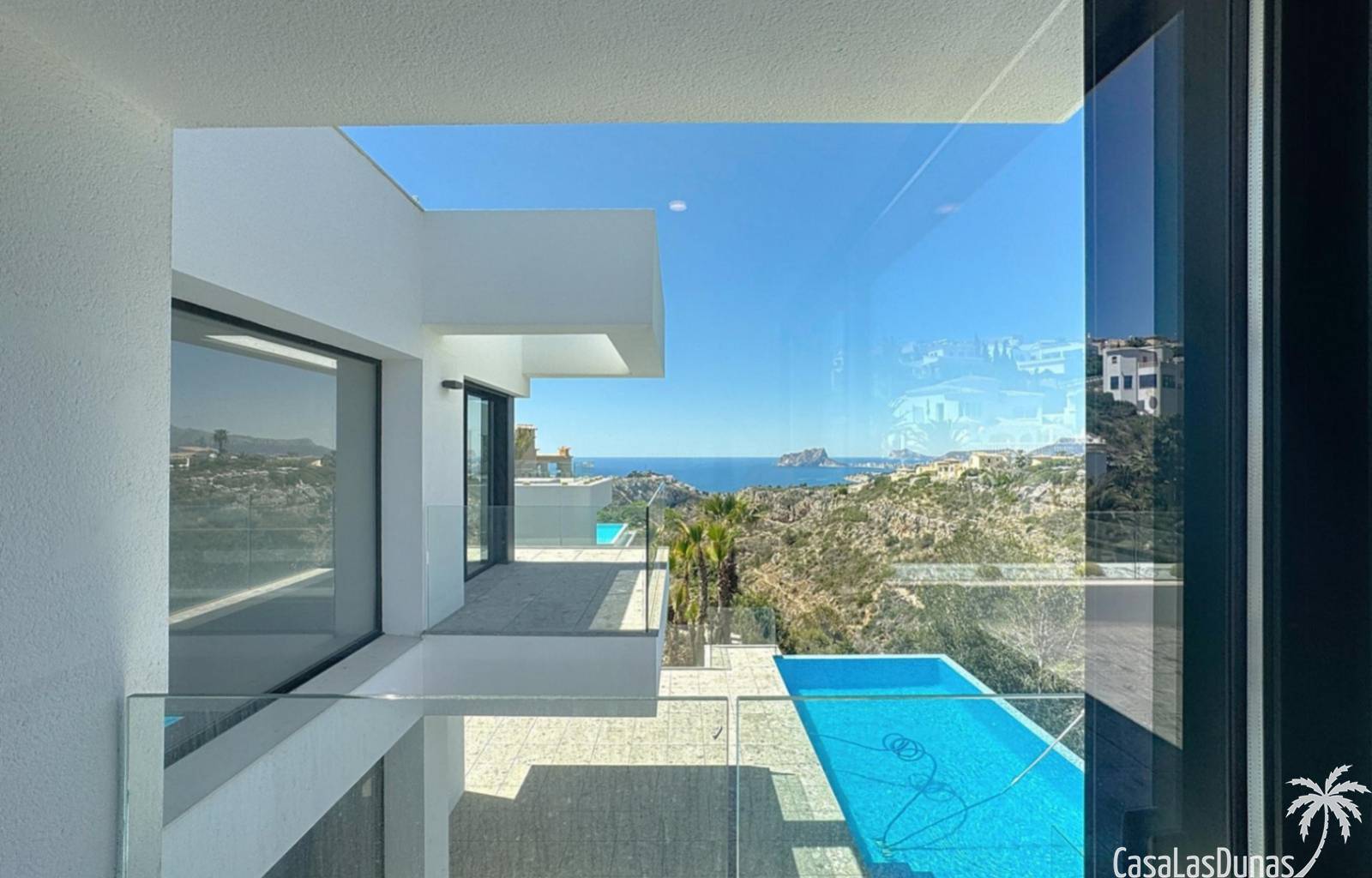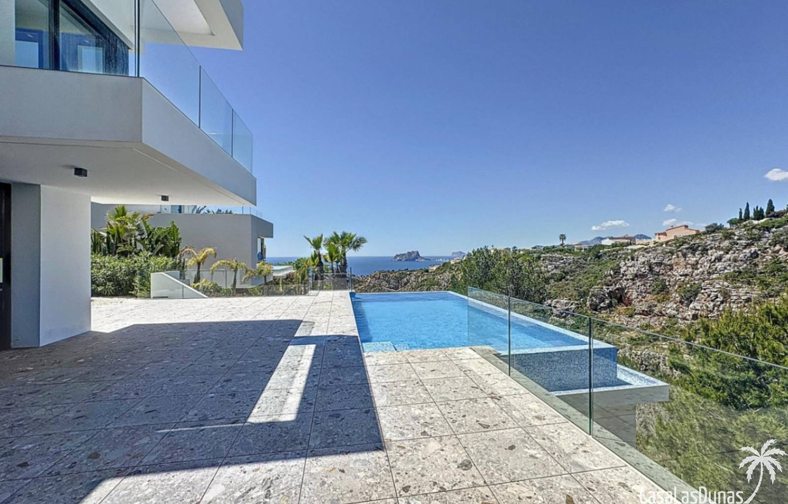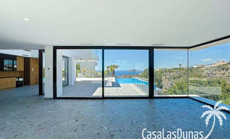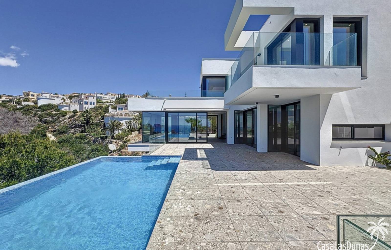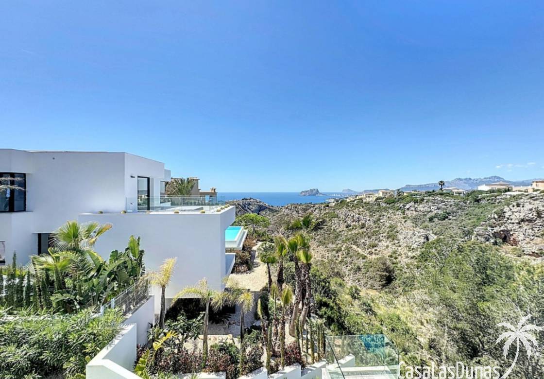 Esta elegante y moderna villa se sitúa en una parcela con orientación suroeste en Cumbre, con impresionantes vistas al mar y al Peñón de Ifach. La casa cuenta con 240 m² de superficie habitable, un sótano de 45 m², un lavadero de 4 m² y 153 m² de terrazas exteriores, ideales para disfrutar del clima mediterráneo y las vistas panorámicas. La villa cuenta con tres dormitorios dobles, todos con armarios empotrados o vestidores y baño privado, lo que garantiza comodidad y privacidad. Dos de los dormitorios tienen terraza privada con vistas al mar. Una elegante escalera interior conduce a la planta baja, donde encontramos un amplio salón-comedor con chimenea, una moderna cocina americana con zona de comedor, un aseo de invitados y un lavadero independiente. Tanto el salón como la cocina ofrecen acceso directo a la terraza con piscina privada, un lugar perfecto para relajarse o recibir invitados mientras disfruta de las impresionantes vistas al mar Mediterráneo.