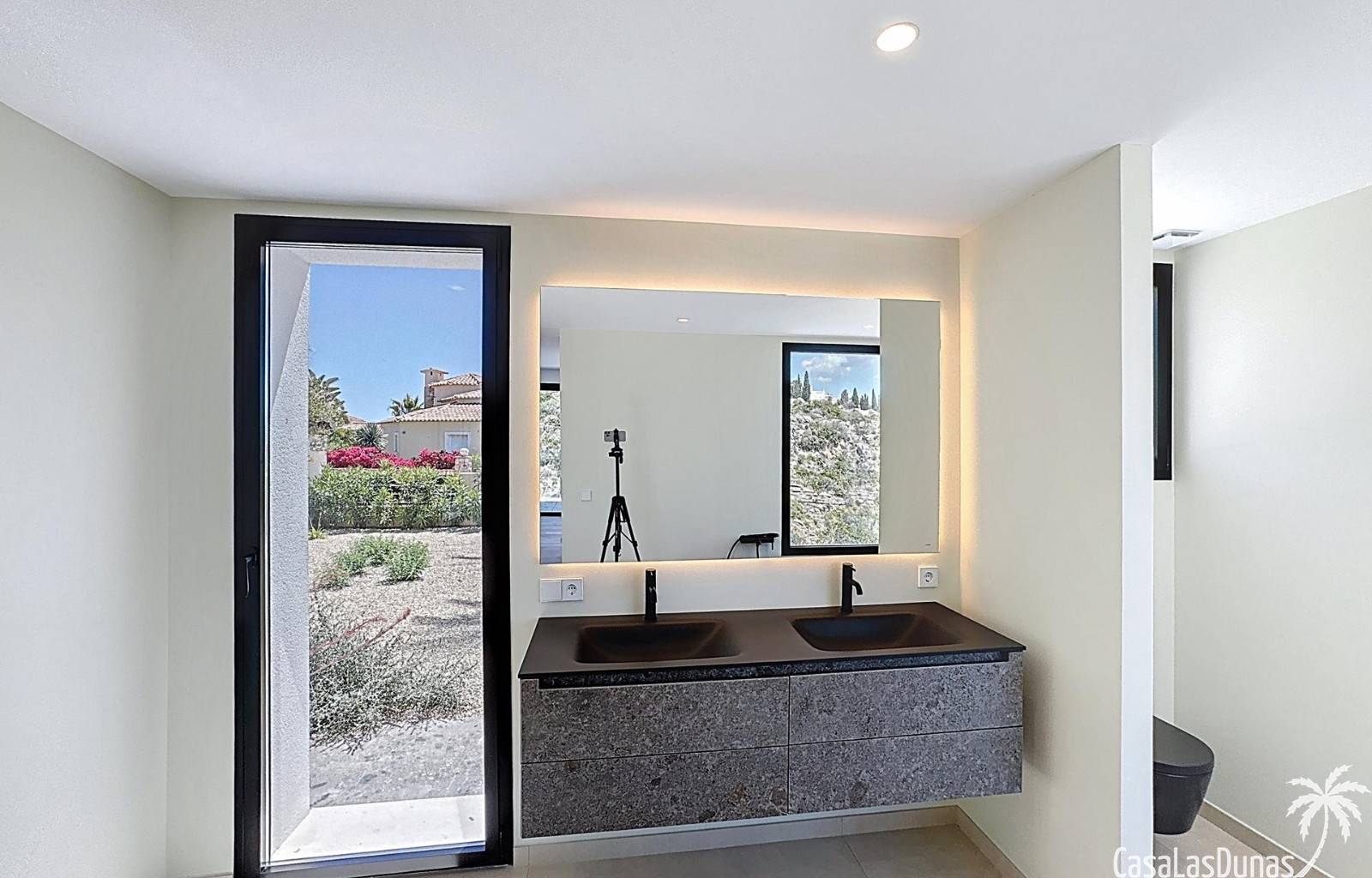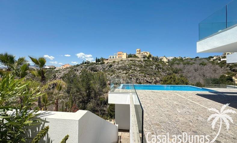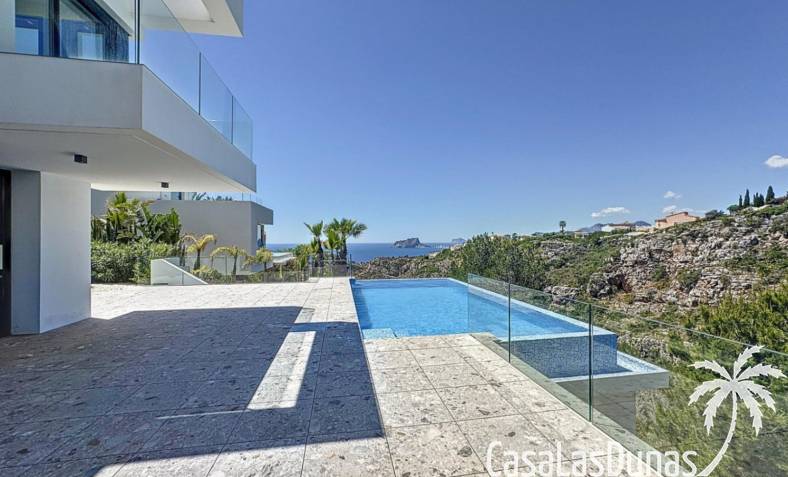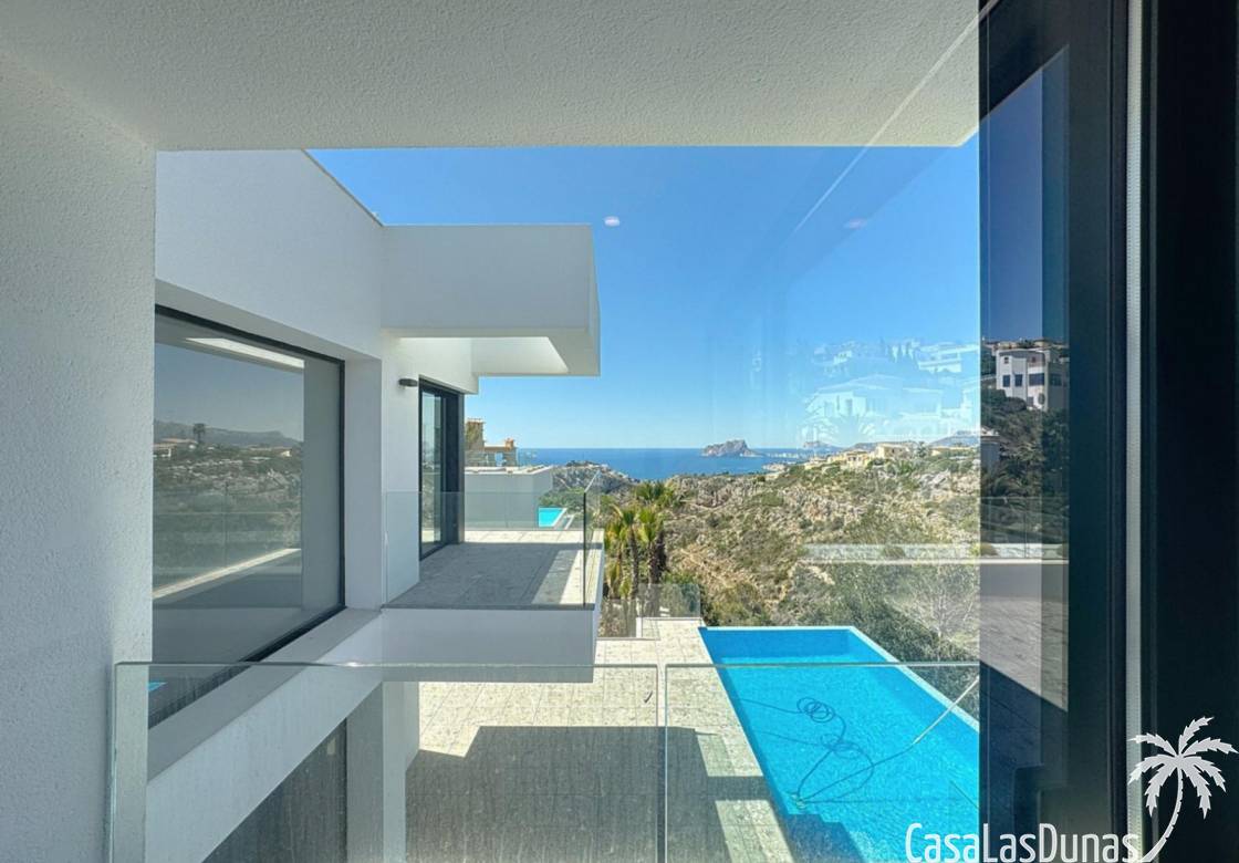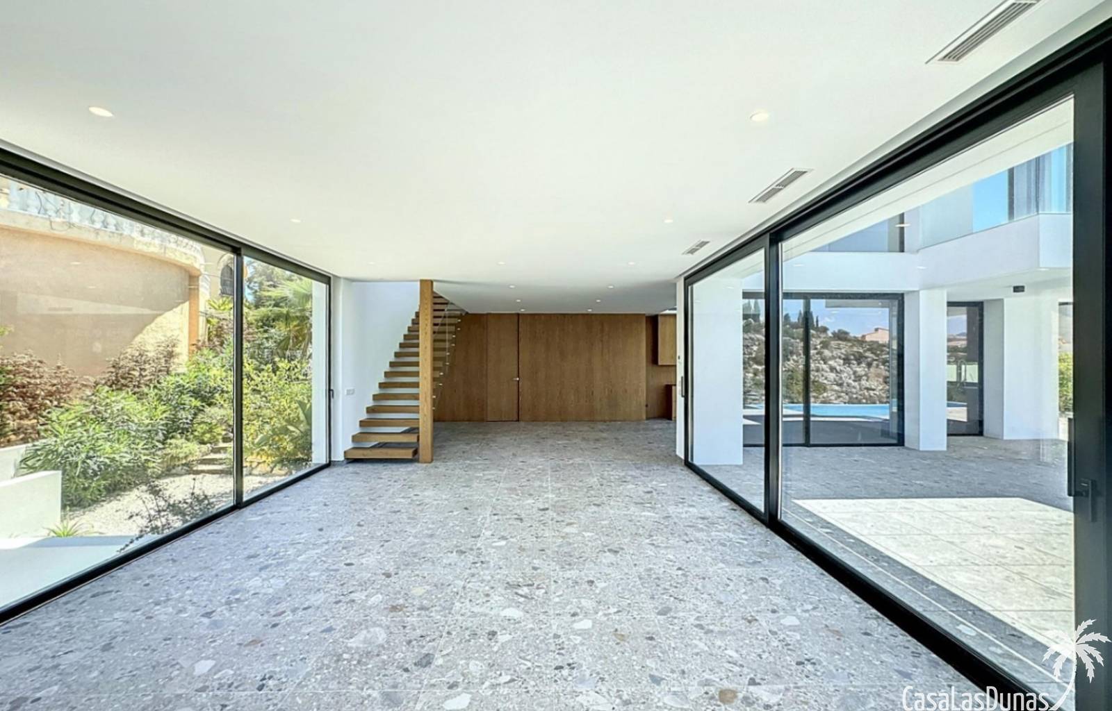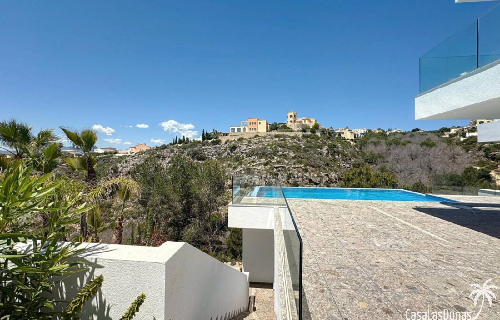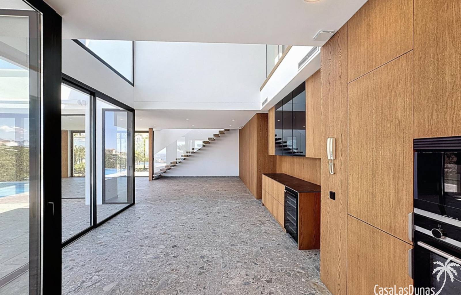 Esta elegante y moderna villa se sitúa en una parcela con orientación suroeste en Cumbre, con impresionantes vistas al mar y al Peñón de Ifach. La casa cuenta con 240 m² de superficie habitable, un sótano de 45 m², un lavadero de 4 m² y 153 m² de terrazas exteriores, ideales para disfrutar del clima mediterráneo y las vistas panorámicas. La villa cuenta con tres dormitorios dobles, todos con armarios empotrados o vestidores y baño privado, lo que garantiza comodidad y privacidad. Dos de los dormitorios tienen terraza privada con vistas al mar. Una elegante escalera interior conduce a la planta baja, donde encontramos un amplio salón-comedor con chimenea, una moderna cocina americana con zona de comedor, un aseo de invitados y un lavadero independiente. Tanto el salón como la cocina ofrecen acceso directo a la terraza con piscina privada, un lugar perfecto para relajarse o recibir invitados mientras disfruta de las impresionantes vistas al mar Mediterráneo.