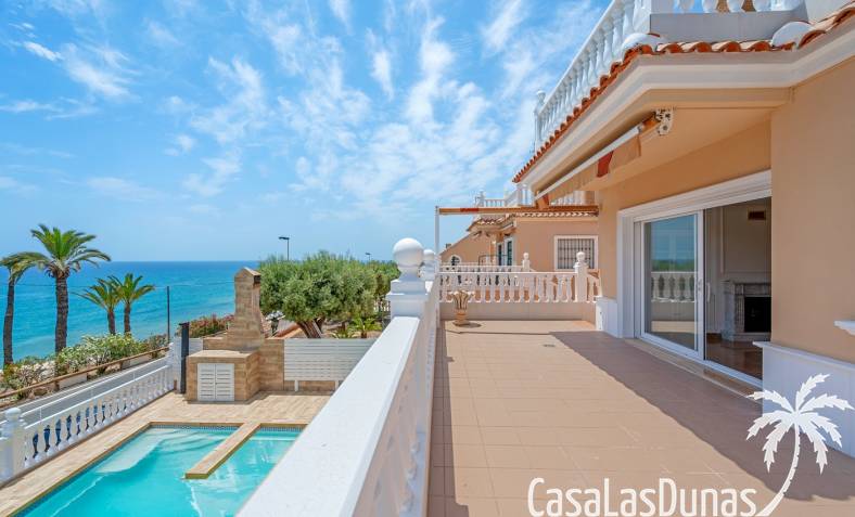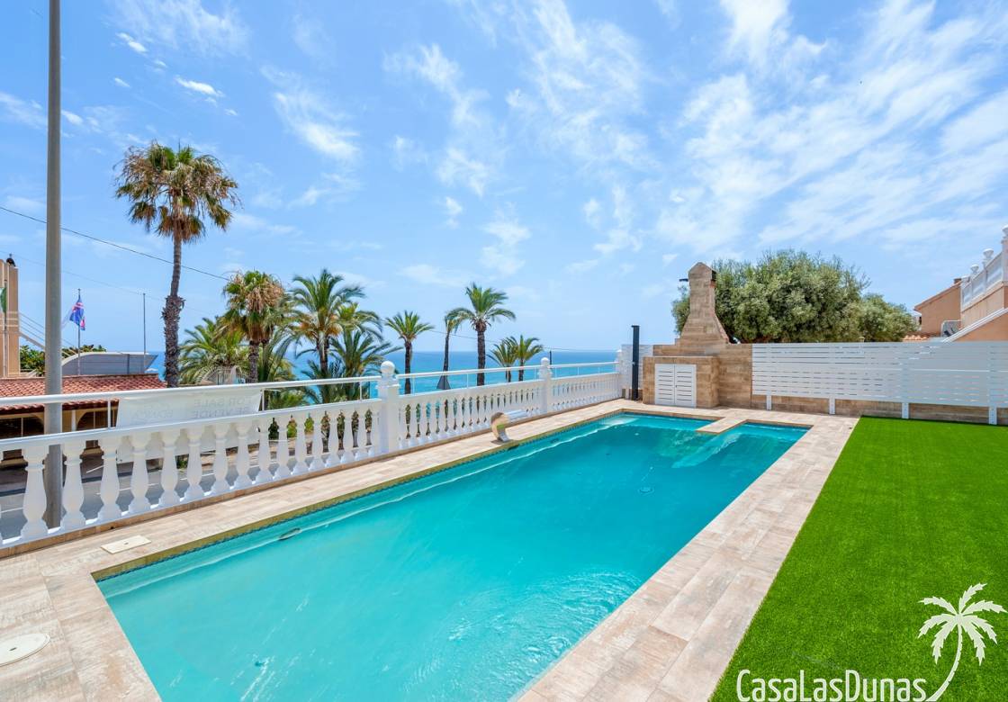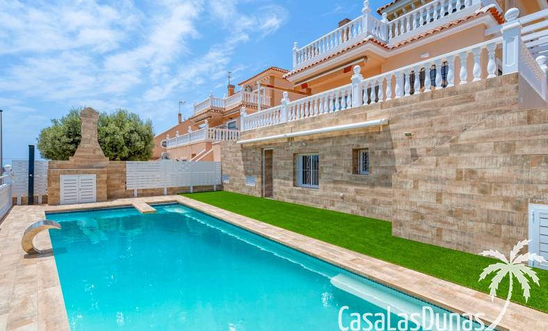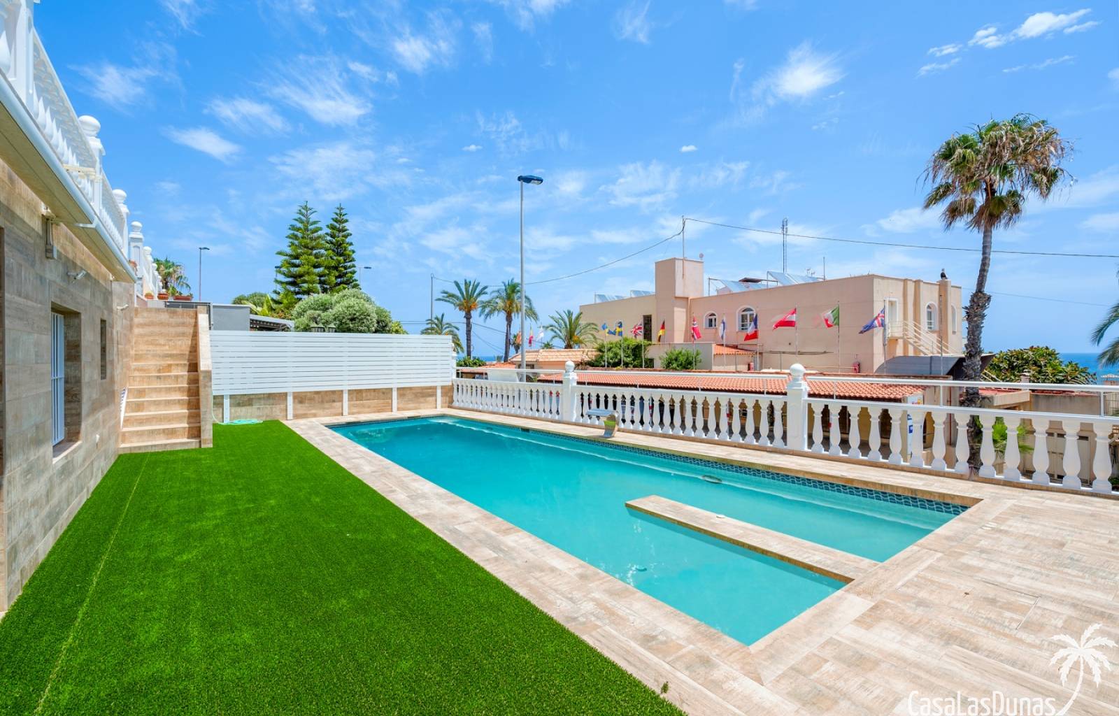 El exterior de la vivienda incluye una piscina privada con zona de solárium, terrazas, y un jardín con césped artificial. La orientación este permite aprovechar la luz natural desde primeras horas del día y contemplar el mar desde diferentes puntos de la casa.