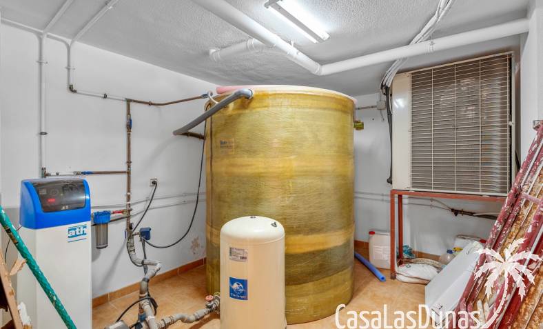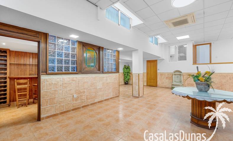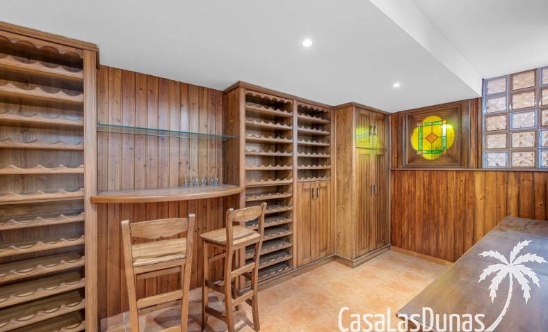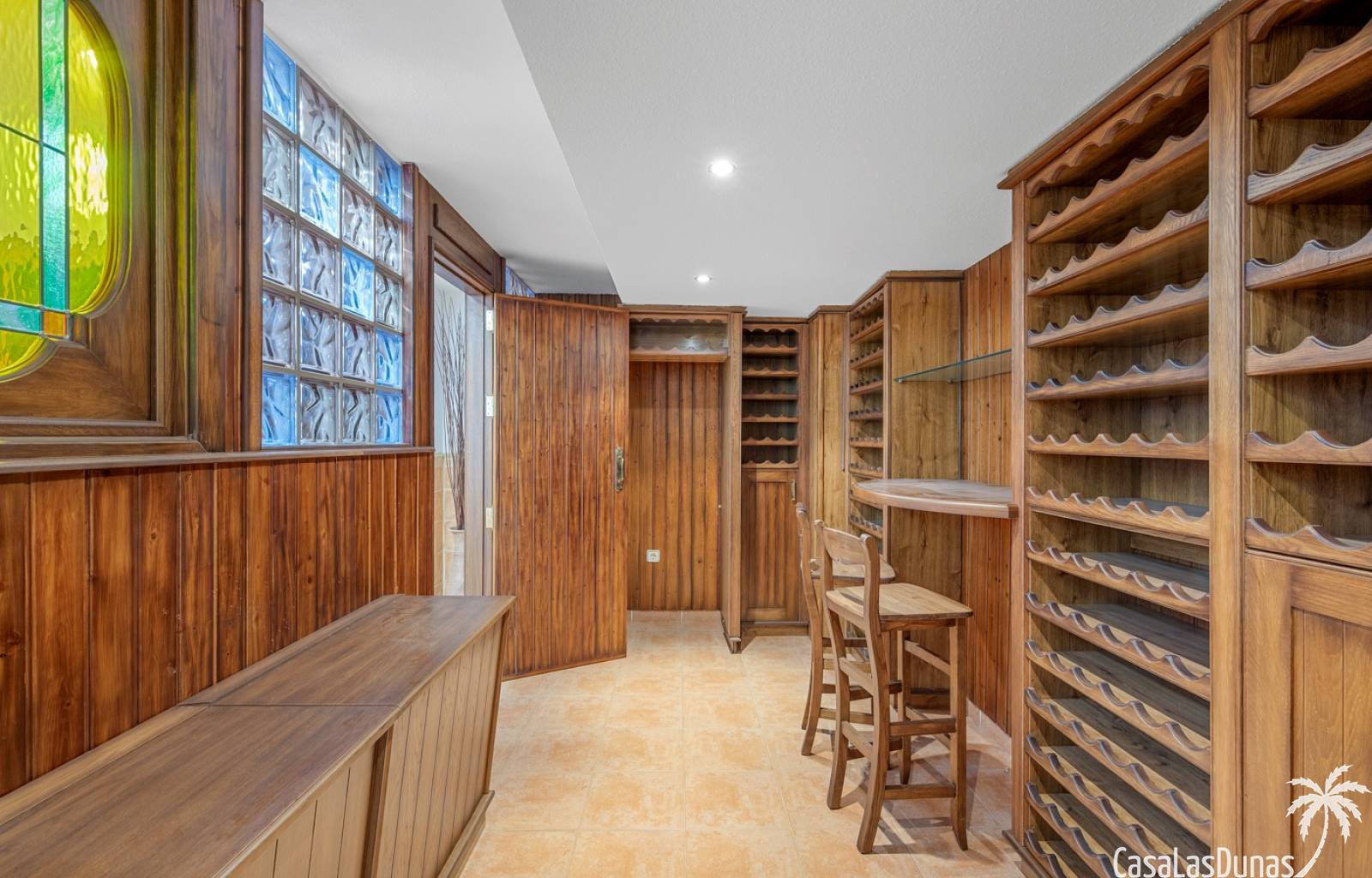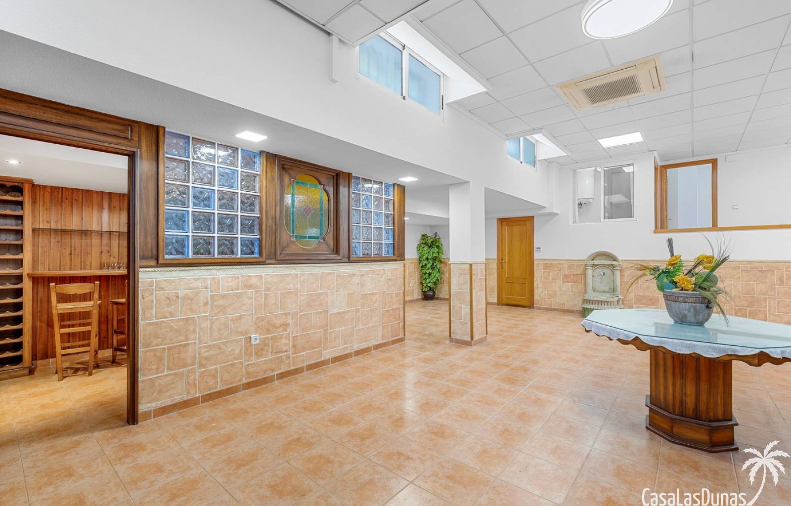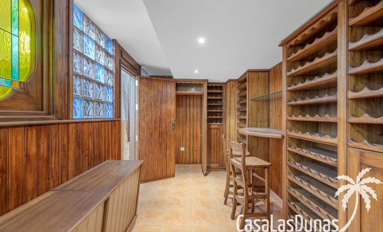 Distribuida en tres plantas, la vivienda ofrece en la planta baja un doble garaje privado con acceso directo a la casa, una amplia sala de recreo ideal para cine en casa o zona de juegos, una bodega, un dormitorio adicional, un baño completo, cuarto técnico con depósito de gasoil y varios espacios de almacenamiento. Desde esta planta se accede directamente al exterior, donde se encuentra una gran zona de patio con piscina privada y jardín de césped artificial, perfecto para disfrutar del clima y la tranquilidad del entorno.