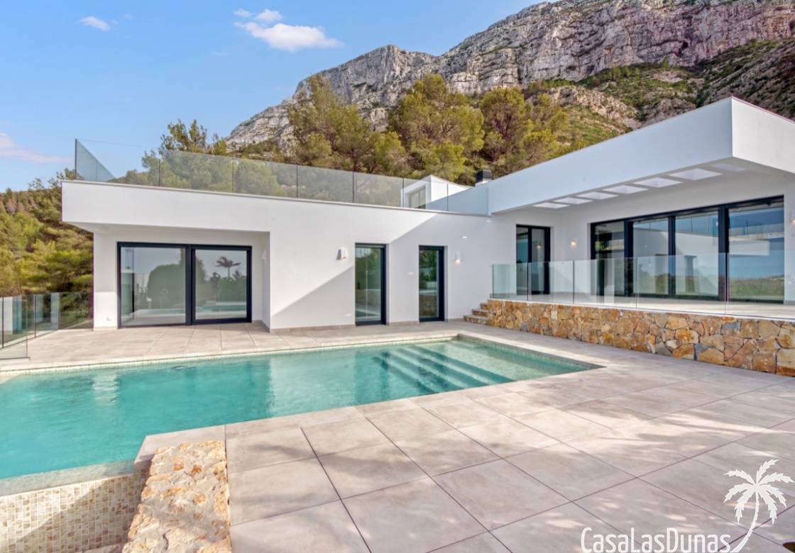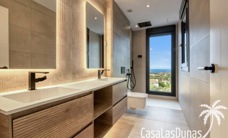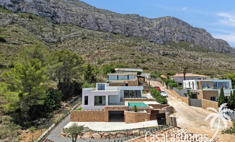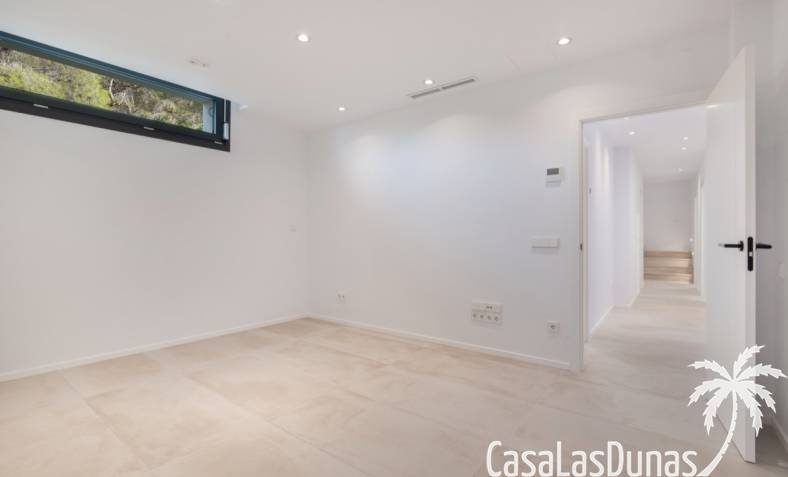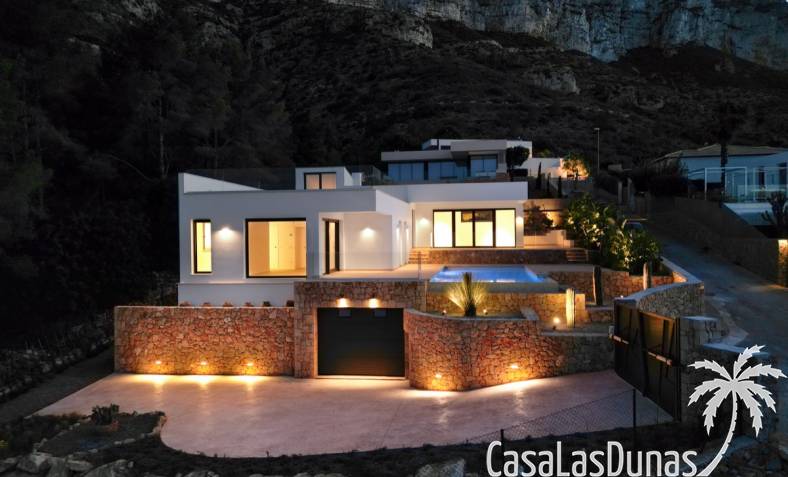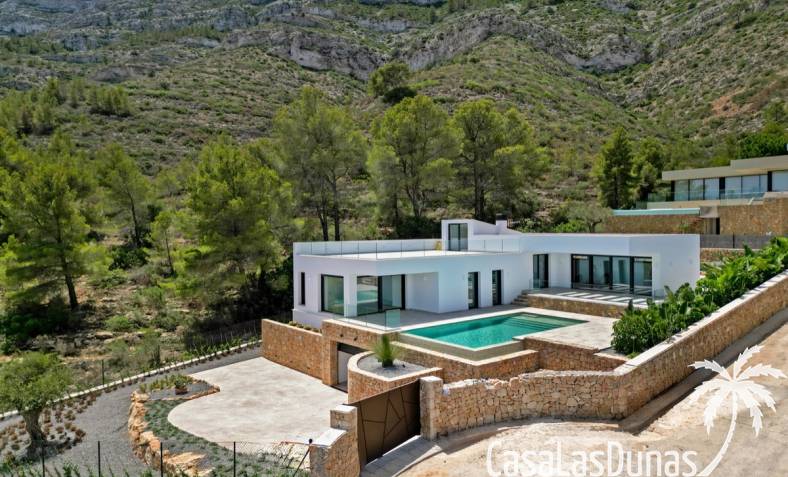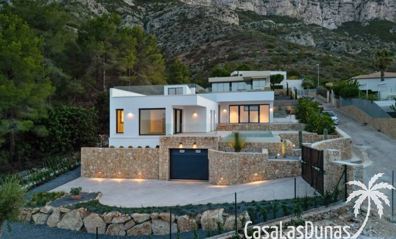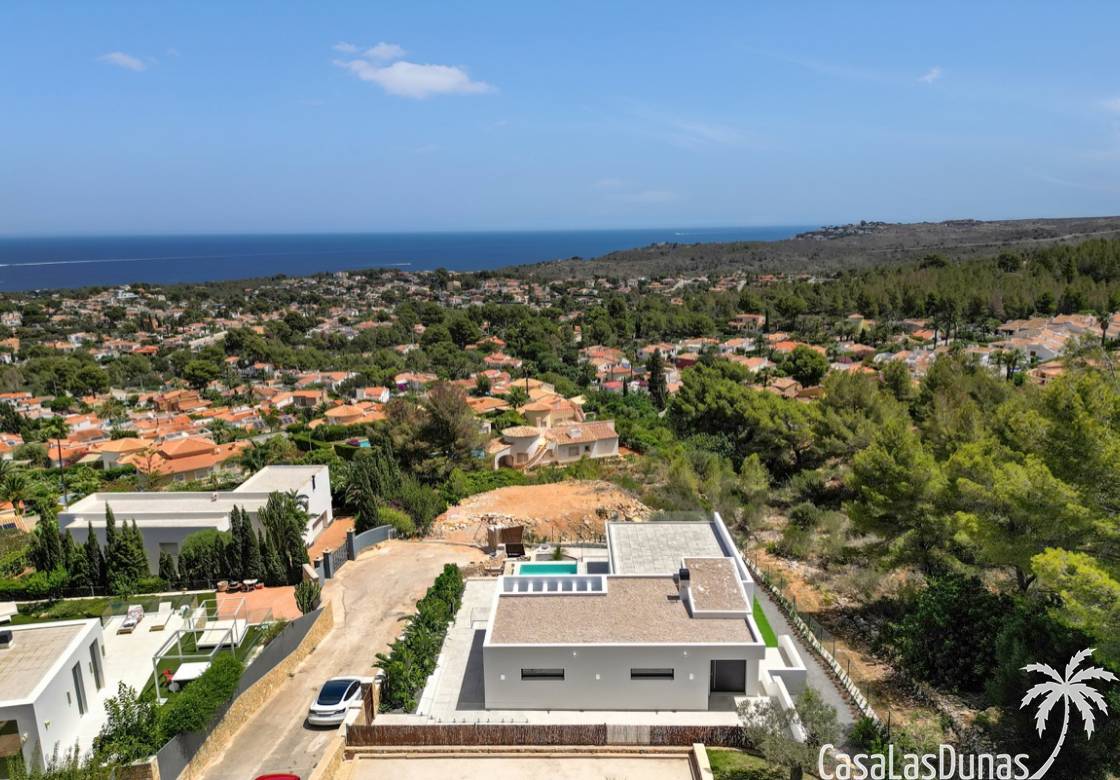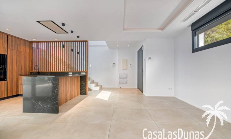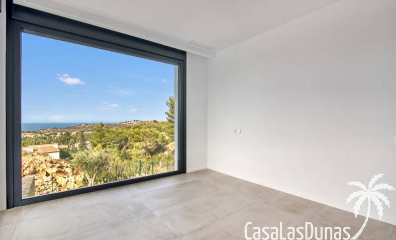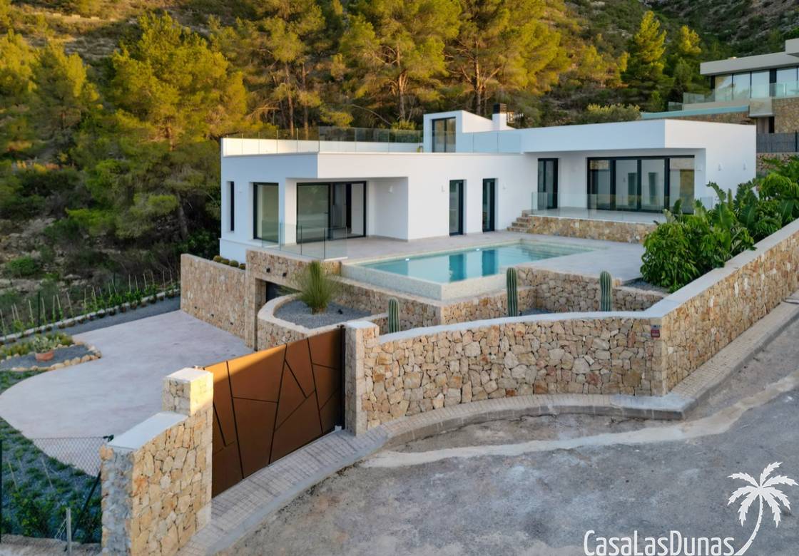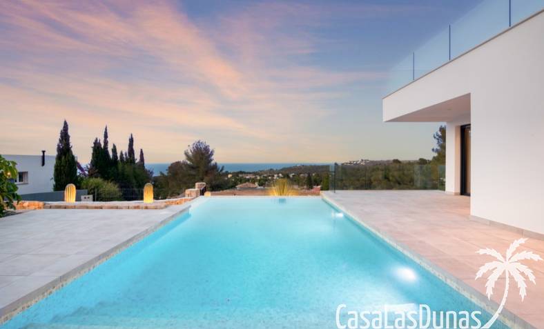 Villa de lujo a estrenar con impresionantes vistas al mar, rodeada de naturaleza y lindando con el Parque Natural del Montgó. La casa está construida con los mejores materiales del mercado y acabados de alta calidad, cuidando cada detalle, cuidadosamente pensado y diseñado por profesionales. La villa, con una superficie total de 295 m², se distribuye en dos plantas de la siguiente manera: Planta baja: amplio salón-comedor, cocina de diseño abierta equipada con electrodomésticos de última generación, dormitorio principal con baño en suite y vestidor, dos dormitorios y un baño completo. En esta planta, el salón, la cocina y los dormitorios tienen acceso directo a las terrazas y a la piscina. Desde esta planta también se accede a un amplio solárium con vistas panorámicas, desde donde se pueden disfrutar de espectaculares puestas de sol. El sótano cuenta con un espacio multifuncional que puede utilizarse como dormitorio, sala de fitness o home cinema, con un proyector preinstalado, un dormitorio adicional, un baño completo, un lavadero, una sala de máquinas y un amplio garaje. Esta villa está construida y equipada con tecnología de última generación y tiene una calificación energética A. Cuenta con calefacción por suelo radiante con aerotermia, sistema de recuperación de calor, aire acondicionado central con conductos de frío y calor y termostatos en cada estancia, persianas eléctricas, alarma, controles termostáticos electrónicos en los baños de la planta baja que permiten regular la temperatura y el caudal de agua, y preinstalación de persianas motorizadas. En el exterior, sobre una parcela de 850 m², podrás disfrutar de amplias terrazas, una piscina infinity de 8x4 m con iluminación LED a elegir entre 4 colores diferentes, y un precioso jardín con riego automático que requiere un mantenimiento mínimo.