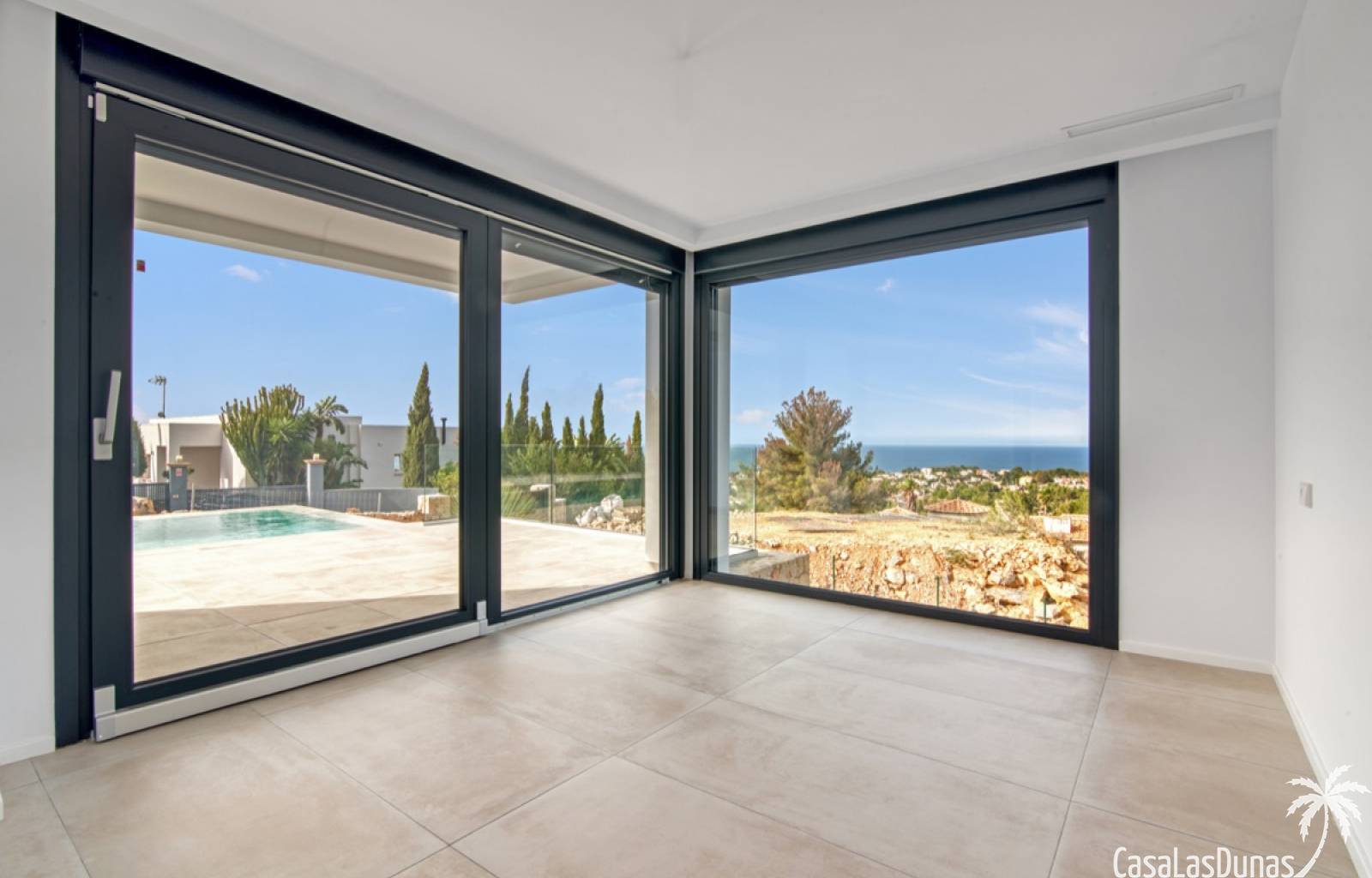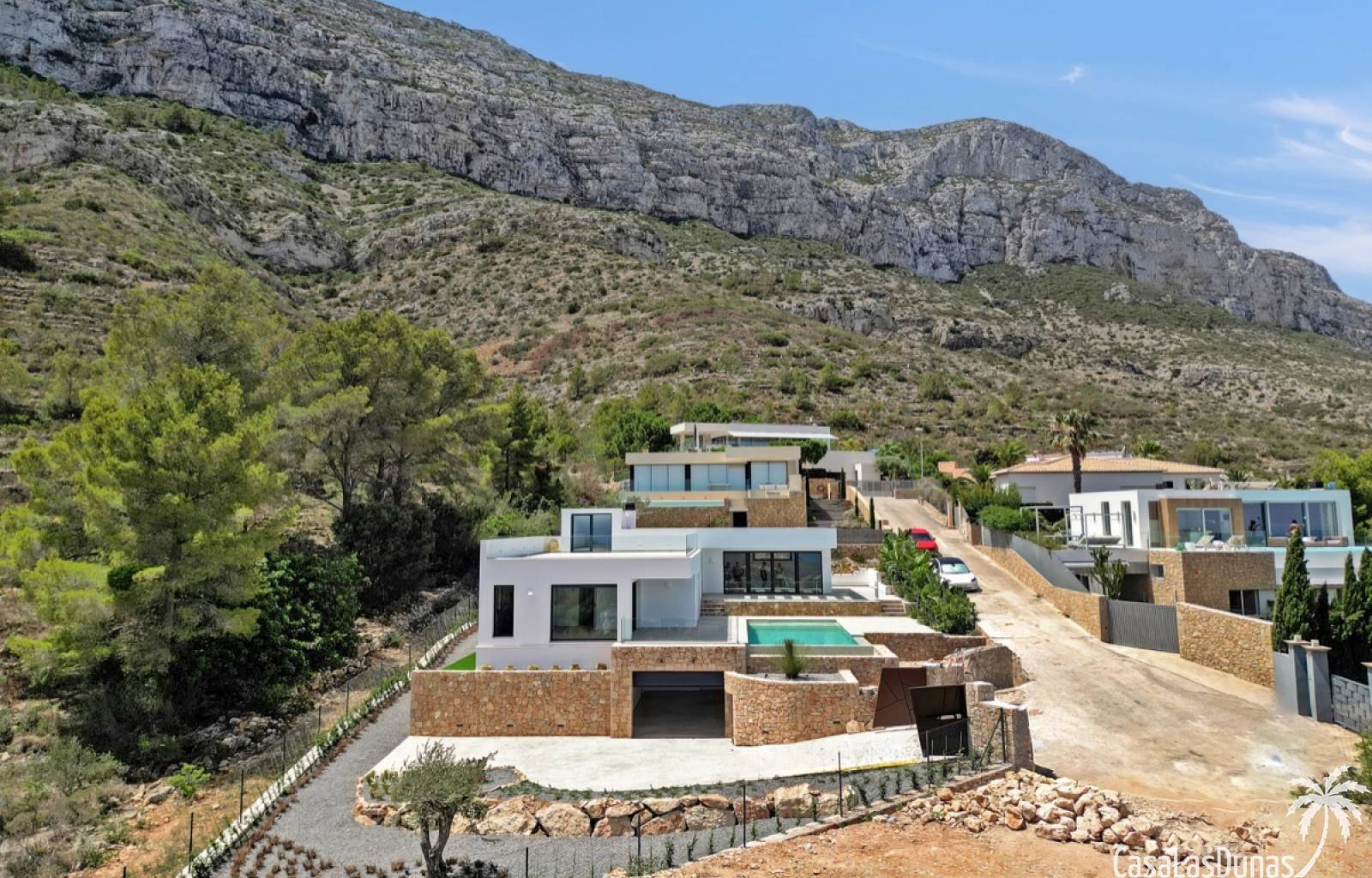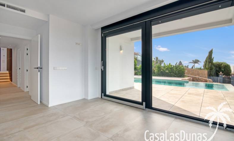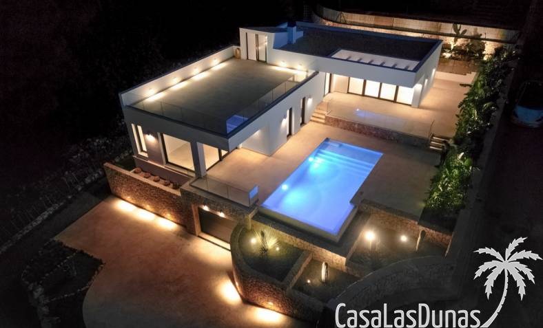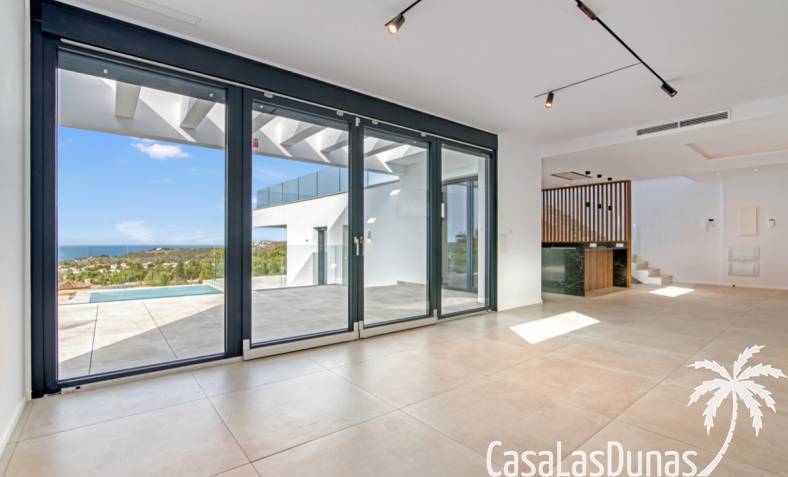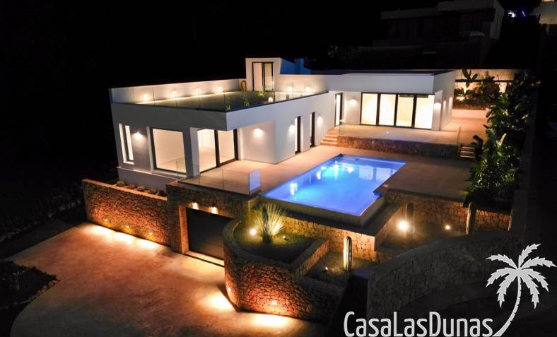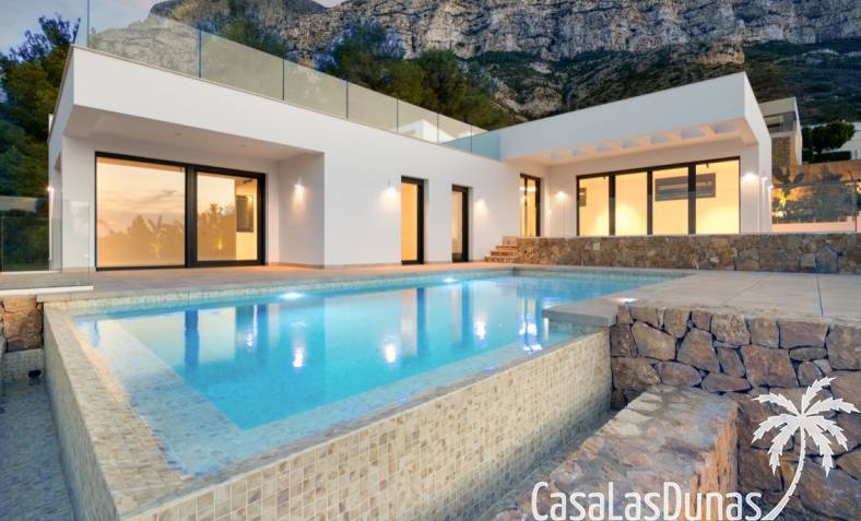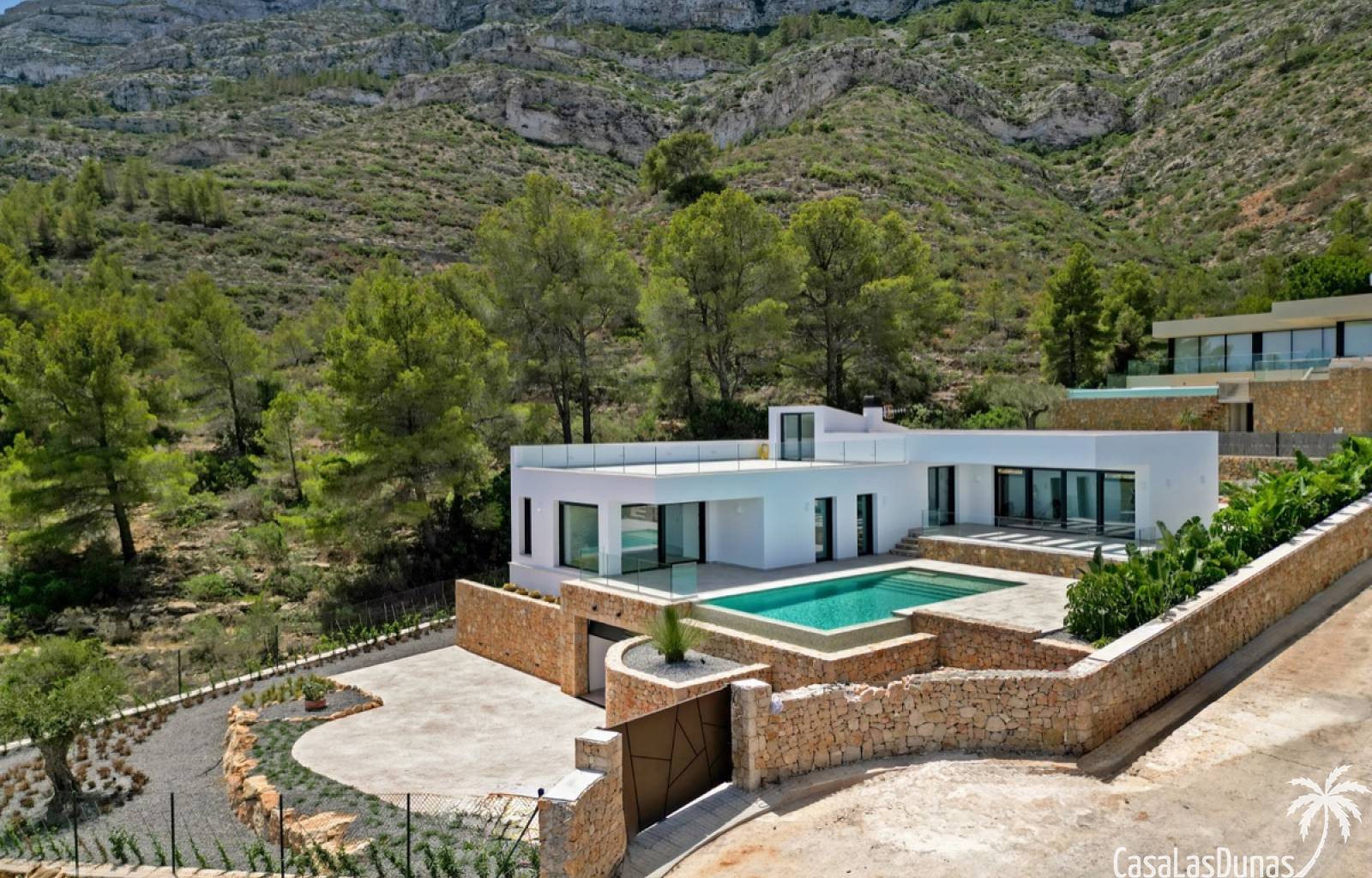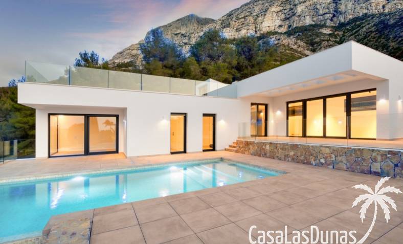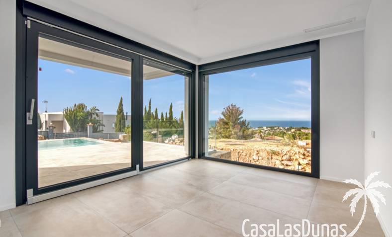 Villa de lujo a estrenar con impresionantes vistas al mar, rodeada de naturaleza y lindando con el Parque Natural del Montgó. La casa está construida con los mejores materiales del mercado y acabados de alta calidad, cuidando cada detalle, cuidadosamente pensado y diseñado por profesionales. La villa, con una superficie total de 295 m², se distribuye en dos plantas de la siguiente manera: Planta baja: amplio salón-comedor, cocina de diseño abierta equipada con electrodomésticos de última generación, dormitorio principal con baño en suite y vestidor, dos dormitorios y un baño completo. En esta planta, el salón, la cocina y los dormitorios tienen acceso directo a las terrazas y a la piscina. Desde esta planta también se accede a un amplio solárium con vistas panorámicas, desde donde se pueden disfrutar de espectaculares puestas de sol. El sótano cuenta con un espacio multifuncional que puede utilizarse como dormitorio, sala de fitness o home cinema, con un proyector preinstalado, un dormitorio adicional, un baño completo, un lavadero, una sala de máquinas y un amplio garaje. Esta villa está construida y equipada con tecnología de última generación y tiene una calificación energética A. Cuenta con calefacción por suelo radiante con aerotermia, sistema de recuperación de calor, aire acondicionado central con conductos de frío y calor y termostatos en cada estancia, persianas eléctricas, alarma, controles termostáticos electrónicos en los baños de la planta baja que permiten regular la temperatura y el caudal de agua, y preinstalación de persianas motorizadas. En el exterior, sobre una parcela de 850 m², podrás disfrutar de amplias terrazas, una piscina infinity de 8x4 m con iluminación LED a elegir entre 4 colores diferentes, y un precioso jardín con riego automático que requiere un mantenimiento mínimo.