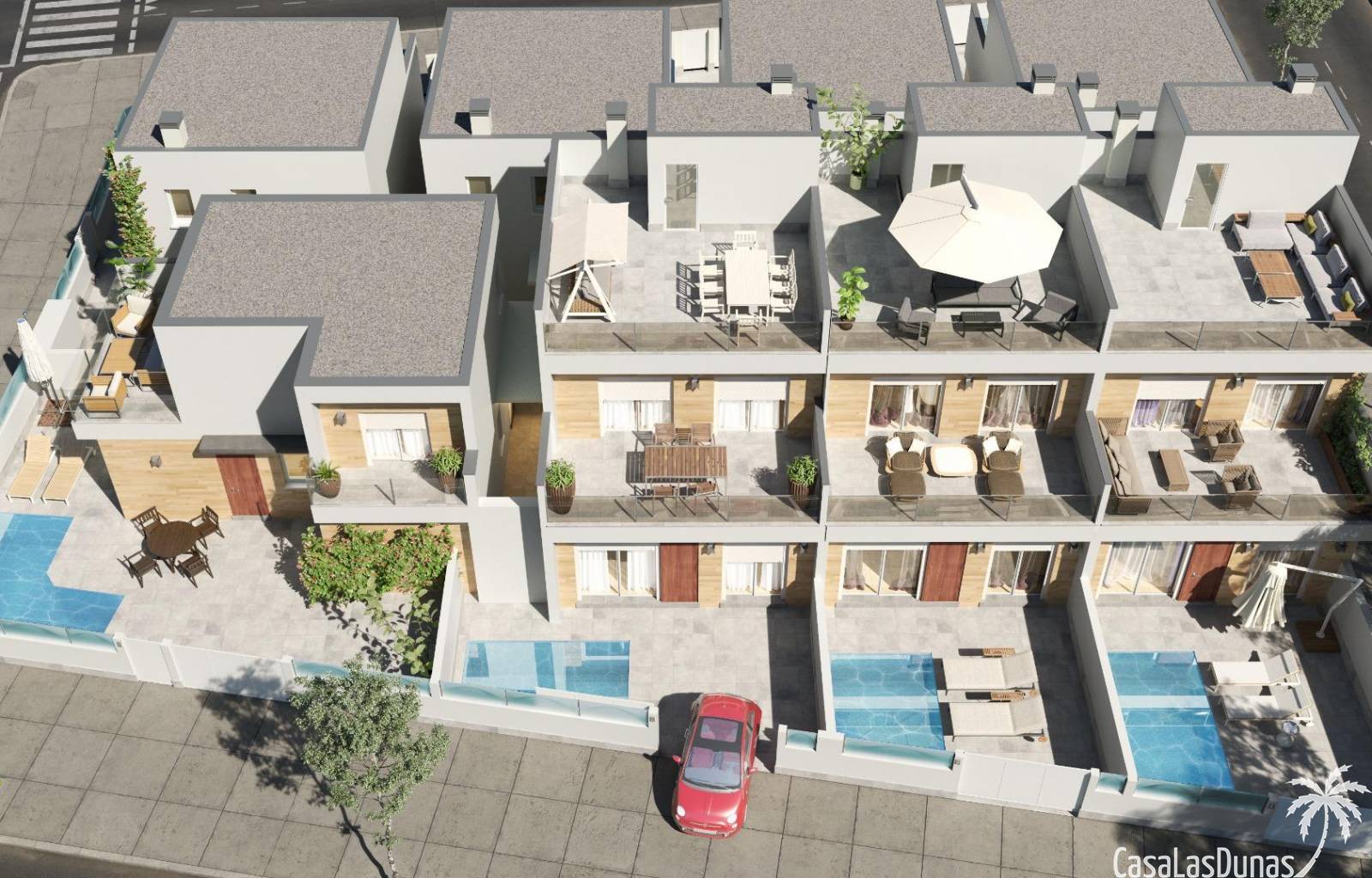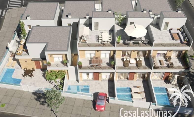 Promoción de obra nueva de 8 chalets independientes y pareados en San Pedro Pinatar, todos con piscina privada, terraza, solarium y plaza de aparcamiento dentro de la parcela.
