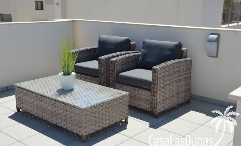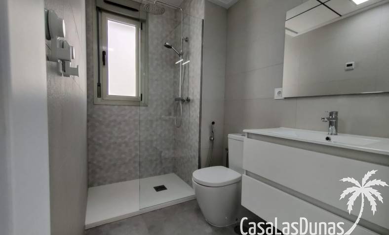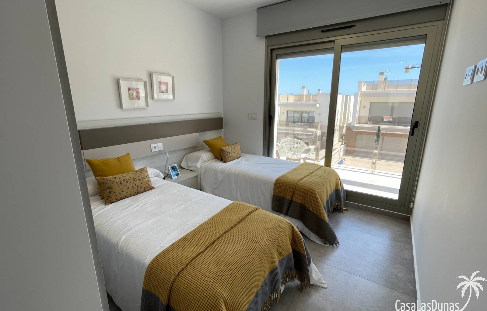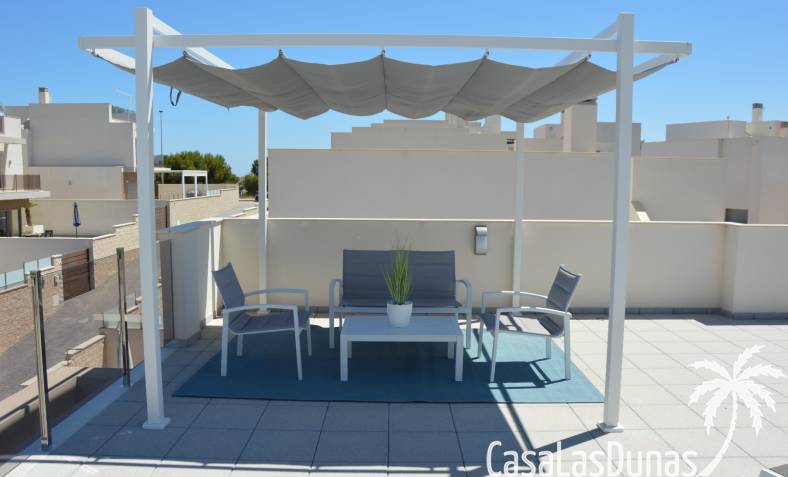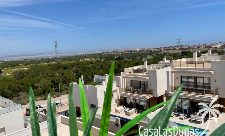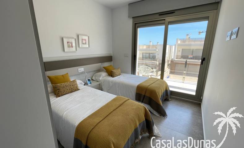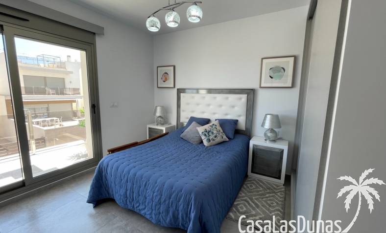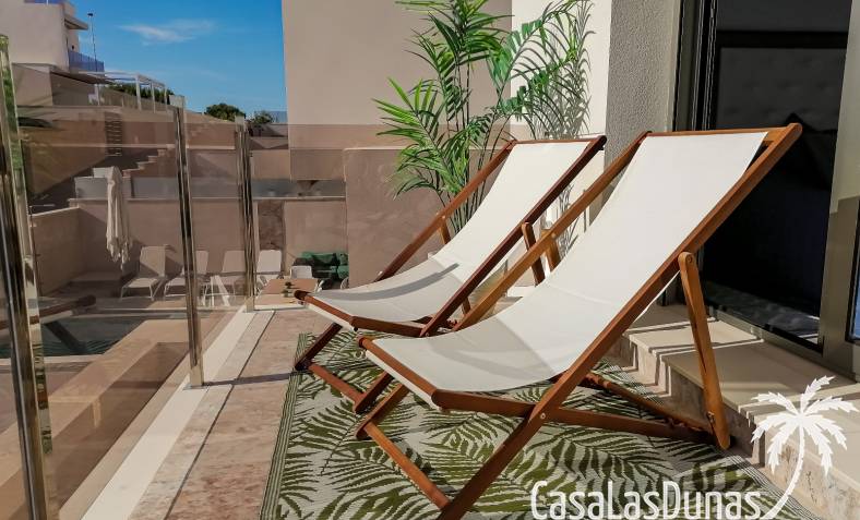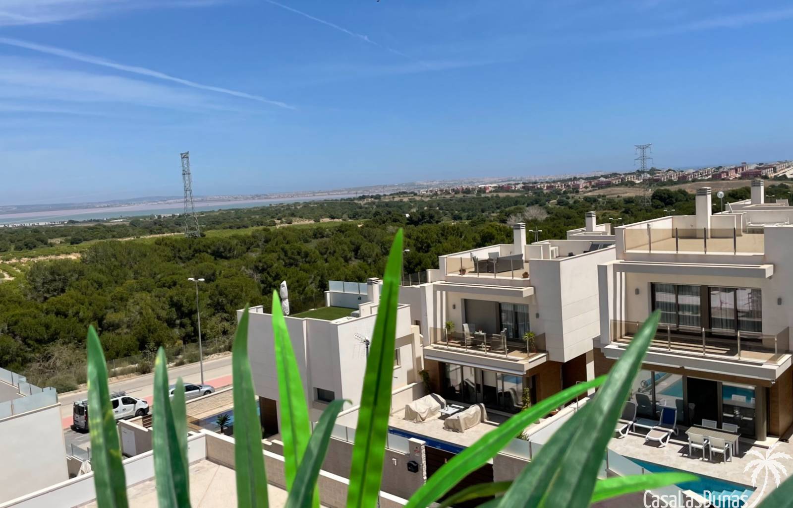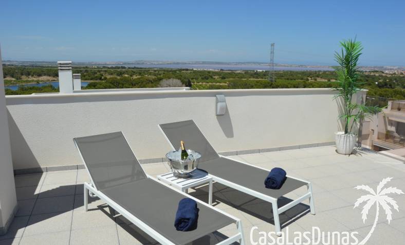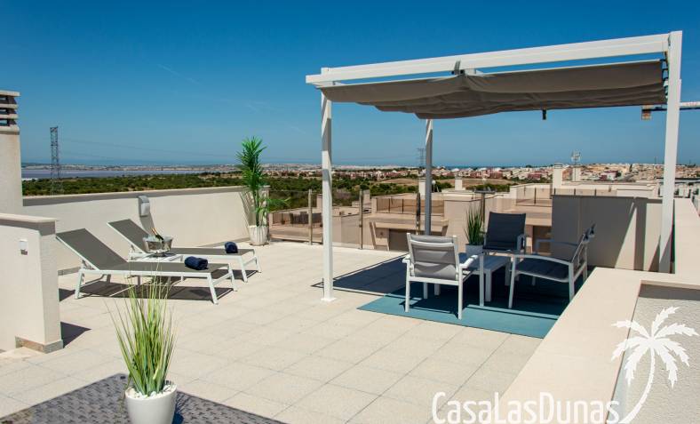 En la primera planta se encuentran dos amplias habitaciones, cada una con su propio baño y acceso a un balcón soleado. Desde aquí también se accede a un gran solárium privado. Disfrute de impresionantes vistas panorámicas de 360° del paisaje circundante y las salinas de Torrevieja: un lugar ideal para relajarse, tomar el sol y disfrutar de las cálidas noches al aire libre.