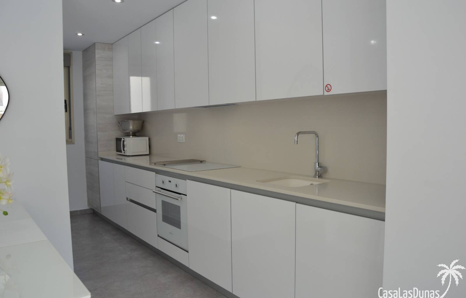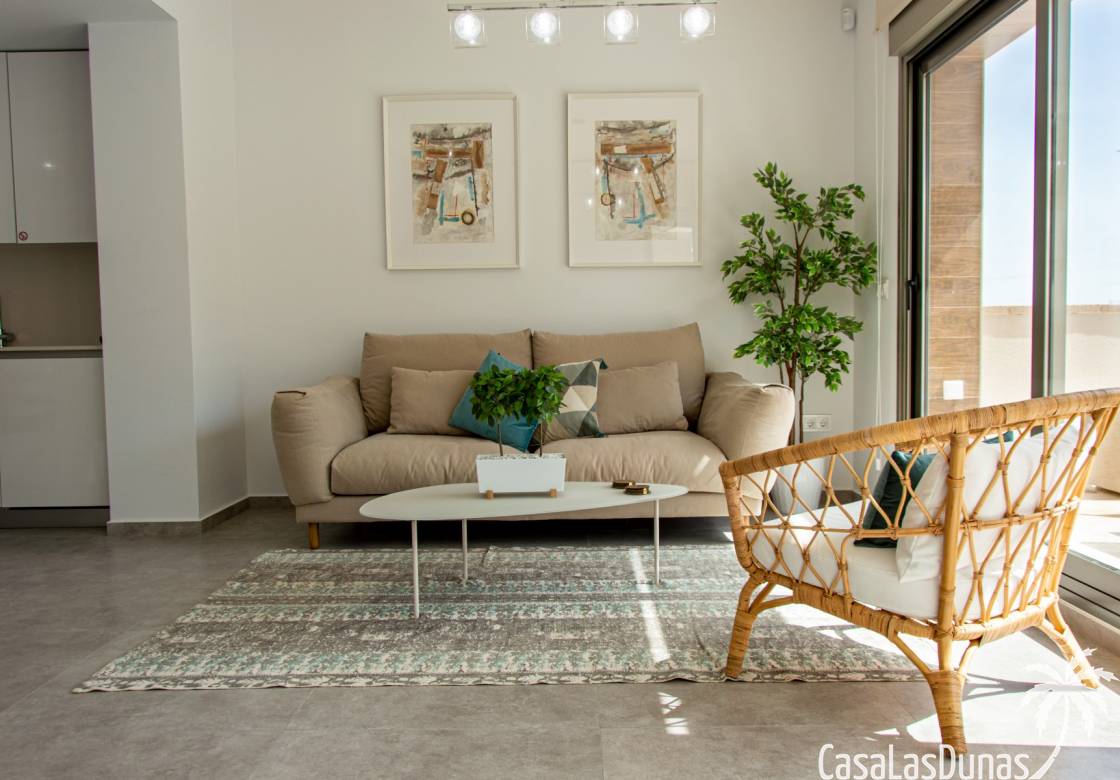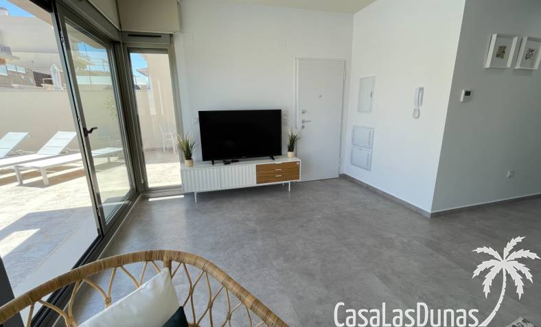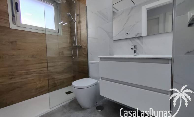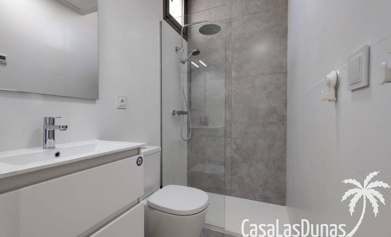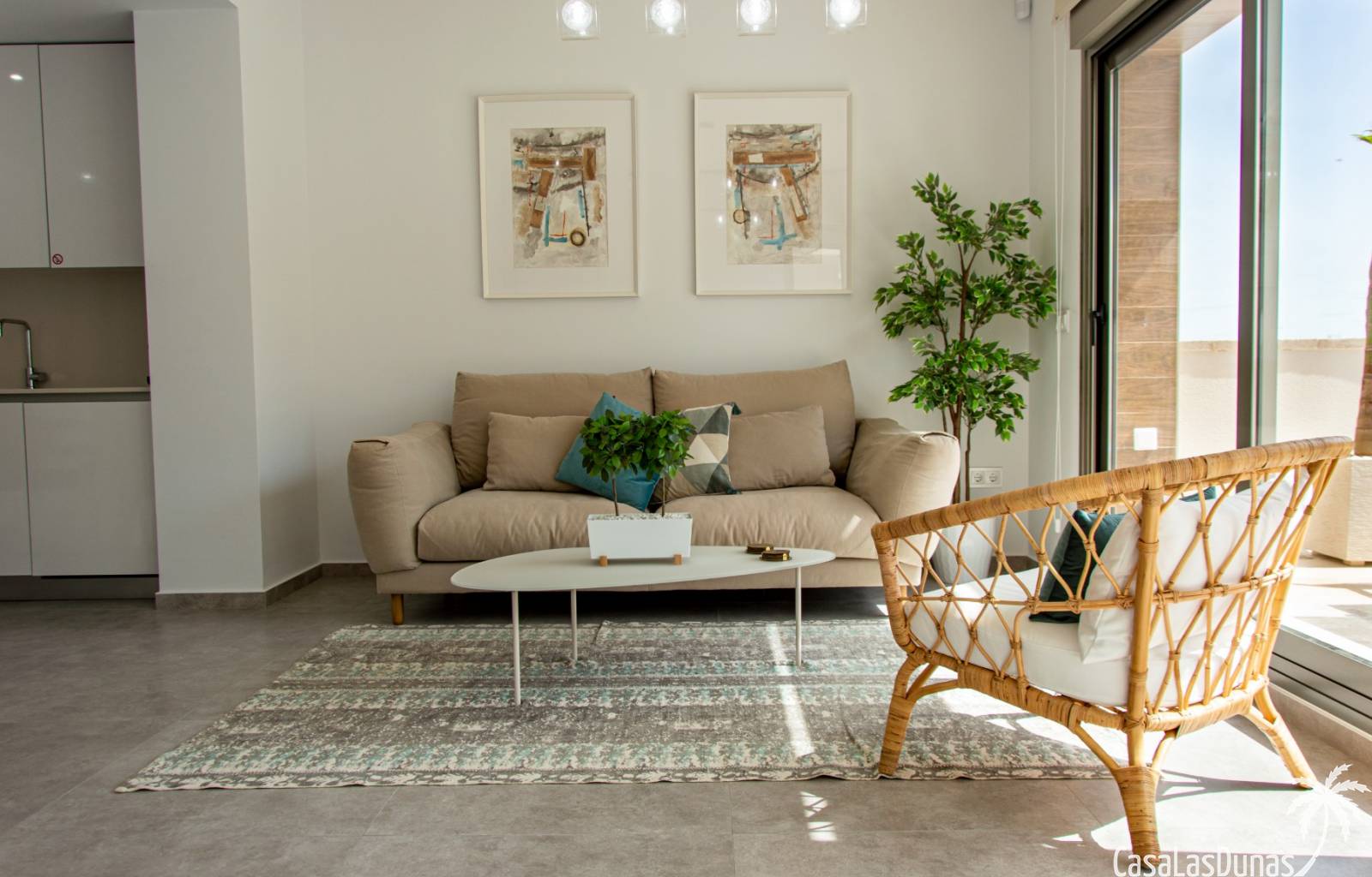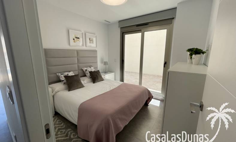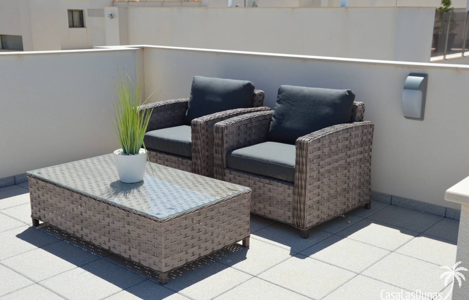 En la primera planta se encuentran dos amplias habitaciones, cada una con su propio baño y acceso a un balcón soleado. Desde aquí también se accede a un gran solárium privado. Disfrute de impresionantes vistas panorámicas de 360° del paisaje circundante y las salinas de Torrevieja: un lugar ideal para relajarse, tomar el sol y disfrutar de las cálidas noches al aire libre.