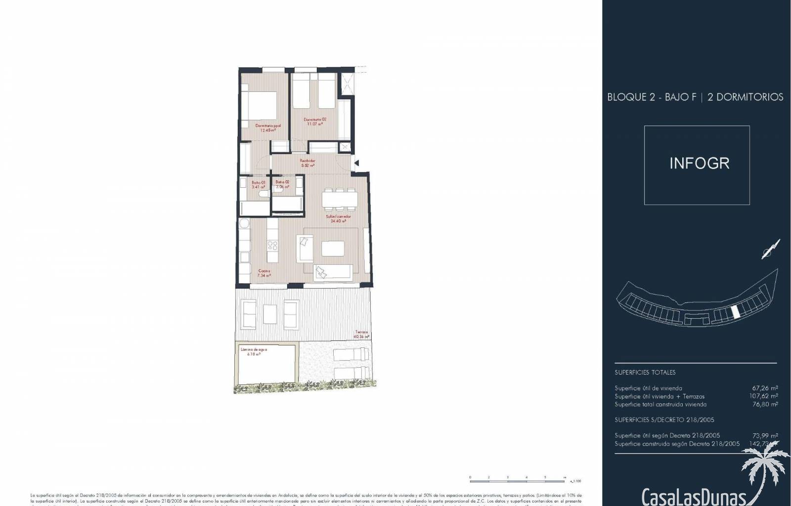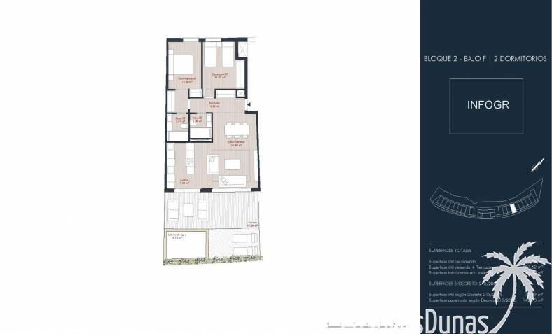La promoción se compone de dos elegantes edificios en forma de media luna, cada uno con 32 viviendas distribuidas en cuatro niveles: planta baja, primera planta, segunda planta y áticos. El proyecto ofrece una selección de viviendas de 2 y 3 dormitorios que se adaptan a diferentes estilos de vida. Vistas al mar desde algunas viviendas. Las propiedades de la planta baja cuentan con jardines y piscinas privadas, las viviendas de las plantas intermedias ofrecen amplias terrazas panorámicas y los áticos incluyen soláriums privados con vistas al mar y piscinas privadas. Todas las viviendas incluyen al menos una plaza de aparcamiento con preinstalación para vehículos eléctricos y un trastero privado.