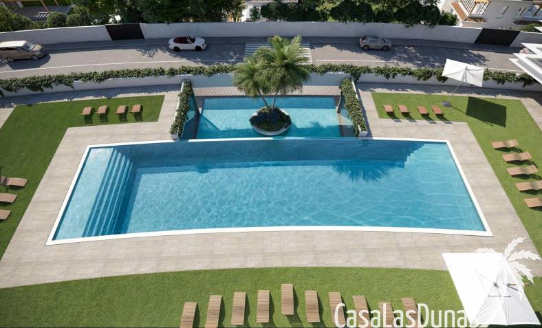 El complejo residencial ofrece amplias zonas comunes ajardinadas diseñadas para el relax y el bienestar. Una espectacular piscina desbordante crea un llamativo efecto visual al caer en cascada desde la primera planta hasta la planta baja. Los residentes también pueden disfrutar de un gimnasio totalmente equipado, vestuarios, espacio de coworking y aparcamiento para bicicletas, lo que hace que esta promoción sea ideal tanto para vivir de forma permanente como para pasar las vacaciones.