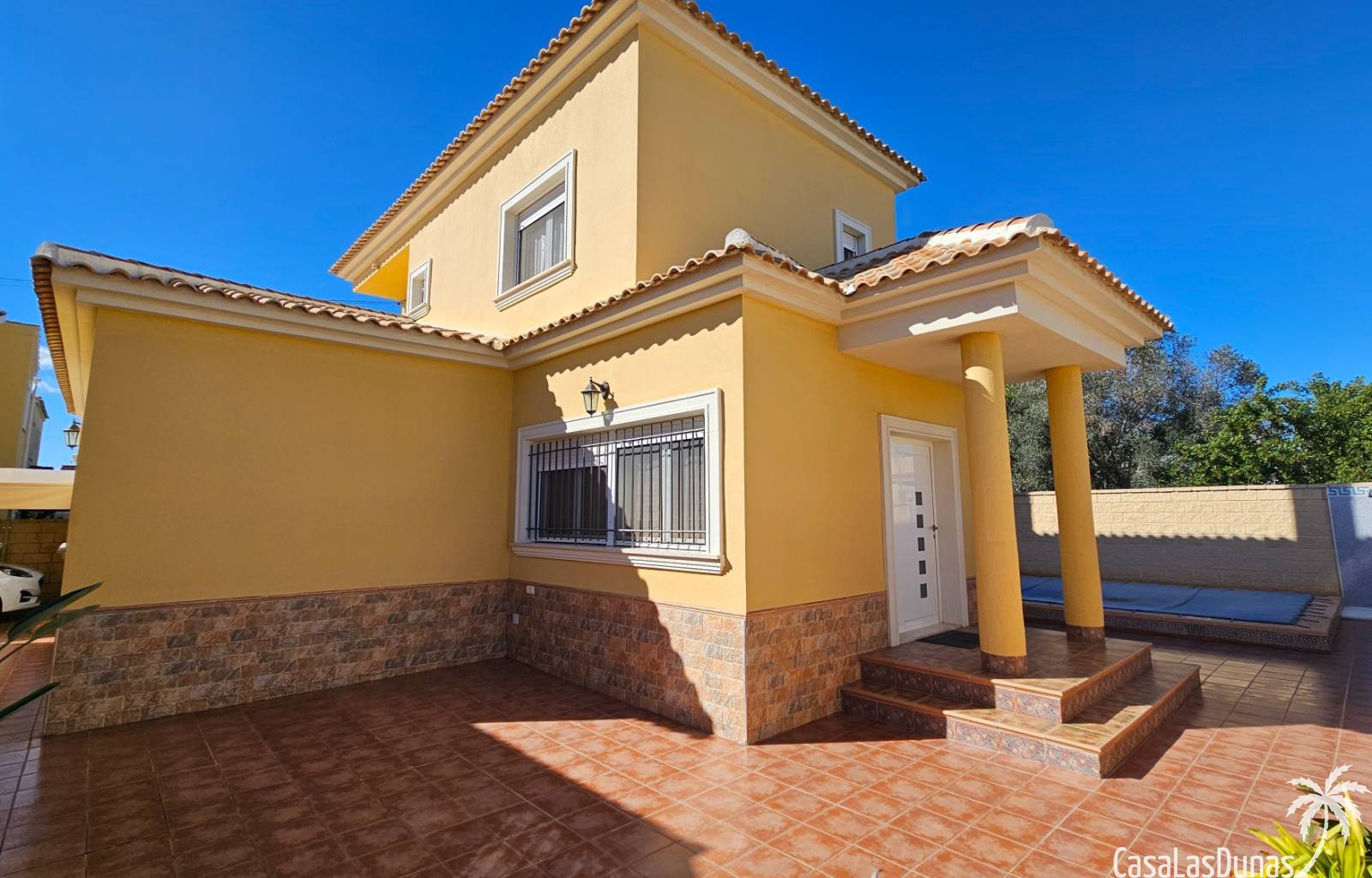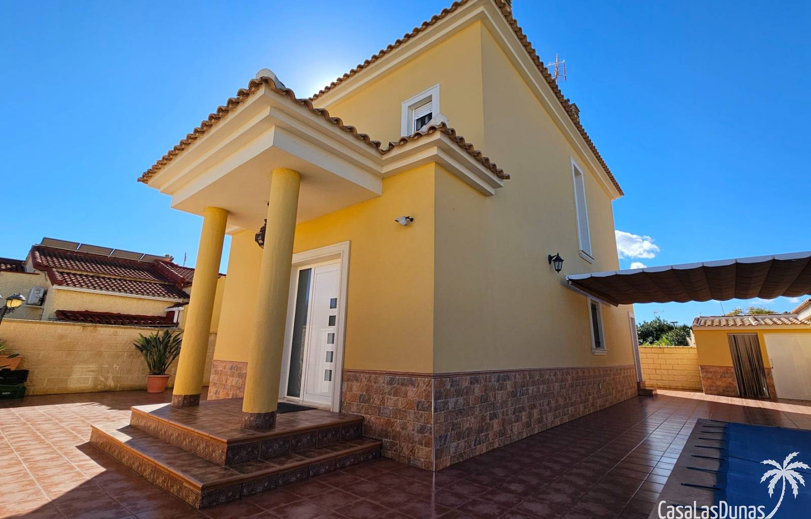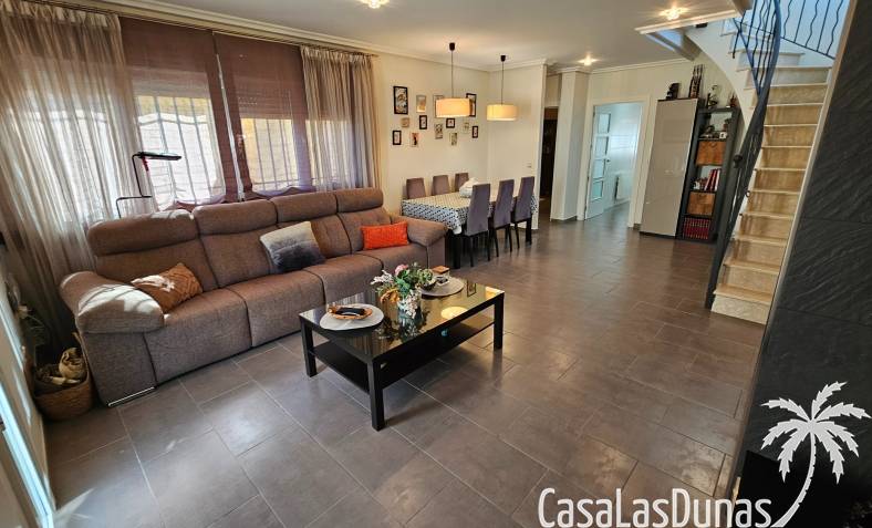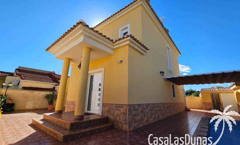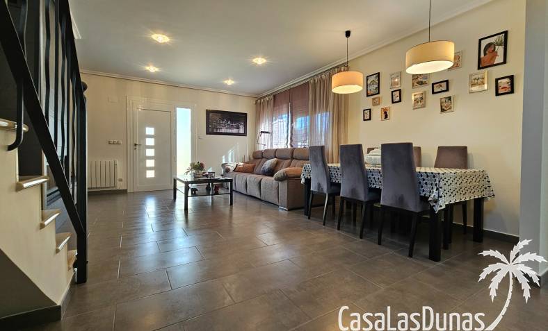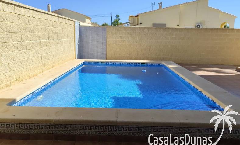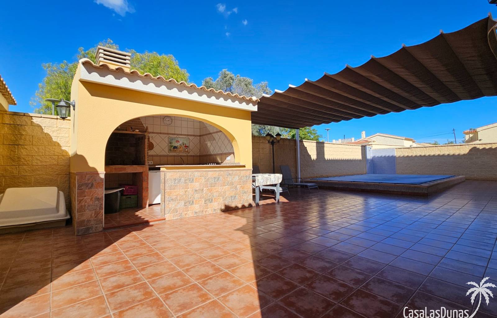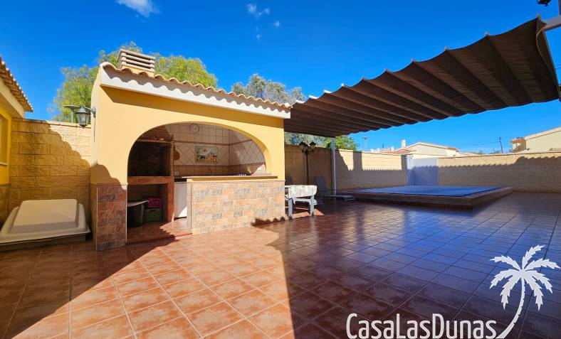 Este chalet independiente en excelentes condiciones se encuentra en la zona residencial de La Marina. La propiedad se asienta sobre una parcela de 316 m² y ofrece una plaza de aparcamiento doble cubierta, una plaza de aparcamiento exterior adicional, una amplia cocina de verano totalmente equipada, una piscina de 6 x 4 metros, un aseo independiente, un trastero y una amplia terraza. El jardín, completamente embaldosado, es de fácil mantenimiento. El chalet se distribuye en dos plantas. La planta baja cuenta con un amplio salón-comedor con una moderna cocina contigua equipada con electrodomésticos integrados.