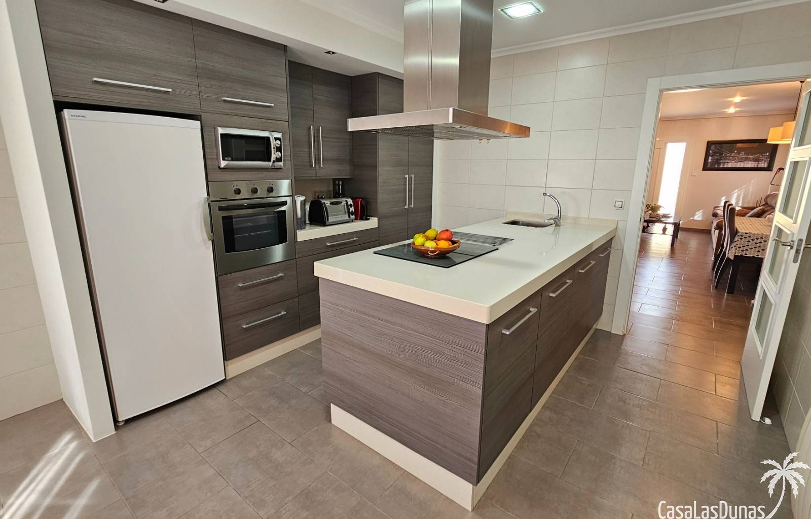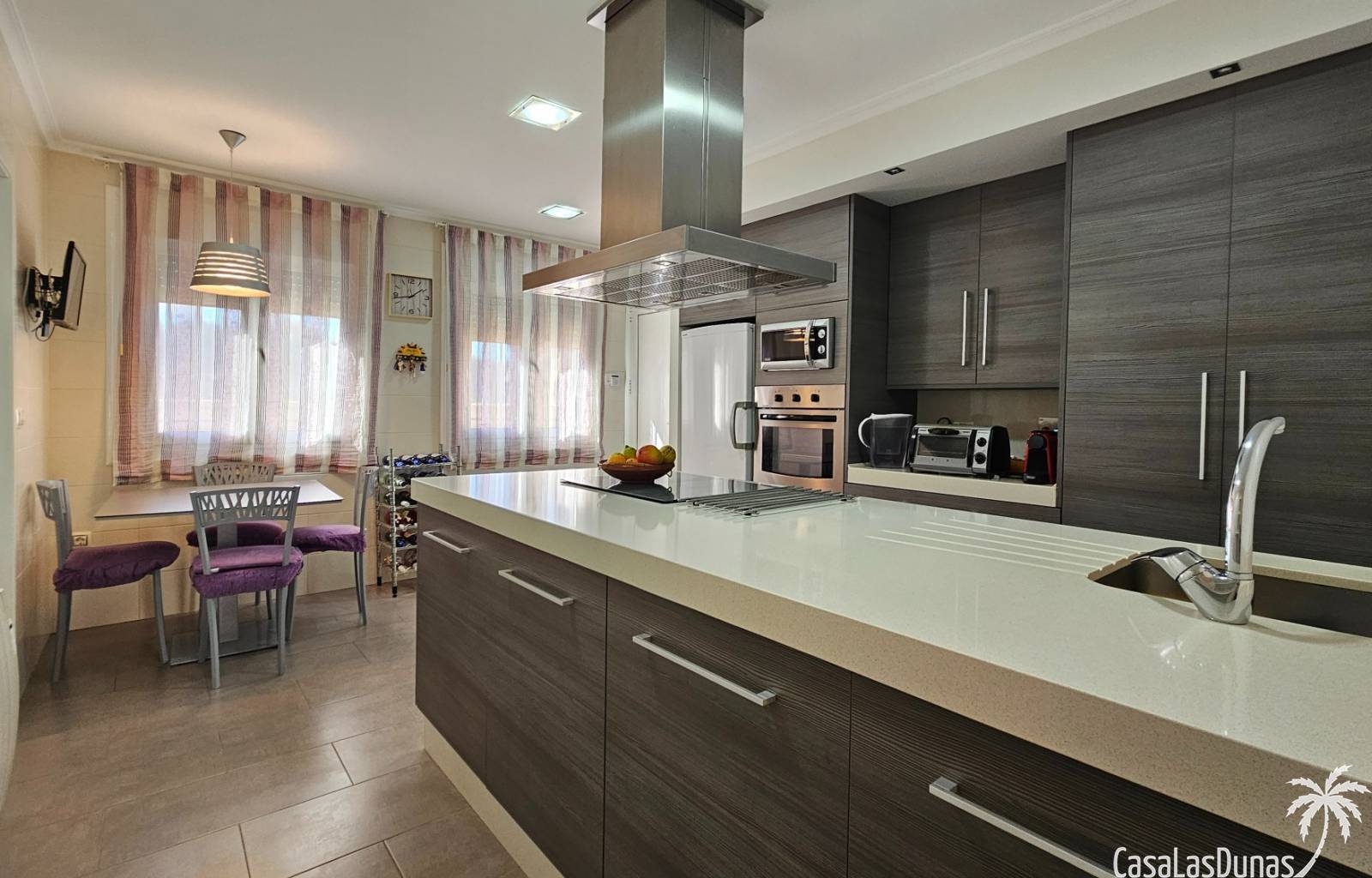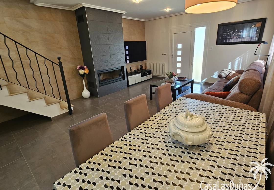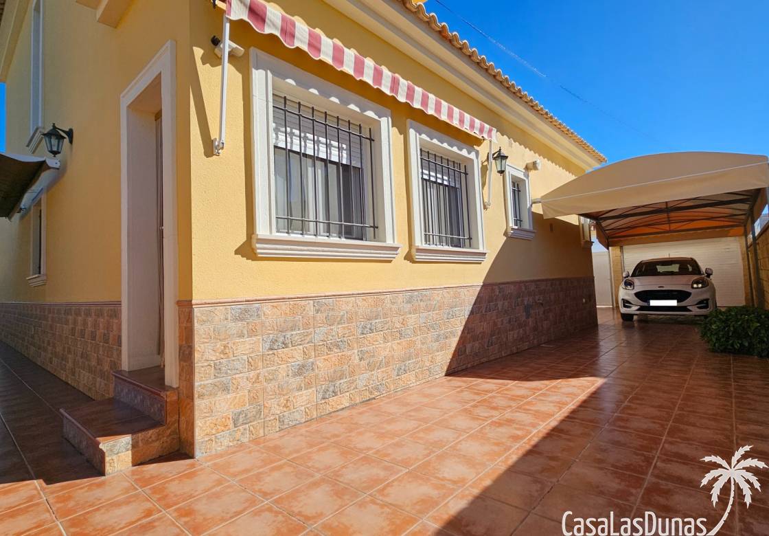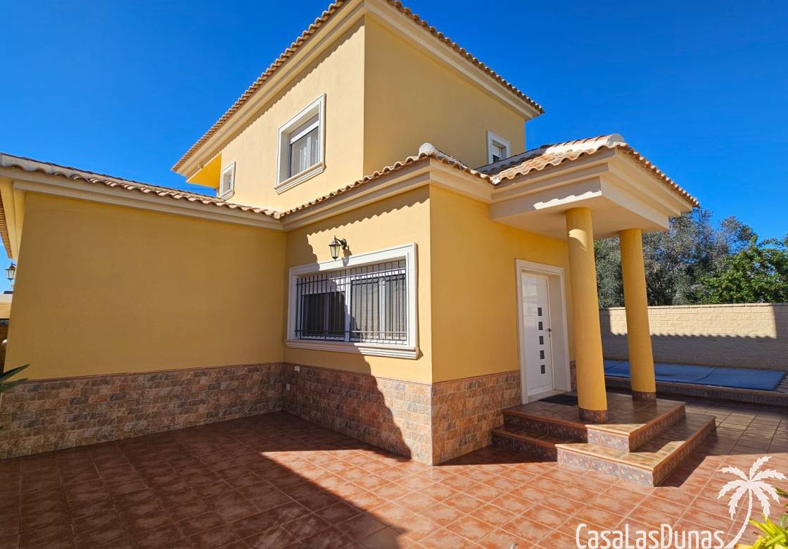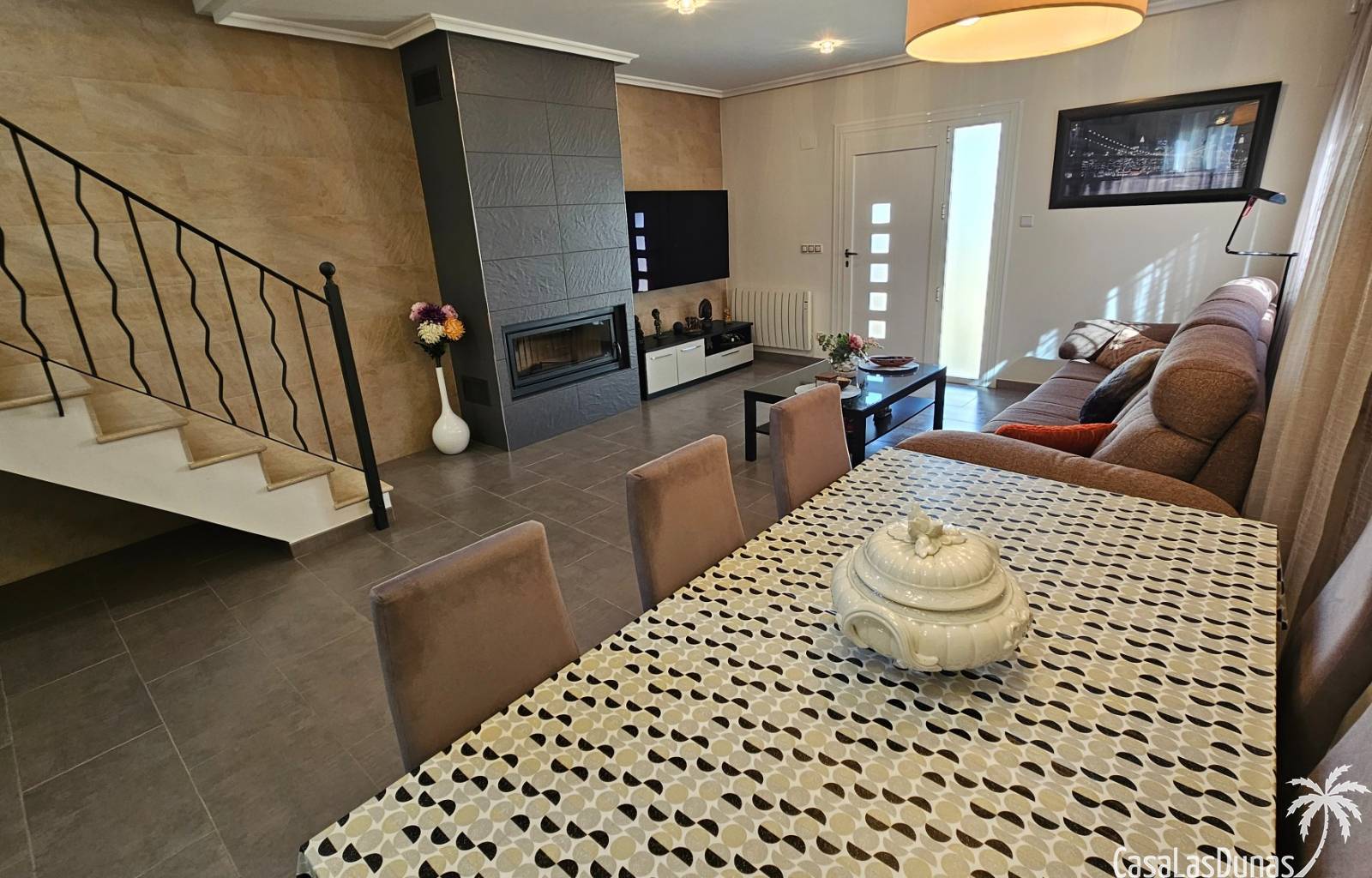 Este chalet independiente en excelentes condiciones se encuentra en la zona residencial de La Marina. La propiedad se asienta sobre una parcela de 316 m² y ofrece una plaza de aparcamiento doble cubierta, una plaza de aparcamiento exterior adicional, una amplia cocina de verano totalmente equipada, una piscina de 6 x 4 metros, un aseo independiente, un trastero y una amplia terraza. El jardín, completamente embaldosado, es de fácil mantenimiento. El chalet se distribuye en dos plantas. La planta baja cuenta con un amplio salón-comedor con una moderna cocina contigua equipada con electrodomésticos integrados.