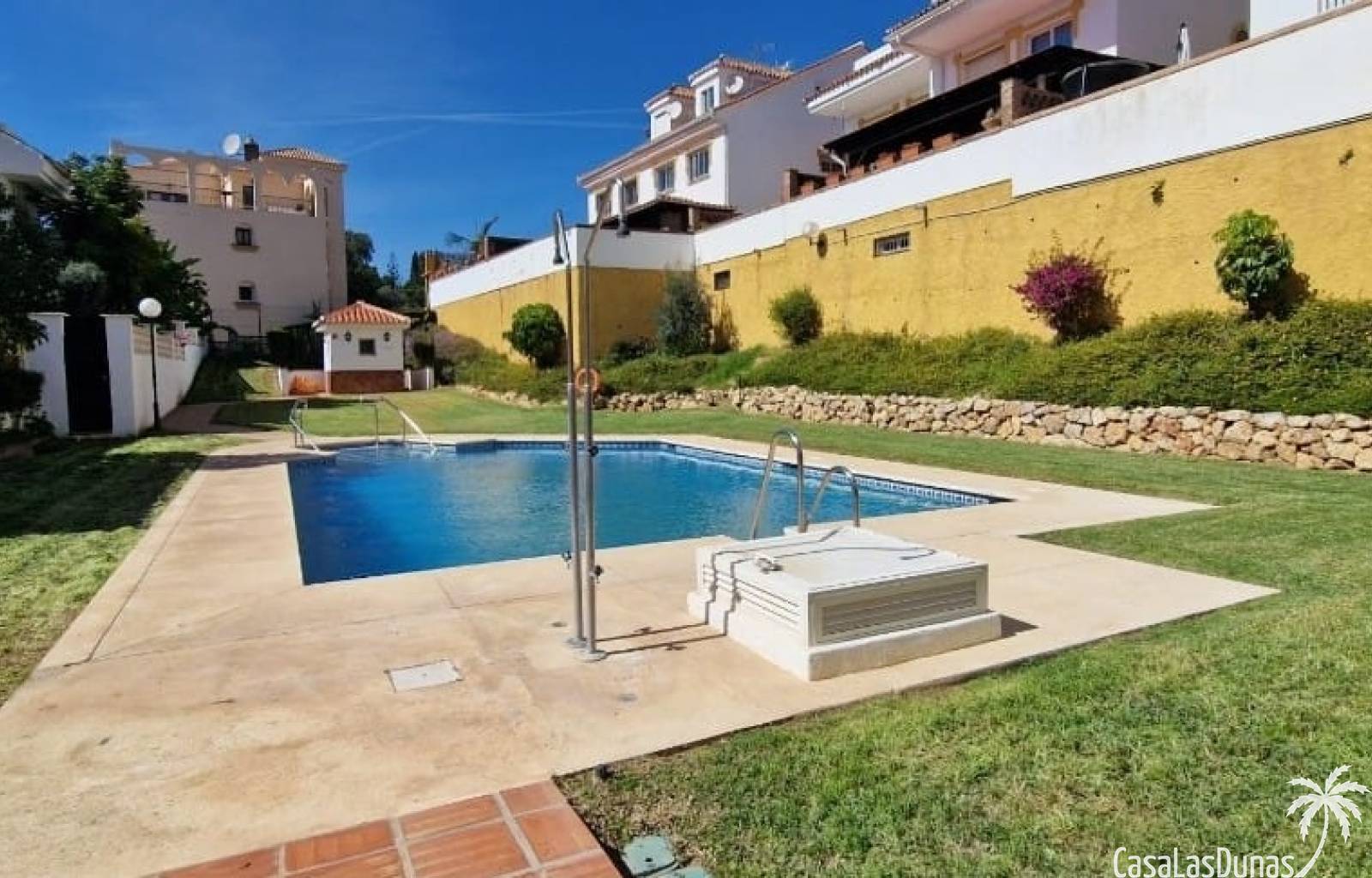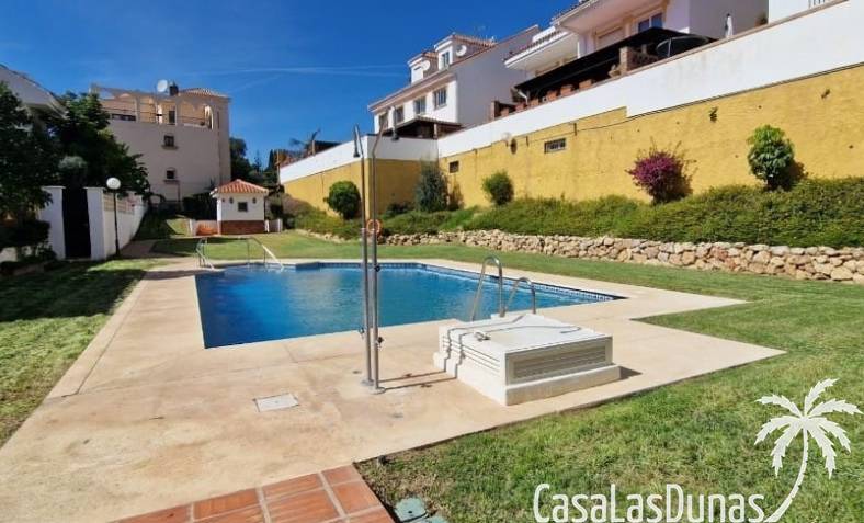 Semi adosado a la venta en La Sierrezuela, Mijas Costa, consta en un salon-comedor con chimenea, una cocina amueblada, 4 dormitorios, 3 baños, un aseo y un patio. Garaje de 60 m². Piscina y jardines comunitarios. Cerca de los servicios.