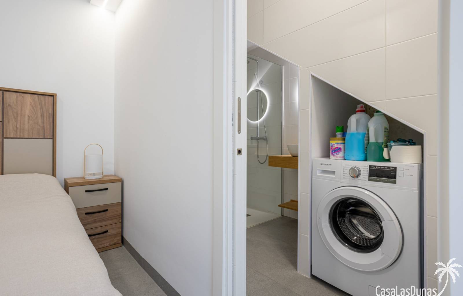 En cuanto al interior, la propiedad cuenta con tres amplios dormitorios, todos con armarios empotrados, y dos modernos baños, uno de ellos en suite con el dormitorio principal. También cuenta con un pequeño lavadero, práctico y discreto. La cocina americana se integra a la perfección con el salón-comedor, creando un espacio acogedor y funcional, ideal tanto para el día a día como para el entretenimiento. La propiedad se encuentra en excelentes condiciones, lista para entrar a vivir, y se vende completamente amueblada, incluyendo electrodomésticos y aire acondicionado para mayor comodidad durante todo el año. En el exterior, esta villa realmente destaca. La propiedad cuenta con una piscina privada rodeada de un jardín bien proporcionado, perfecto para relajarse, tomar el sol o cenar al aire libre. Un porche cubierto ofrece una zona de estar con sombra, mientras que la terraza y el solárium ofrecen espacio adicional para tomar el sol, entretenerse o simplemente relajarse con vistas despejadas y privacidad. Hay una zona de sombra en la planta superior del solárium, junto con una cocina exterior, ideal para barbacoas. La propiedad también incluye una plaza de aparcamiento privado en la parcela y un sistema de intercomunicación para mayor seguridad.