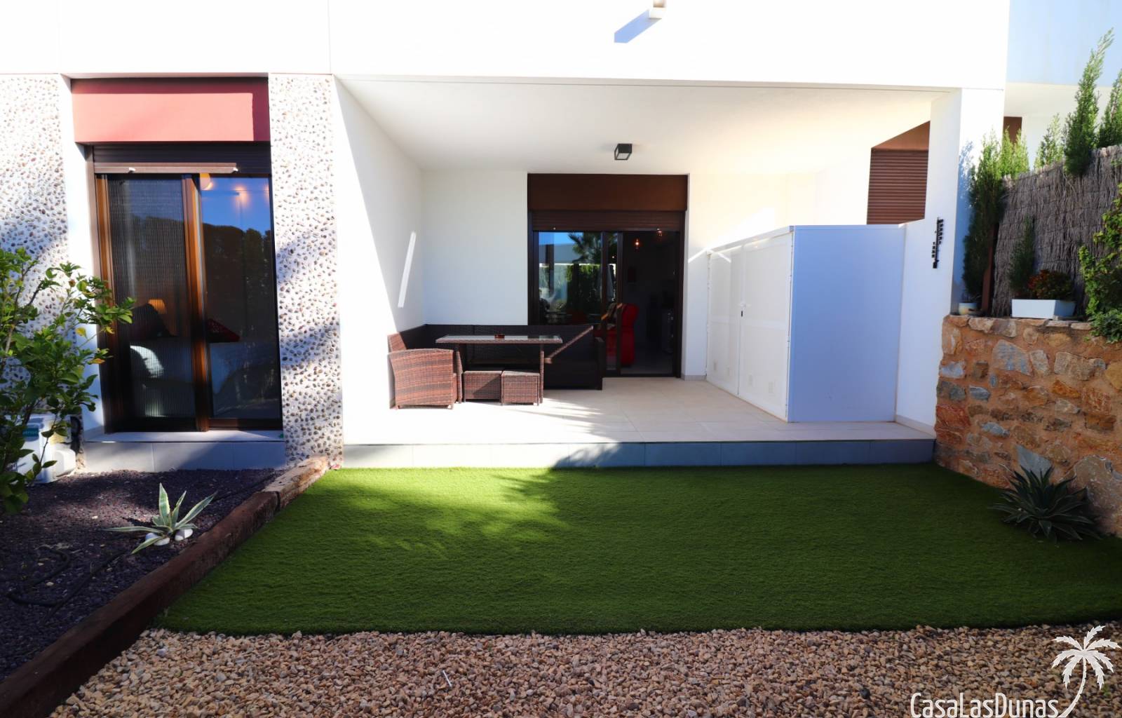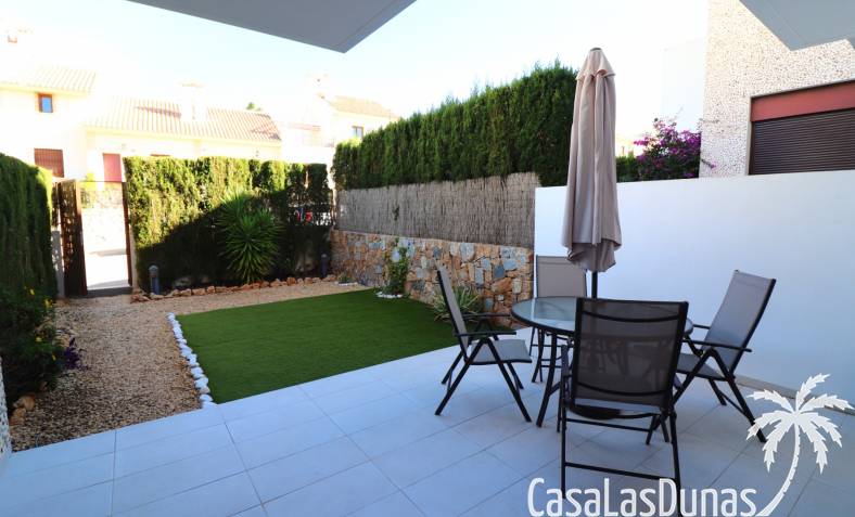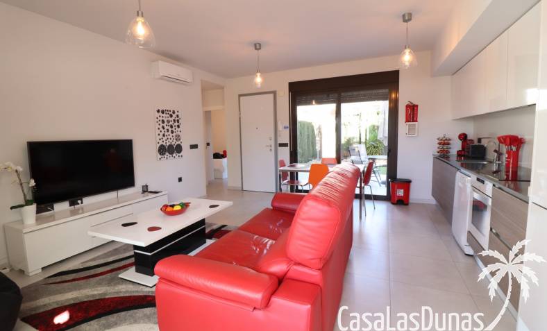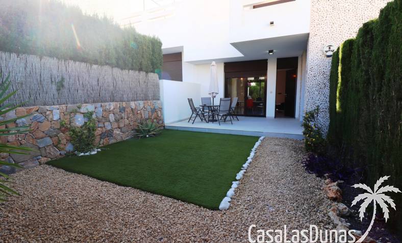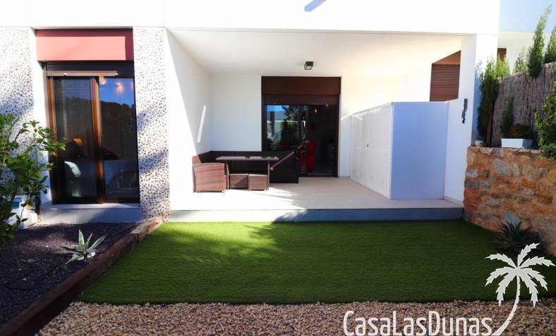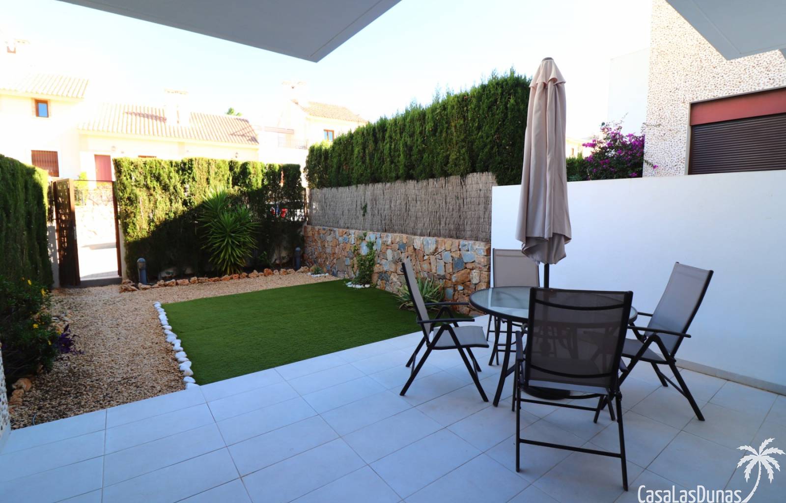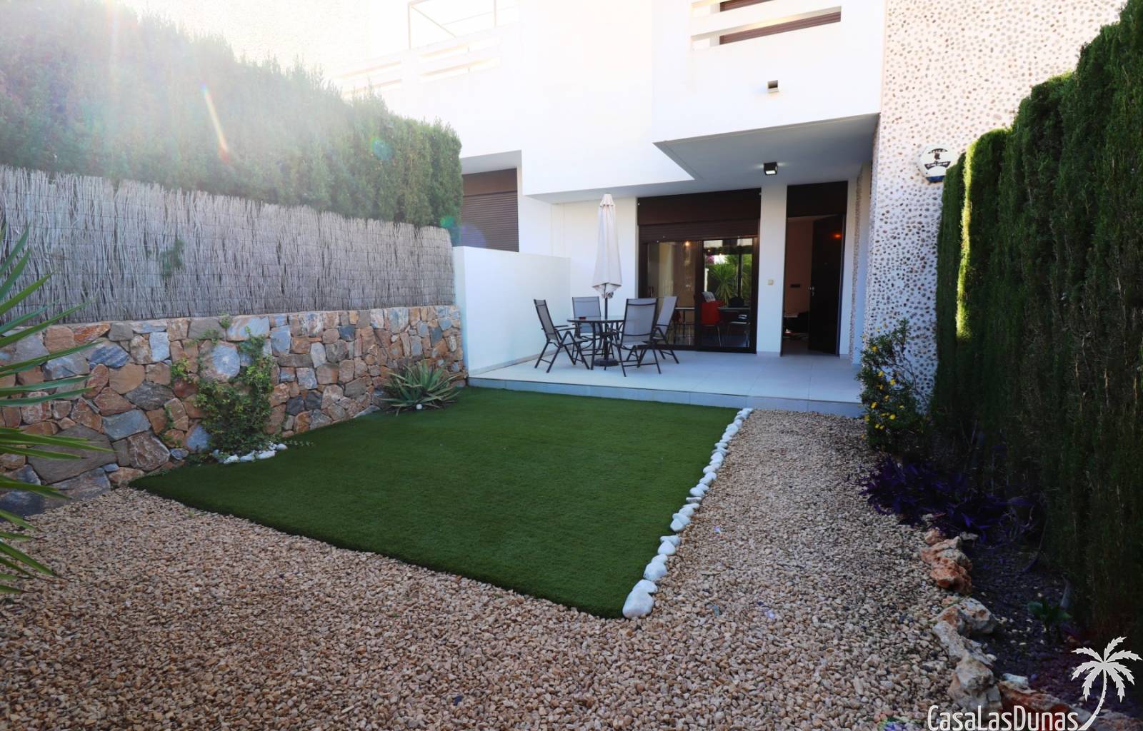 Este apartamento en planta baja de dos dormitorios con orientación oeste en La Finca 5* Hotel, Spa & Golf Resort se encuentra en una de las zonas más prestigiosas de la Costa Blanca Sur. Bares, tiendas y restaurantes están a solo 15 minutos a pie, mientras que el pueblo de Algorfa está a 5 minutos en coche. Las localidades de Almoradí y Benijófar están a unos 10 minutos, y varias playas de la costa, incluyendo Orihuela Costa, están a solo 20 minutos. La propiedad cuenta con un amplio y luminoso salón de planta abierta con puertas correderas de doble acristalamiento que dan al jardín trasero y a la terraza cubierta, además de otras puertas acristaladas que dan al jardín delantero, que también cuenta con una terraza parcialmente cubierta, perfecta para comer al aire libre o relajarse. La moderna cocina equipada es elegante y funcional, complementando el estilo contemporáneo de la vivienda. Hay dos dormitorios dobles, ambos con armarios empotrados y acceso directo al jardín, además de dos modernos cuartos de baño con ducha, uno de ellos en suite con el dormitorio principal. Los jardines están cuidadosamente diseñados con una combinación de baldosas, zonas de guijarros, césped artificial y atractivos bordes de helechos que brindan privacidad. Las características adicionales incluyen aire acondicionado, sistema de riego y acceso a una hermosa piscina comunitaria. Una casa con una ubicación privilegiada y un equipamiento impecable en el exclusivo La Finca Resort, ideal para vacaciones, inversión o residencia permanente en la Costa Blanca Sur.