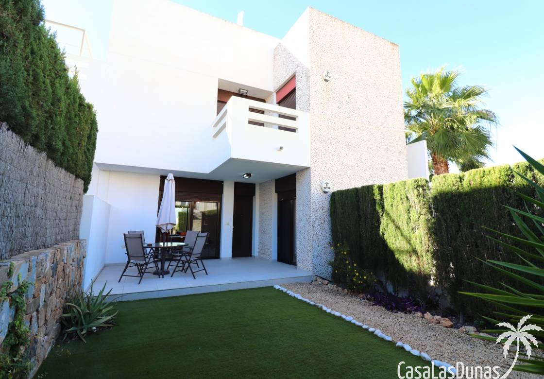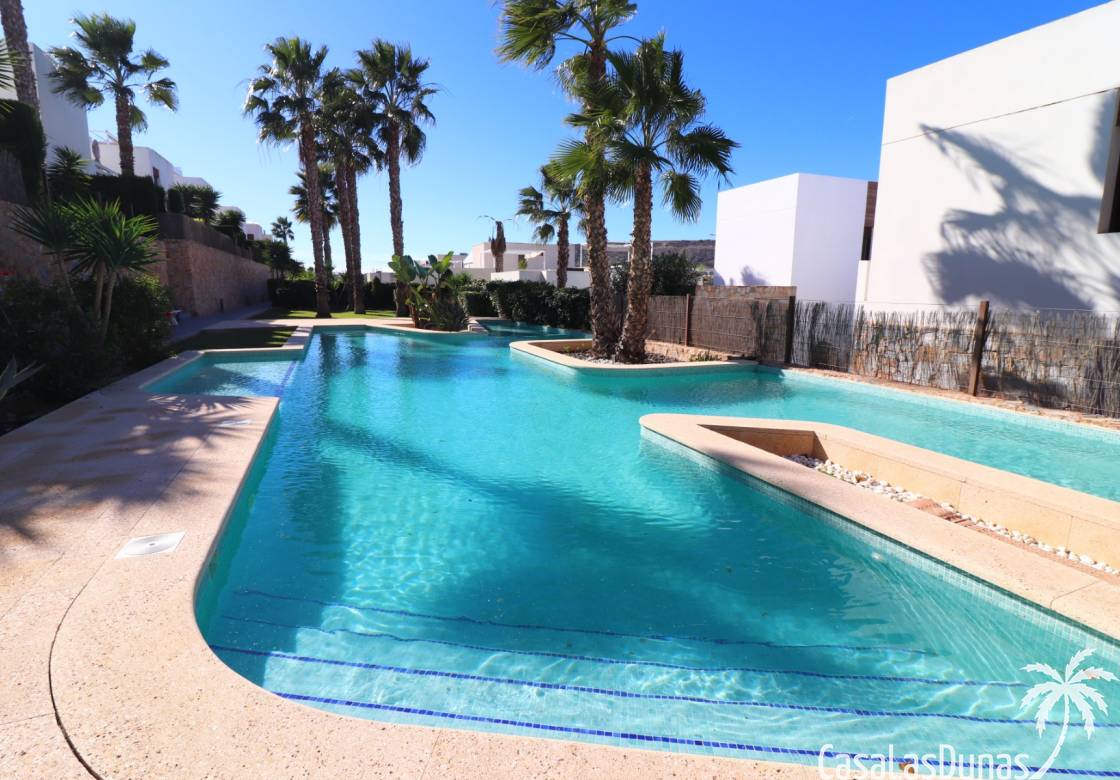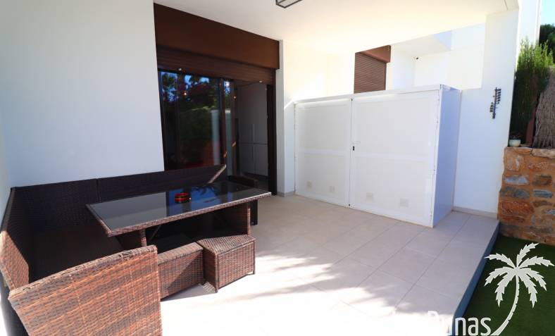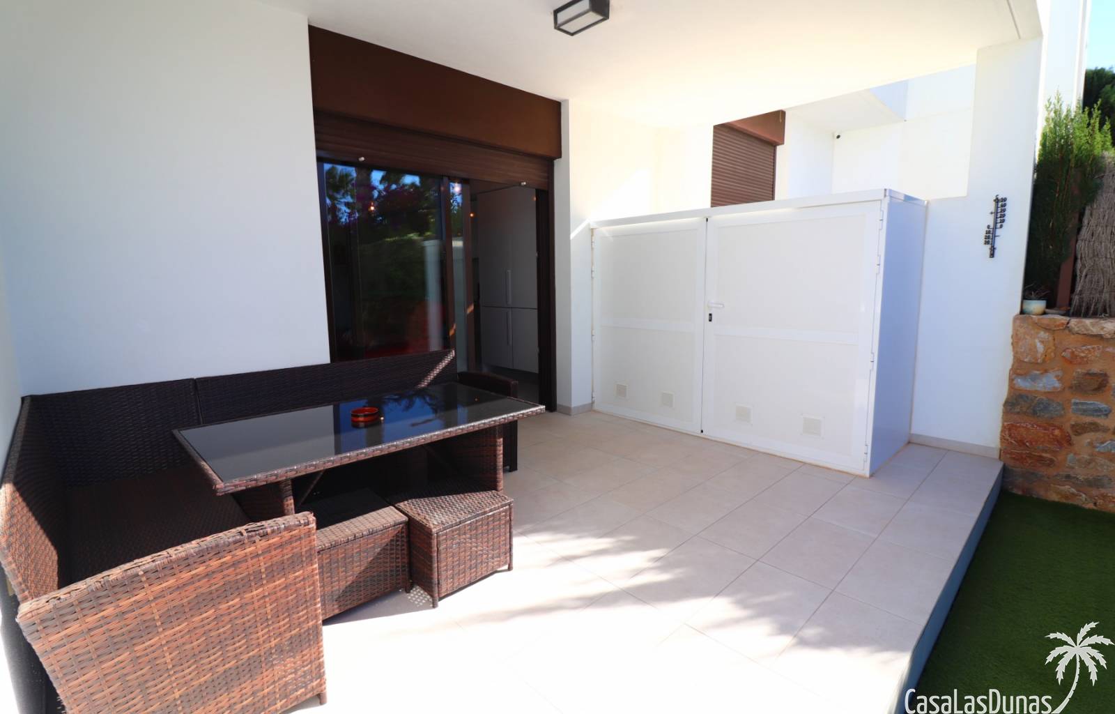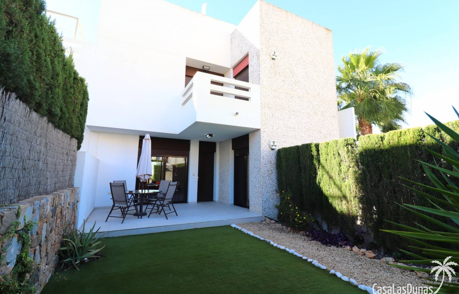 Este apartamento en planta baja de dos dormitorios con orientación oeste en La Finca 5* Hotel, Spa & Golf Resort se encuentra en una de las zonas más prestigiosas de la Costa Blanca Sur. Bares, tiendas y restaurantes están a solo 15 minutos a pie, mientras que el pueblo de Algorfa está a 5 minutos en coche. Las localidades de Almoradí y Benijófar están a unos 10 minutos, y varias playas de la costa, incluyendo Orihuela Costa, están a solo 20 minutos. La propiedad cuenta con un amplio y luminoso salón de planta abierta con puertas correderas de doble acristalamiento que dan al jardín trasero y a la terraza cubierta, además de otras puertas acristaladas que dan al jardín delantero, que también cuenta con una terraza parcialmente cubierta, perfecta para comer al aire libre o relajarse. La moderna cocina equipada es elegante y funcional, complementando el estilo contemporáneo de la vivienda. Hay dos dormitorios dobles, ambos con armarios empotrados y acceso directo al jardín, además de dos modernos cuartos de baño con ducha, uno de ellos en suite con el dormitorio principal. Los jardines están cuidadosamente diseñados con una combinación de baldosas, zonas de guijarros, césped artificial y atractivos bordes de helechos que brindan privacidad. Las características adicionales incluyen aire acondicionado, sistema de riego y acceso a una hermosa piscina comunitaria. Una casa con una ubicación privilegiada y un equipamiento impecable en el exclusivo La Finca Resort, ideal para vacaciones, inversión o residencia permanente en la Costa Blanca Sur.