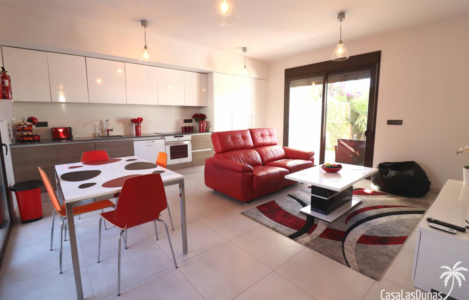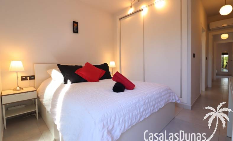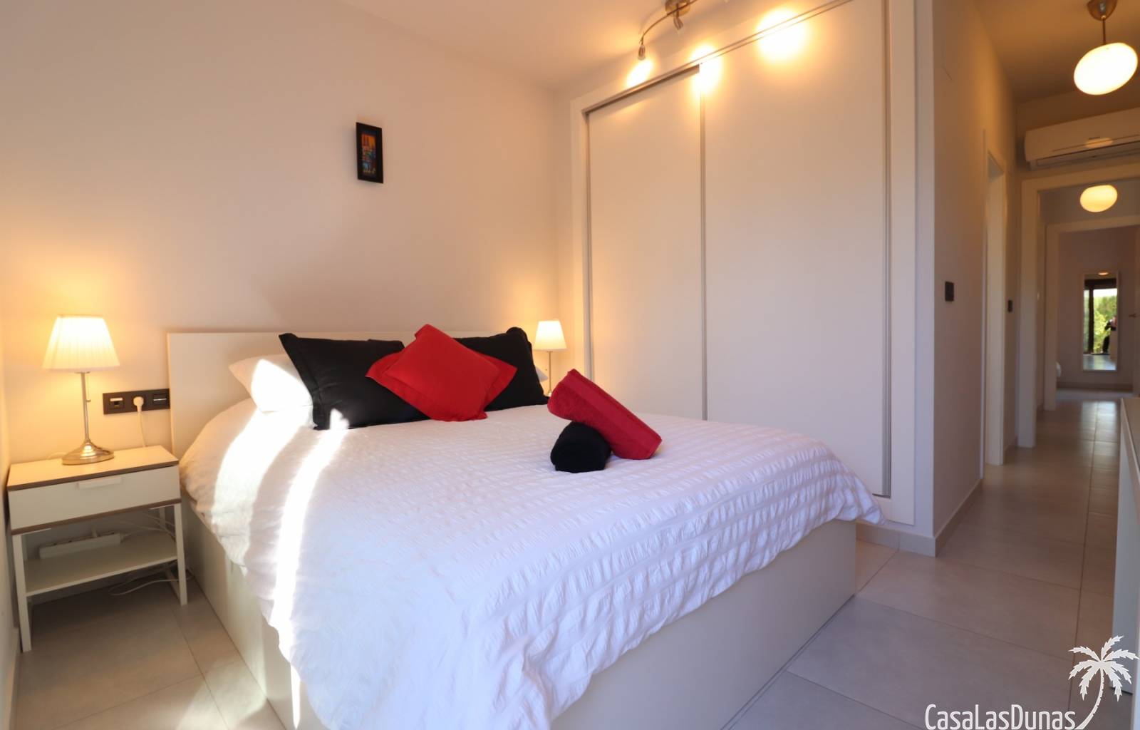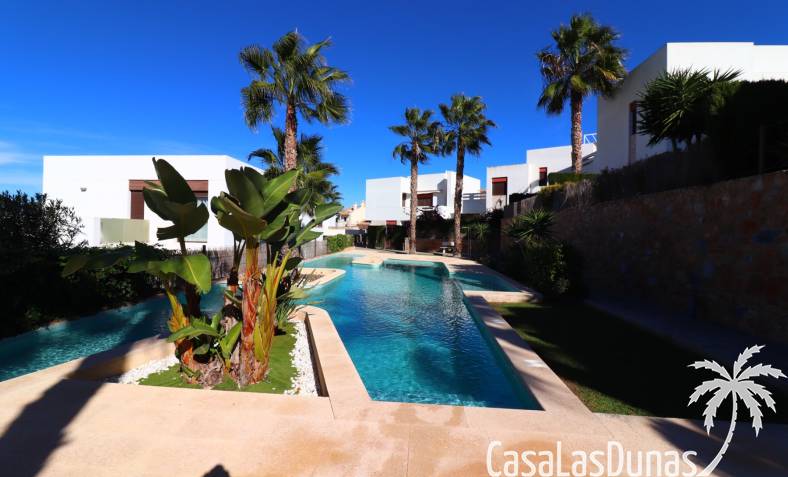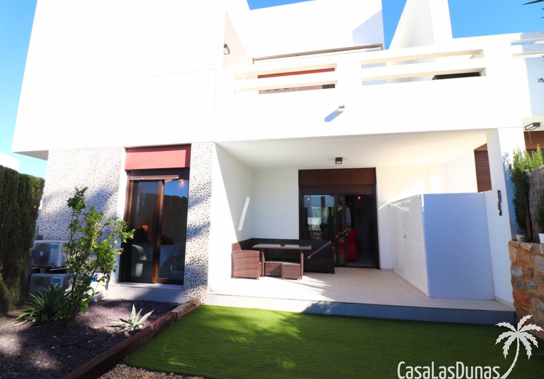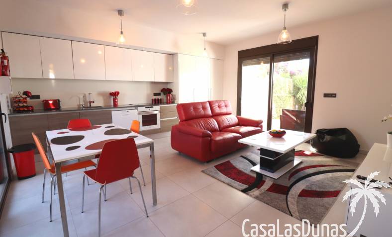 Este apartamento en planta baja de dos dormitorios con orientación oeste en La Finca 5* Hotel, Spa & Golf Resort se encuentra en una de las zonas más prestigiosas de la Costa Blanca Sur. Bares, tiendas y restaurantes están a solo 15 minutos a pie, mientras que el pueblo de Algorfa está a 5 minutos en coche. Las localidades de Almoradí y Benijófar están a unos 10 minutos, y varias playas de la costa, incluyendo Orihuela Costa, están a solo 20 minutos. La propiedad cuenta con un amplio y luminoso salón de planta abierta con puertas correderas de doble acristalamiento que dan al jardín trasero y a la terraza cubierta, además de otras puertas acristaladas que dan al jardín delantero, que también cuenta con una terraza parcialmente cubierta, perfecta para comer al aire libre o relajarse. La moderna cocina equipada es elegante y funcional, complementando el estilo contemporáneo de la vivienda. Hay dos dormitorios dobles, ambos con armarios empotrados y acceso directo al jardín, además de dos modernos cuartos de baño con ducha, uno de ellos en suite con el dormitorio principal. Los jardines están cuidadosamente diseñados con una combinación de baldosas, zonas de guijarros, césped artificial y atractivos bordes de helechos que brindan privacidad. Las características adicionales incluyen aire acondicionado, sistema de riego y acceso a una hermosa piscina comunitaria. Una casa con una ubicación privilegiada y un equipamiento impecable en el exclusivo La Finca Resort, ideal para vacaciones, inversión o residencia permanente en la Costa Blanca Sur.