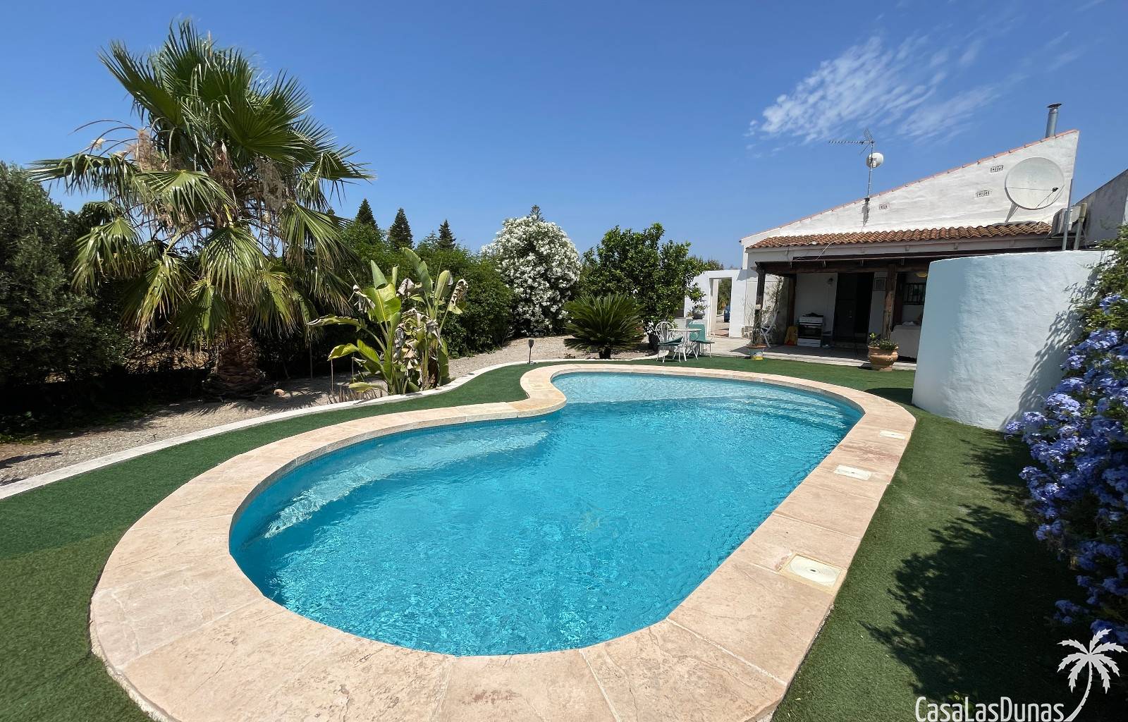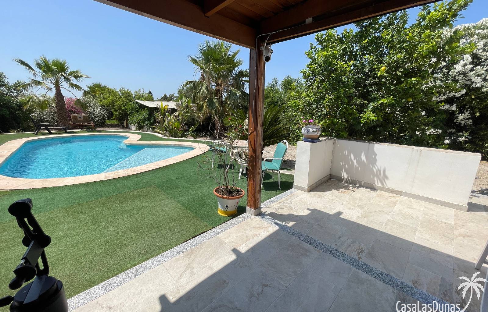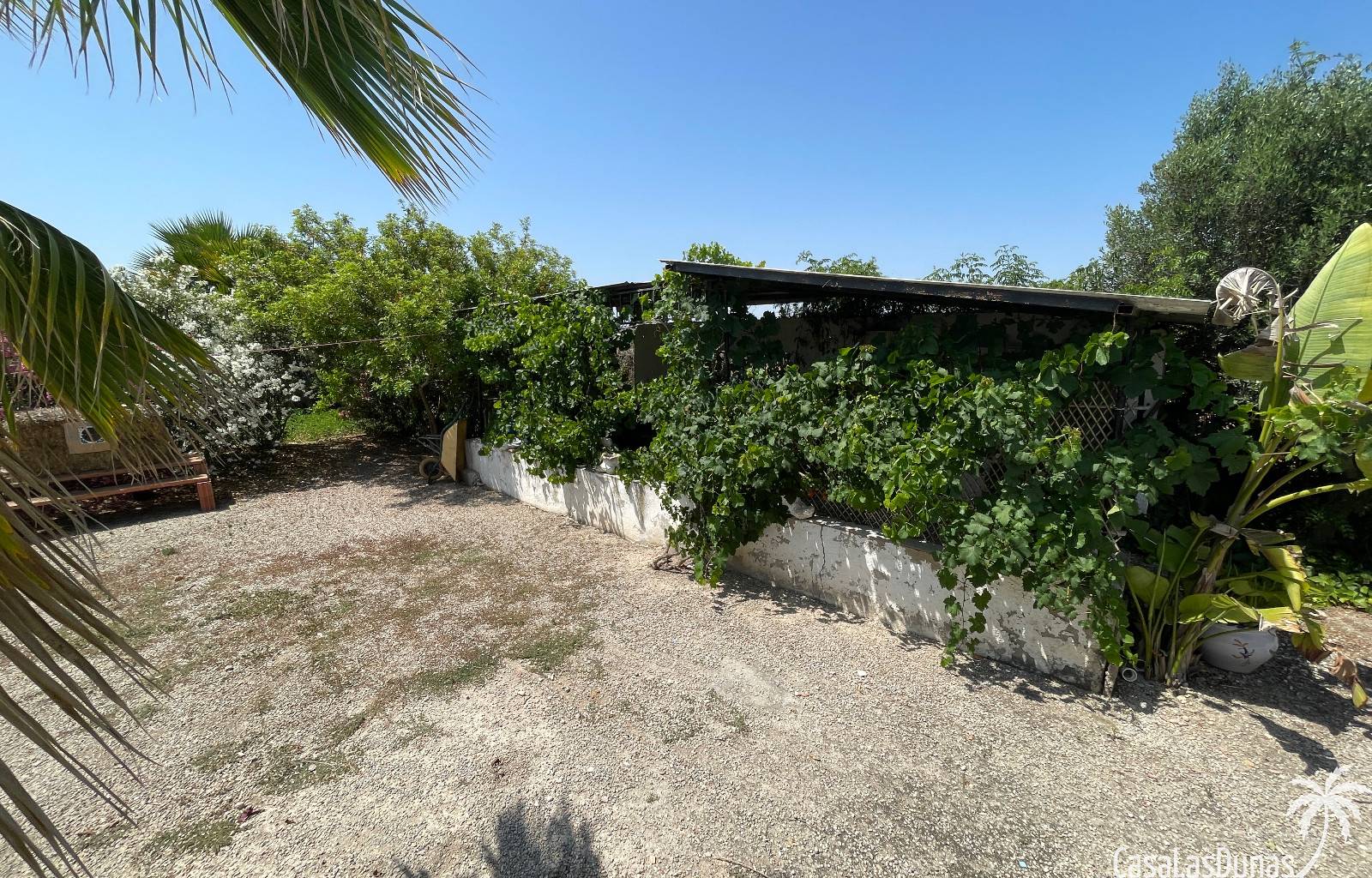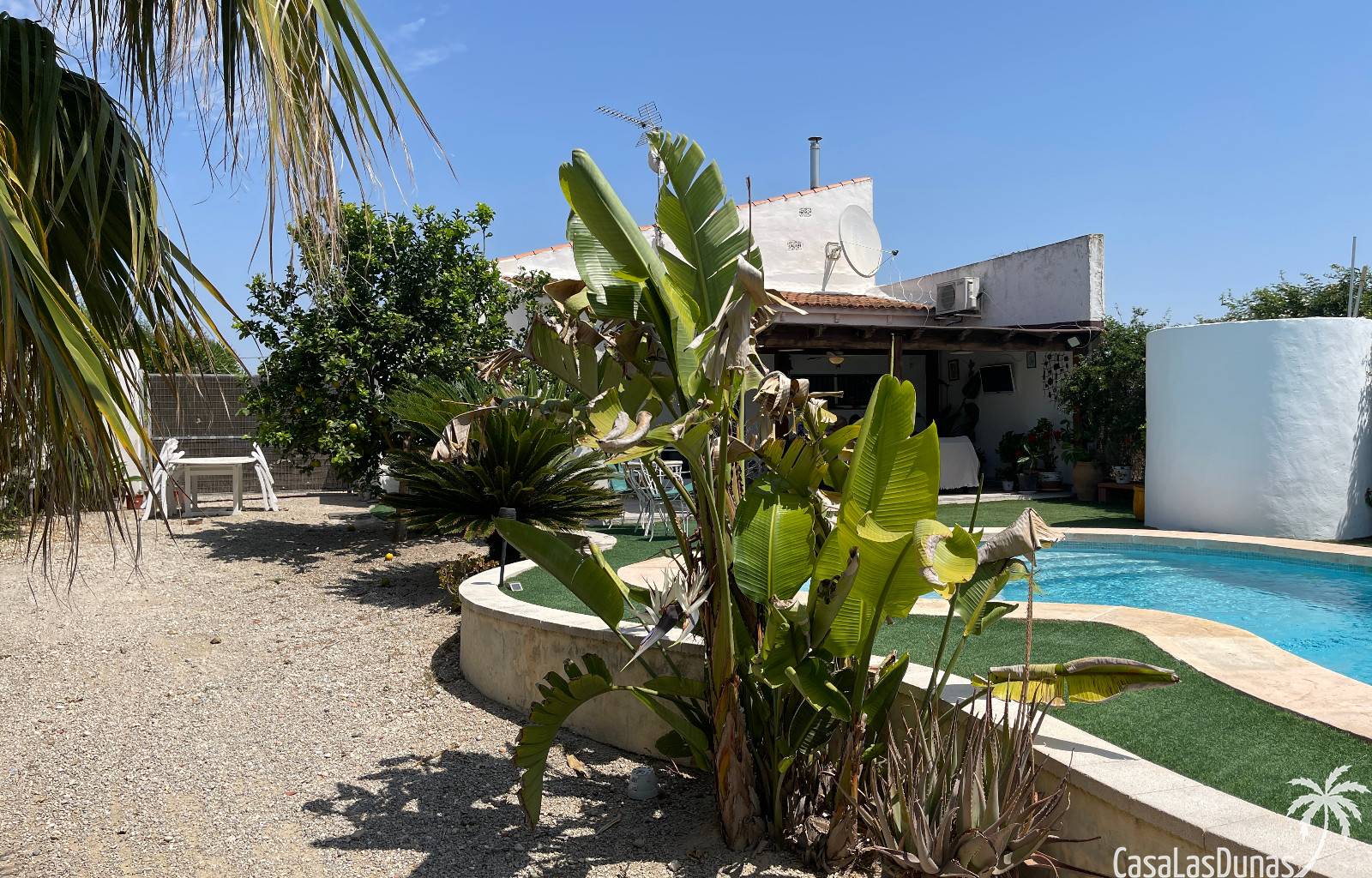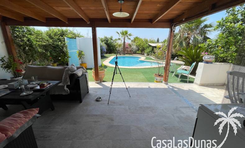 En el exterior, encontrarás una preciosa piscina privada, jardines cuidados con árboles variados y frutales, además de plantas ornamentales que embellecen toda la finca. Hay también una terraza cubierta ideal para disfrutar del aire libre durante todo el año.