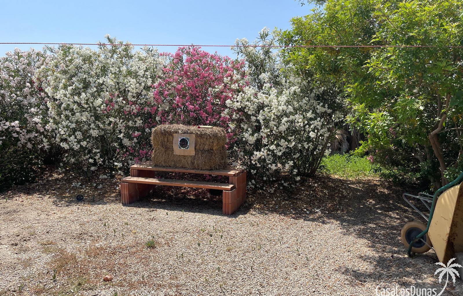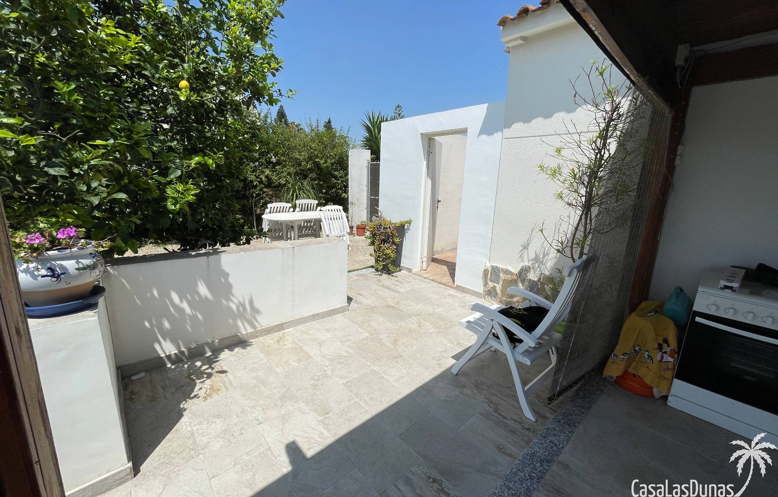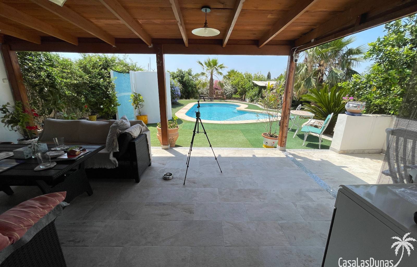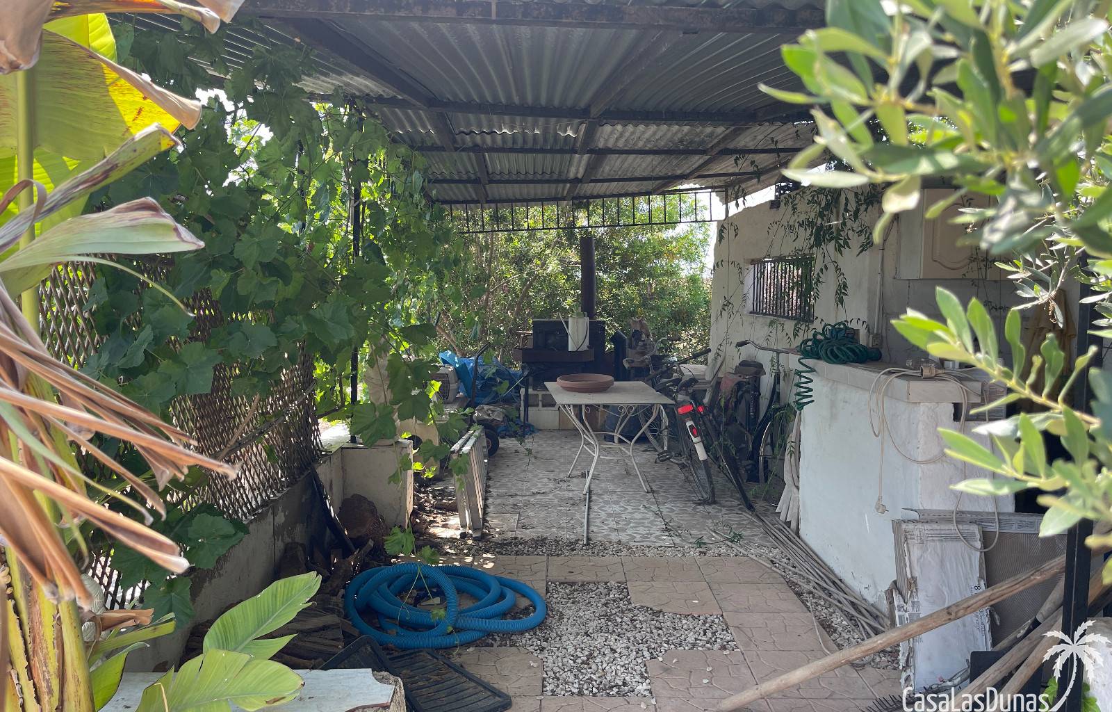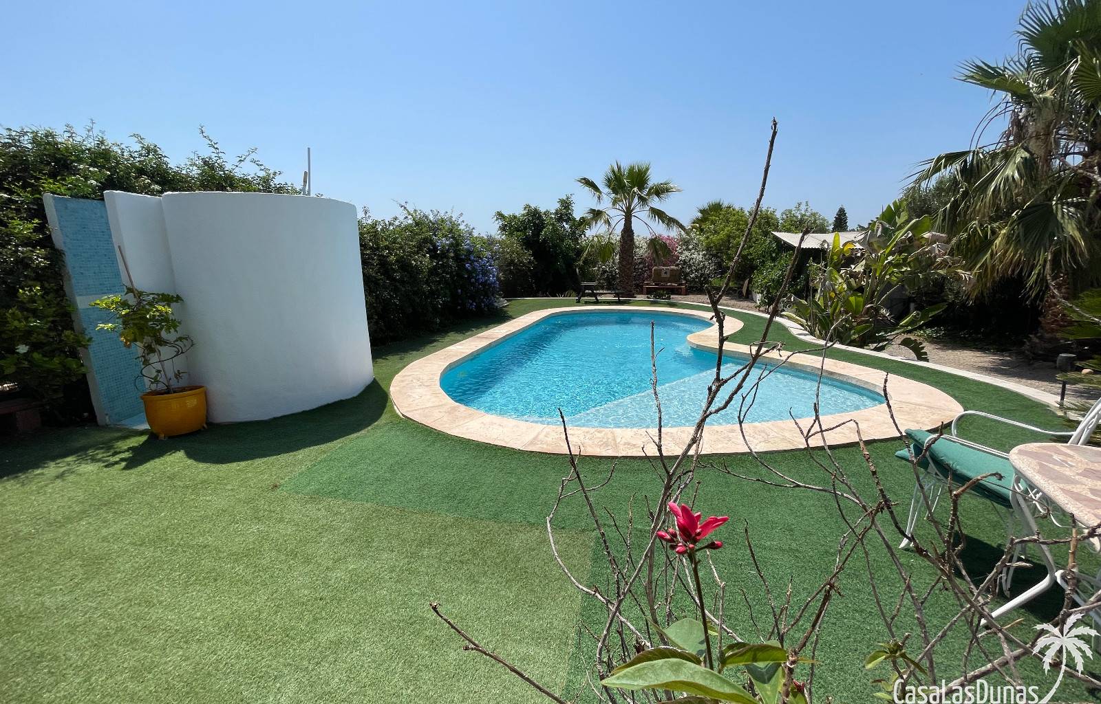 En el exterior, encontrarás una preciosa piscina privada, jardines cuidados con árboles variados y frutales, además de plantas ornamentales que embellecen toda la finca. Hay también una terraza cubierta ideal para disfrutar del aire libre durante todo el año.