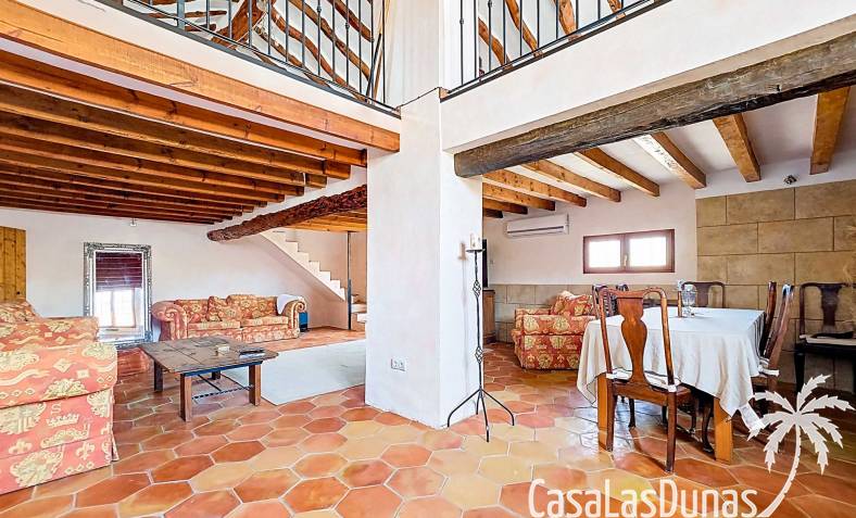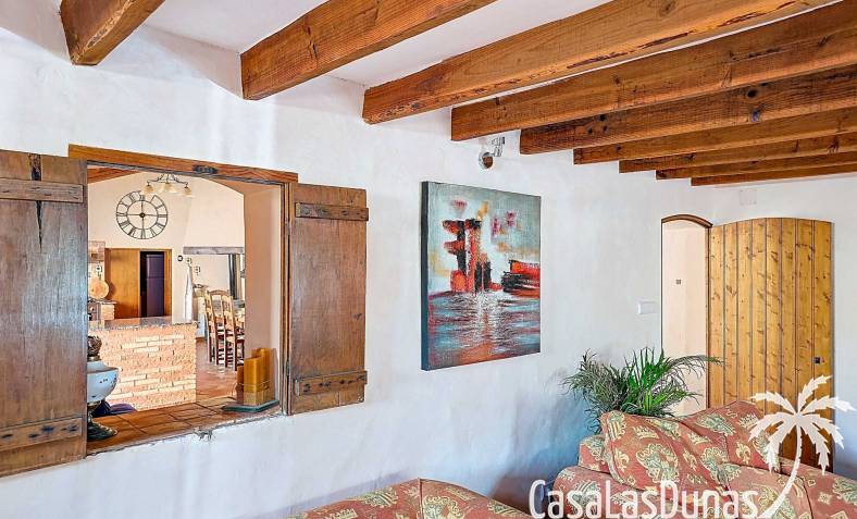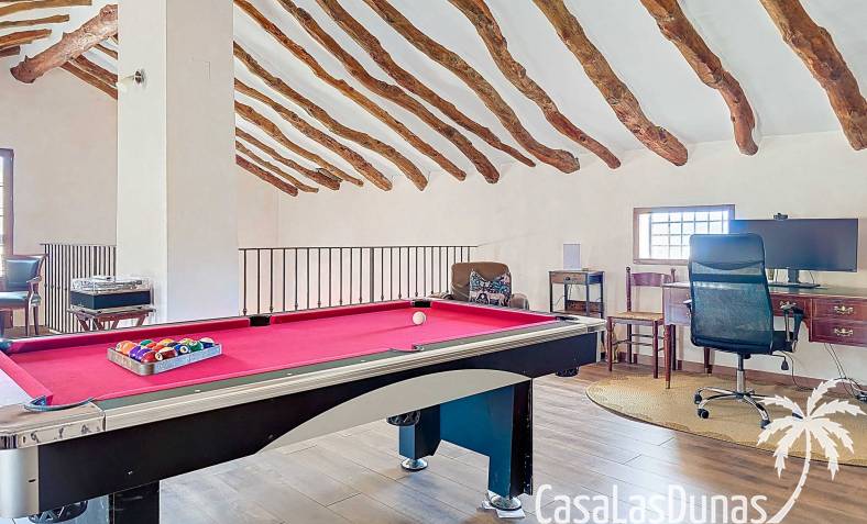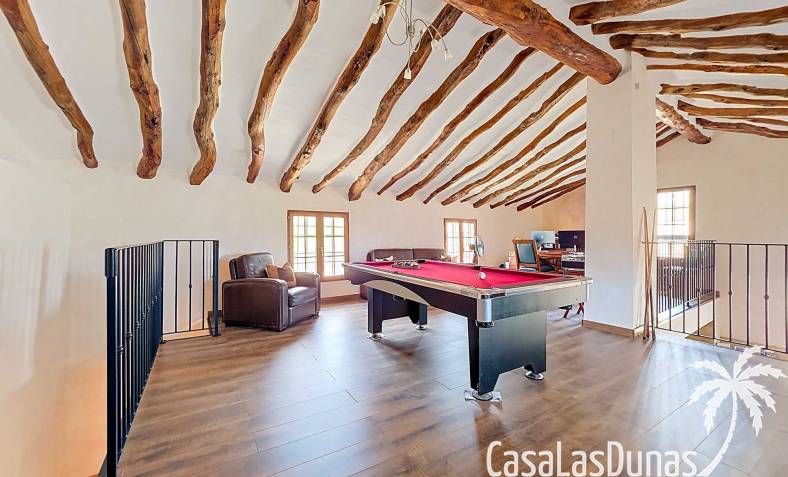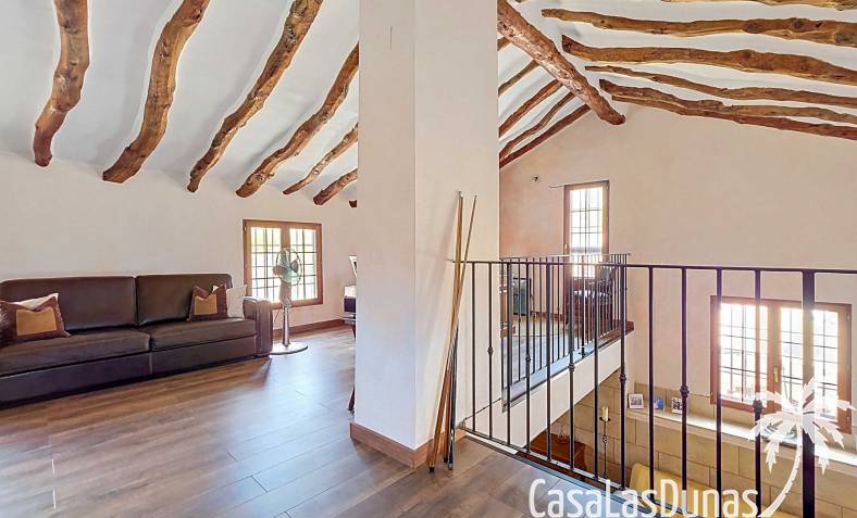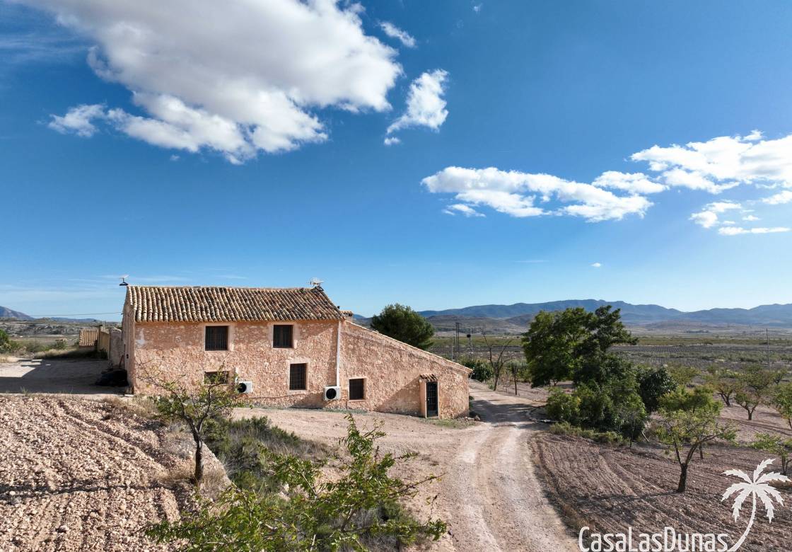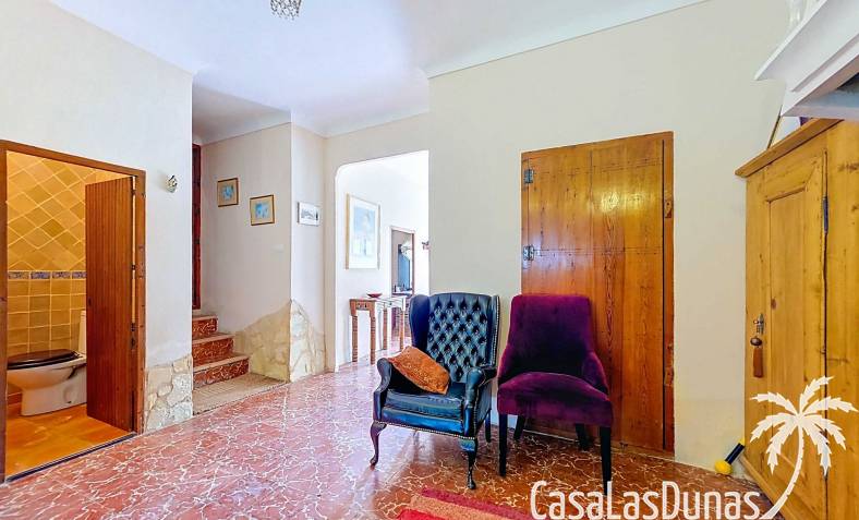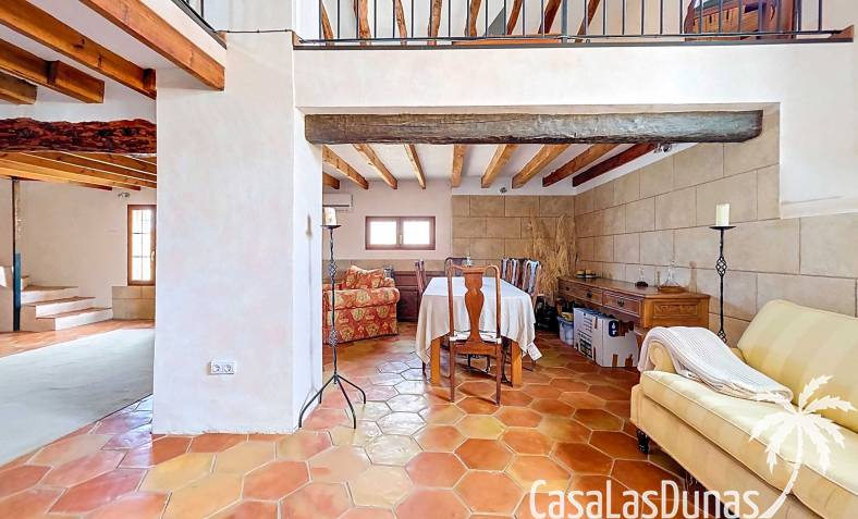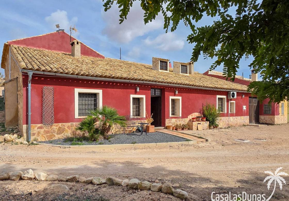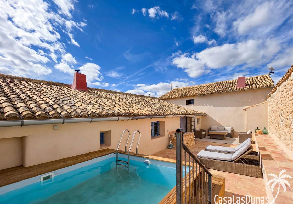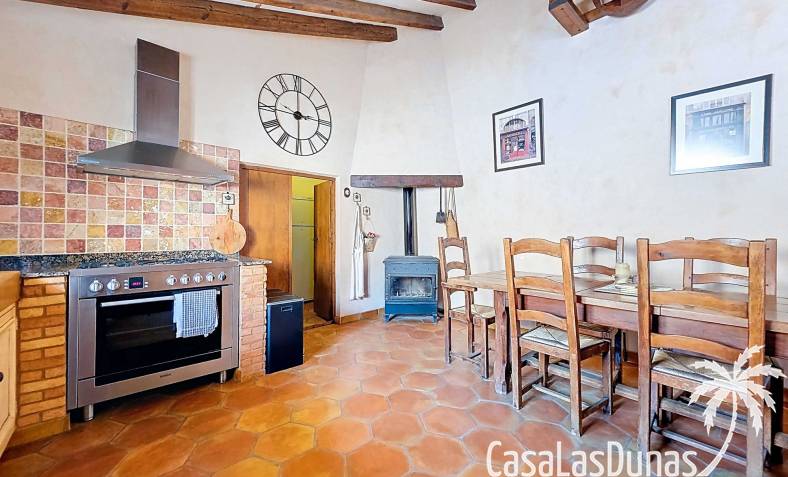 Amplia casa de campo, restaurada y modernizada conservando su carácter auténtico A los pies de la Sierra del Carche, rodeada de viñedos y campos de almendros y olivos, se encuentra esta excepcional y amplia casa de campo. Antiguamente una bodega con establos, ha sido restaurada con esmero por la familia de los actuales propietarios, utilizando materiales naturales. Se han conservado los suelos, puertas y detalles originales antiguos. Se han reutilizado baldosas de terracota y se han restaurado, tratado y nutrido con aceites naturales casi 150 vigas de madera. Toda la restauración se llevó a cabo bajo un principio: mantener la esencia de la casa y, al mismo tiempo, hacerla habitable y práctica. La distribución fue diseñada para que las estancias fluyan de manera natural. El resultado es una vivienda en la que cada persona dispone de su propio espacio generoso, pero que a la vez se siente auténtica, acogedora y equilibrada pese a sus amplias dimensiones. Esta vivienda está en venta en exclusiva, lo que significa que todos los documentos han sido revisados previamente y que todo está en orden o se puede regularizar. La vivienda La casa se distribuye en varios niveles. Desde la entrada se accede a un amplio pasillo con un dormitorio a cada lado. El pasillo desemboca en una gran estancia con zona de estar y chimenea. Aquí también hay un baño independiente y acceso a un dormitorio espacioso con baño en suite. El techo alto de esta habitación es un verdadero punto de atracción, y cuenta con armarios empotrados. Desde la zona de estar hay acceso tanto a una parte superior como a una inferior de la casa. En el nivel superior se encuentra una gran cocina-comedor con despensa y estufa de leña, además de acceso a la zona exterior recientemente reformada con piscina tipo plunge, perfecta para disfrutar del sol español con total privacidad. Desde la cocina —que también dispone de una zona de estar— se accede a un enorme salón que conecta con un segundo salón en un nivel superior (suelo renovado en 2025 y con techo aislado). Por supuesto, estas estancias pueden destinarse a otros usos. Desde la cocina, una escalera y un pasillo conducen a otro dormitorio con baño propio (con bañera y ducha). En la parte inferior (al nivel de la entrada) hay un salón con estufa y un horno de pan original, un dormitorio y otro baño privado. Garaje / trastero Adosado a la vivienda hay un amplio garaje o zona de almacenamiento/taller. Gracias a su entrada independiente, podría convertirse fácilmente en oficina, estudio o gimnasio. Instalaciones Toda la casa cuenta con gruesos muros tradicionales que ayudan a mantener una temperatura interior estable. Además de las estufas, hay calefacción eléctrica en los dormitorios y aire acondicionado (frío/calor). Gran parte de la vivienda tiene doble acristalamiento. Está conectada a la red de agua y electricidad. En 2025 se instalaron dos termos nuevos. Ubicación La casa se encuentra en una pequeña y tranquila pedanía entre Pinoso y Jumilla, una preciosa zona rural donde aún se respira la auténtica vida española. Tanto en Pinoso como en Jumilla encontrará todos los servicios diarios: supermercados, colegios, centro médico, instalaciones deportivas y una amplia oferta de restaurantes. Los alrededores ofrecen numerosas rutas para caminar, hacer senderismo o ciclismo, en un entorno de almendros, olivos y viñedos, bajo un agradable clima mediterráneo. Los aeropuertos de Alicante y Murcia, así como las playas, están a menos de una hora en coche. Esta espaciosa vivienda con cinco dormitorios, cuatro baños, varias zonas de estar, garaje y un fantástico espacio exterior está lista para recibir a sus nuevos propietarios, amantes de las casas con carácter y del confort moderno. ¡Contáctenos hoy para concertar una visita!