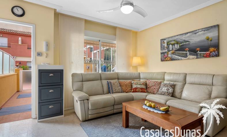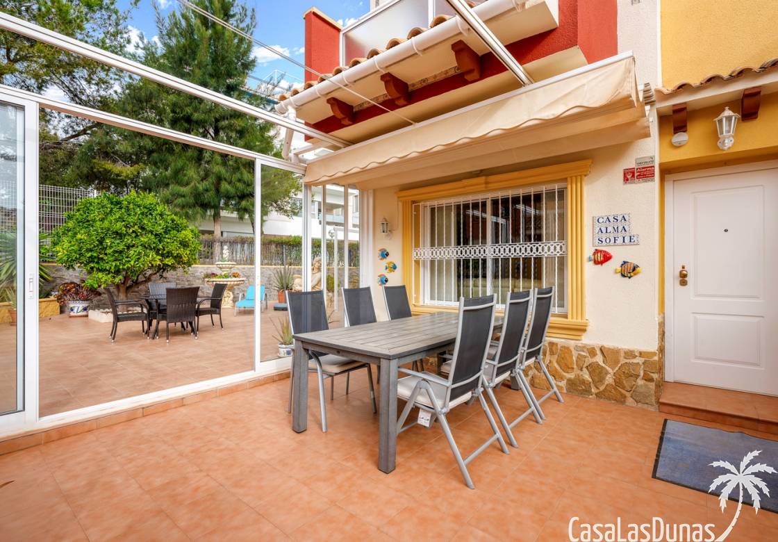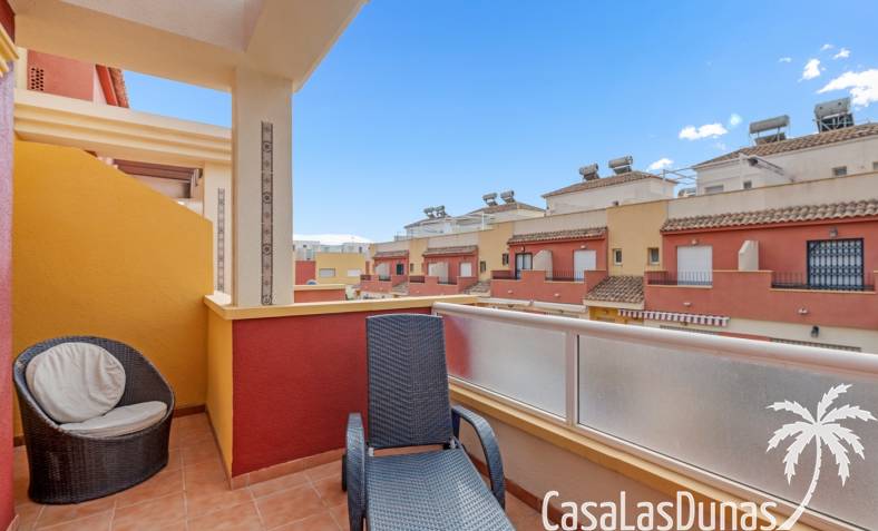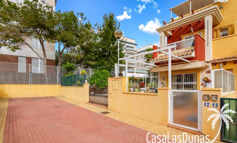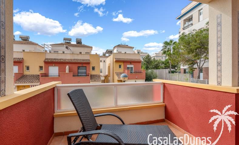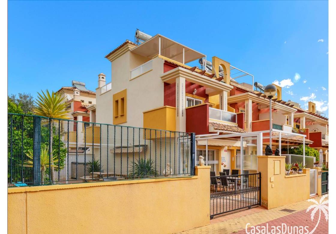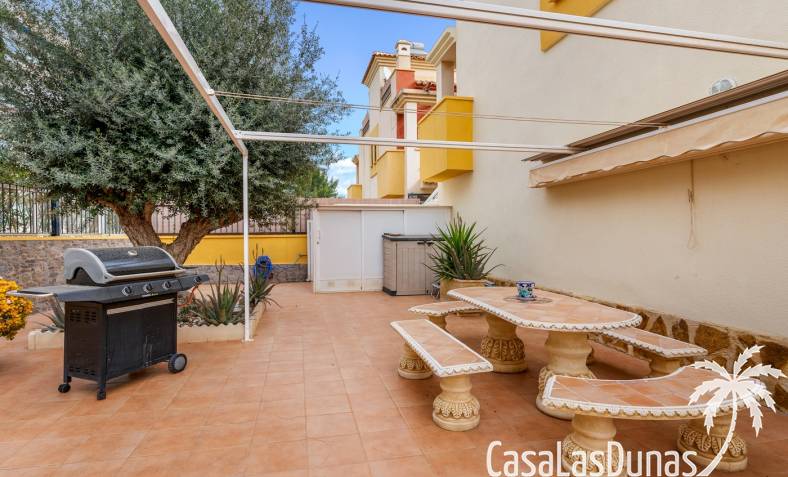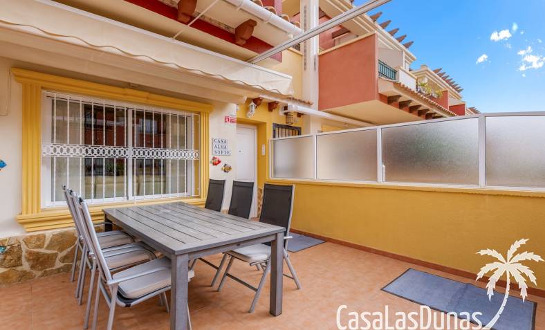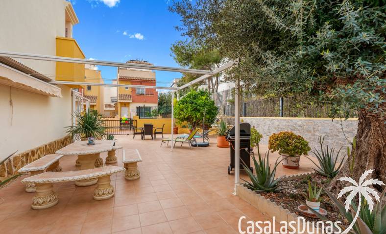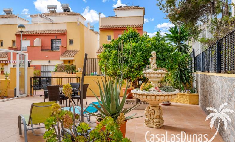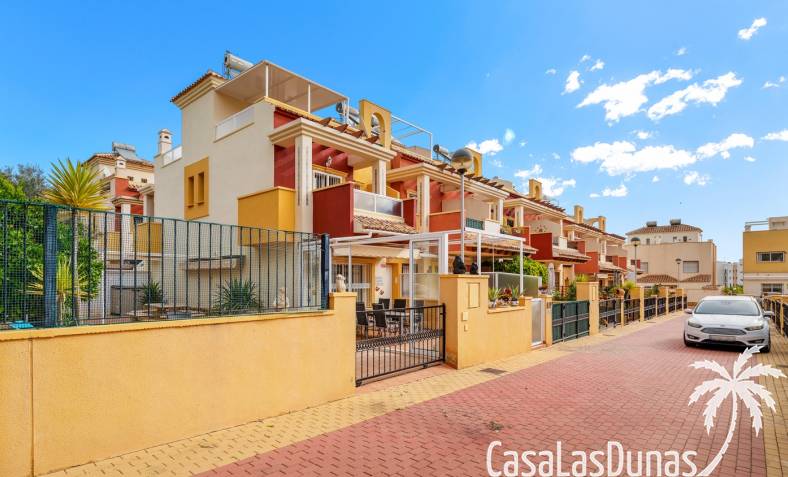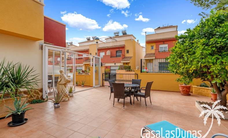 Casa adosada en esquina con una amplia parcela de más de 200 m²Orientación sur (sol todo el día)3 dormitorios / 2 baños1 dormitorio en la planta bajaCocina independiente totalmente equipada + patio cerradoBalcones privados para los dos dormitorios de la planta superiorSolarium privado en la azoteaComunidad cerradaPiscina comunitariaUbicación privilegiada en VillamartínA minutos de La Zenia Boulevard