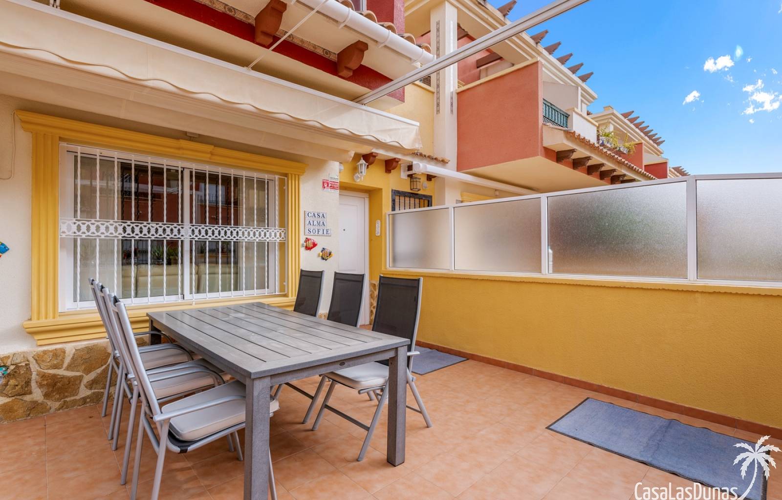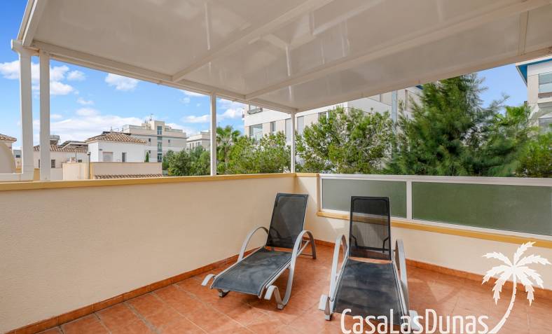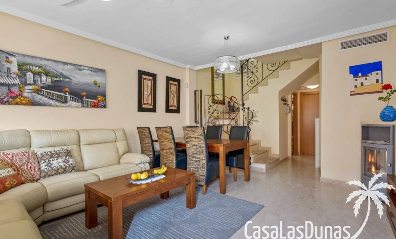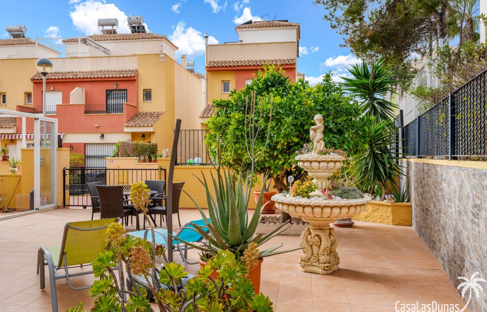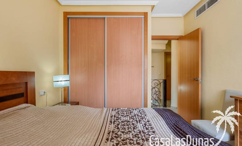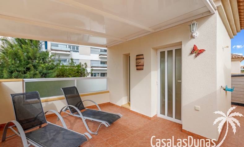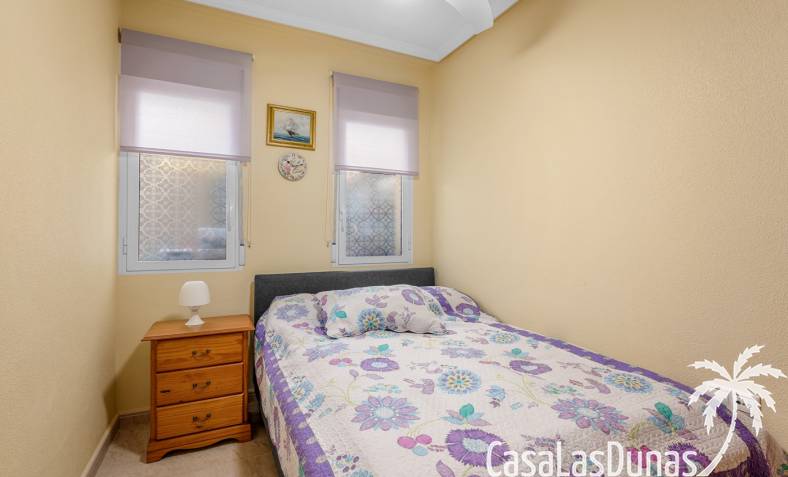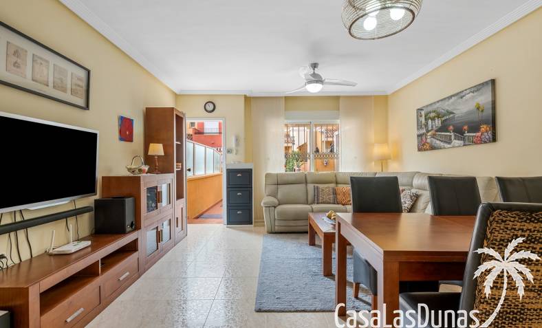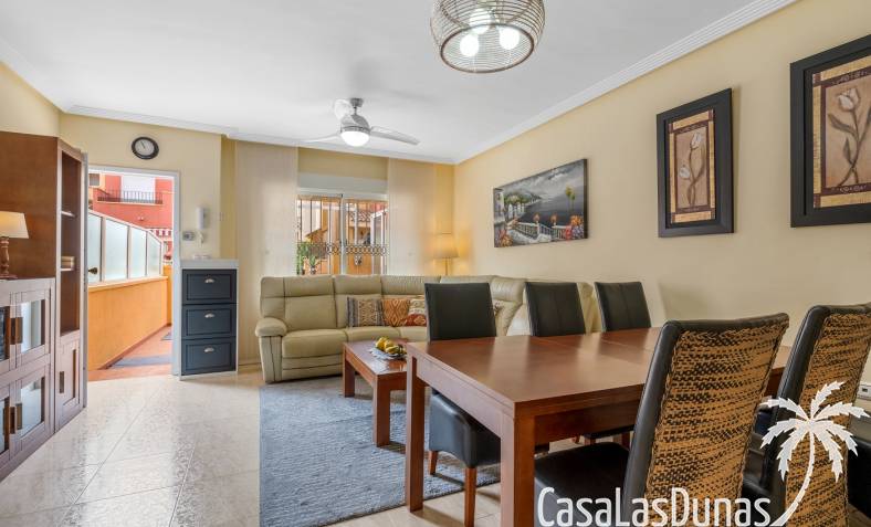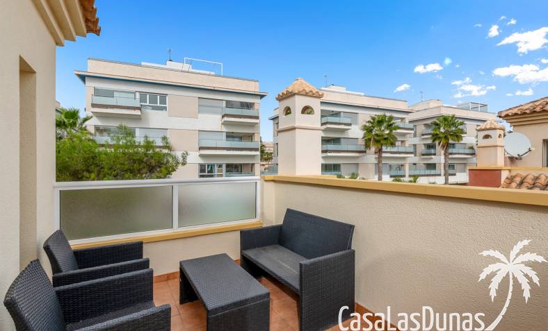Casa adosada en esquina con una amplia parcela de más de 200 m²Orientación sur (sol todo el día)3 dormitorios / 2 baños1 dormitorio en la planta bajaCocina independiente totalmente equipada + patio cerradoBalcones privados para los dos dormitorios de la planta superiorSolarium privado en la azoteaComunidad cerradaPiscina comunitariaUbicación privilegiada en VillamartínA minutos de La Zenia Boulevard