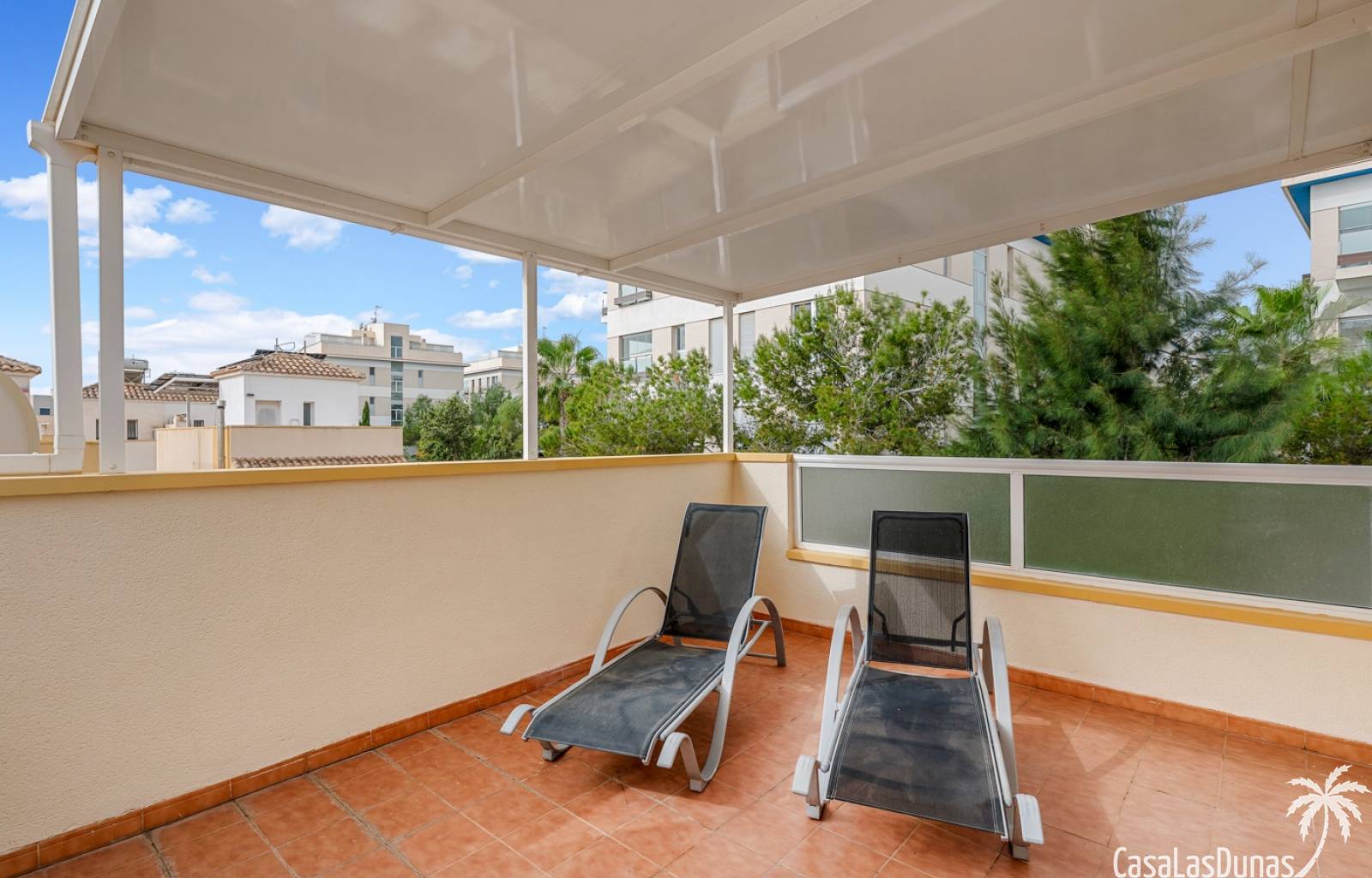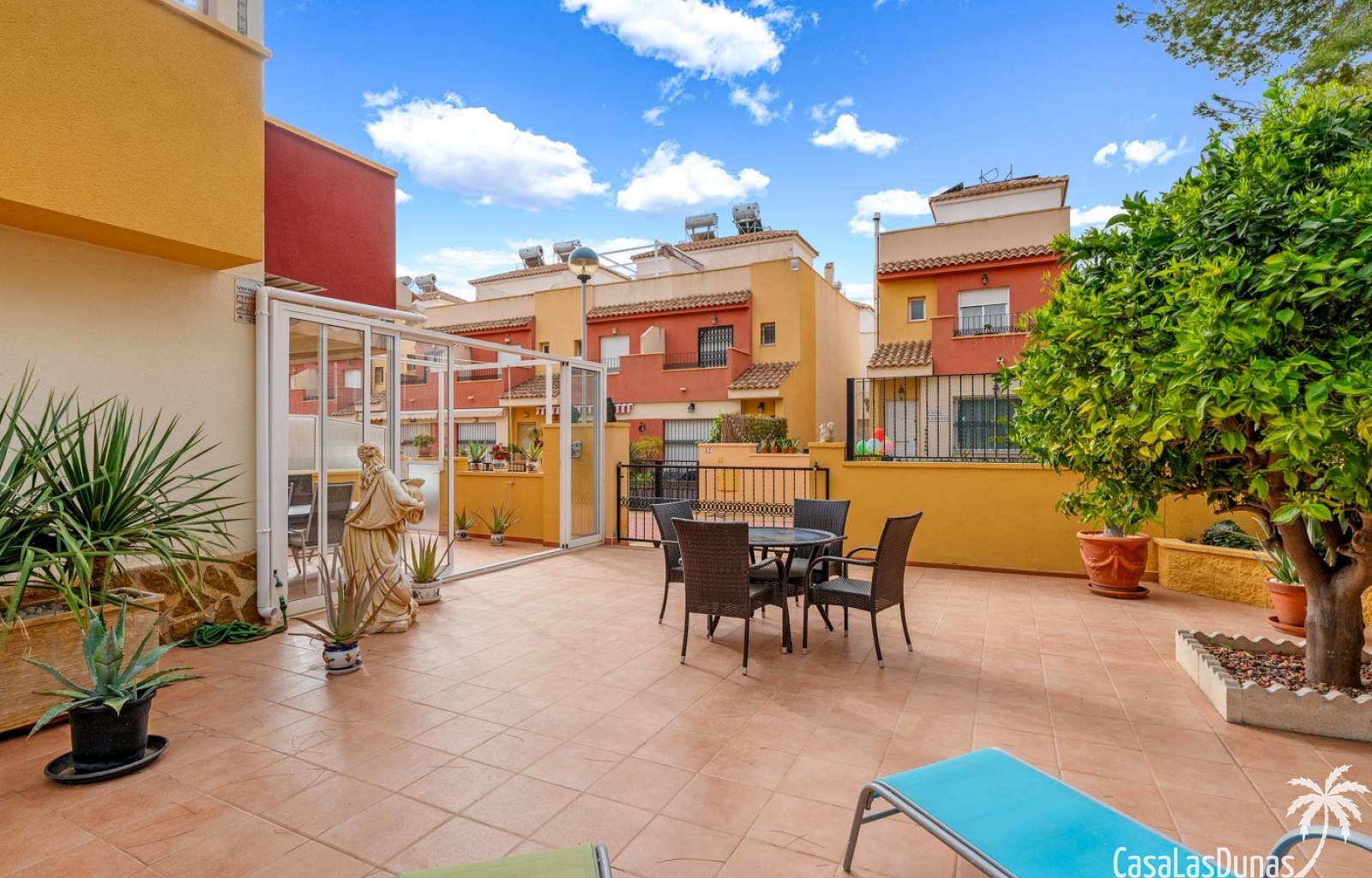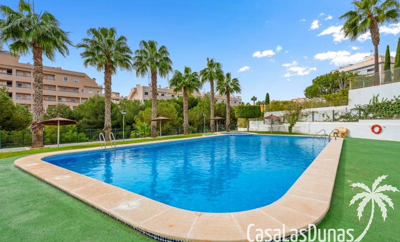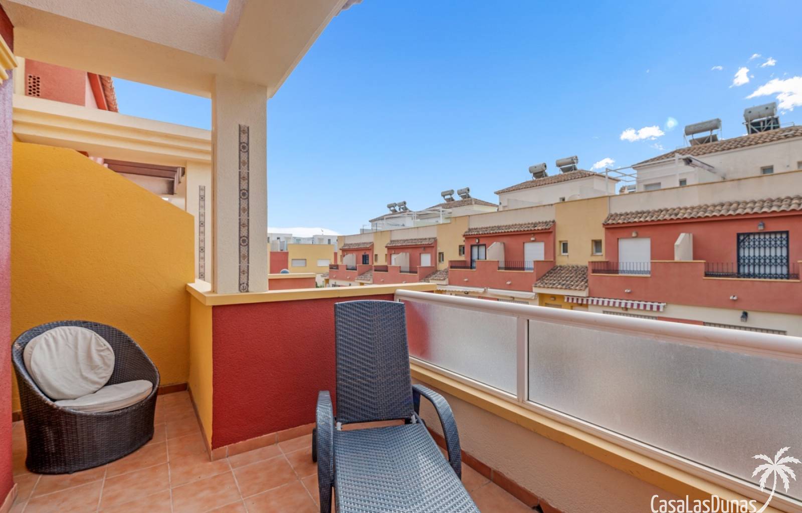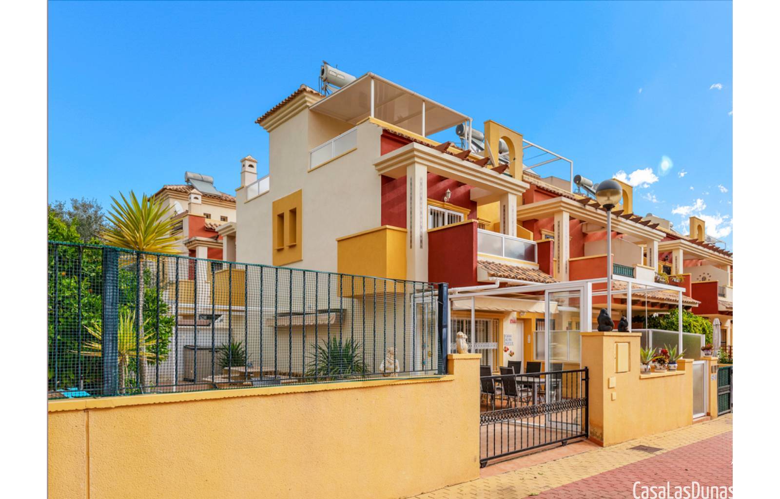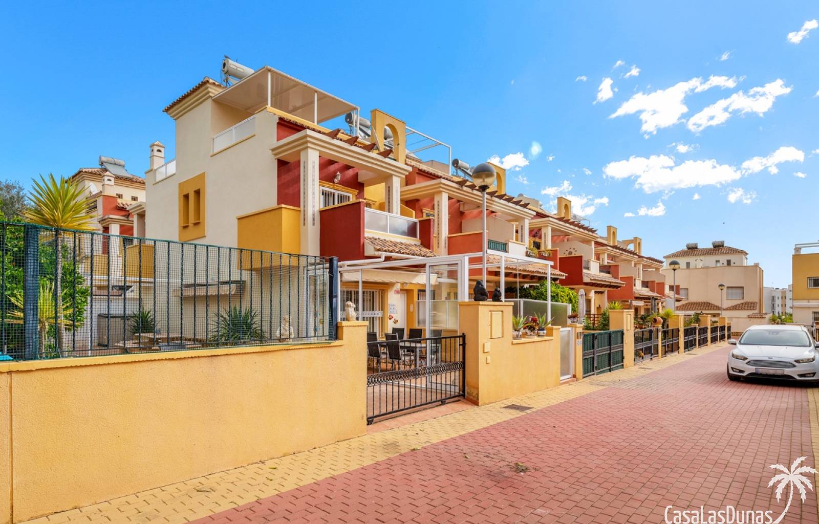 Casa adosada en esquina con una amplia parcela de más de 200 m²Orientación sur (sol todo el día)3 dormitorios / 2 baños1 dormitorio en la planta bajaCocina independiente totalmente equipada + patio cerradoBalcones privados para los dos dormitorios de la planta superiorSolarium privado en la azoteaComunidad cerradaPiscina comunitariaUbicación privilegiada en VillamartínA minutos de La Zenia Boulevard