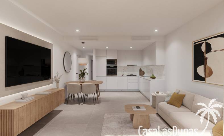 Esta exclusiva promoción nueva consta de solo 12 apartamentos y áticos de 2 o 3 dormitorios, diseñados para ofrecer comodidad, funcionalidad y estilo contemporáneo. Los apartamentos de las plantas intermedias cuentan con amplias terrazas, mientras que los áticos disfrutan de un solárium privado adicional, ideal para tomar el sol o comer al aire libre. Todas las viviendas incluyen una cocina abierta conectada con el salón-comedor, lo que crea interiores luminosos y acogedores. Los dormitorios cuentan con armarios empotrados y los baños están totalmente equipados con muebles, espejos y mamparas de ducha. Hay plazas de aparcamiento subterráneo y trasteros opcionales disponibles con un coste adicional.