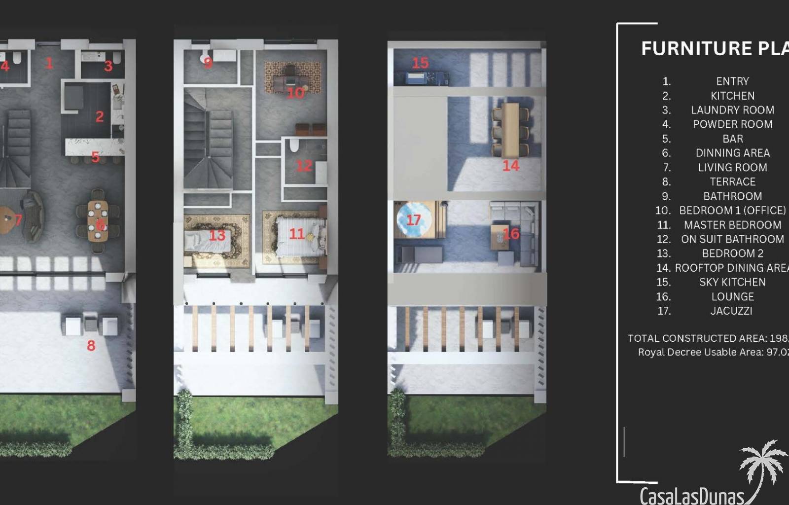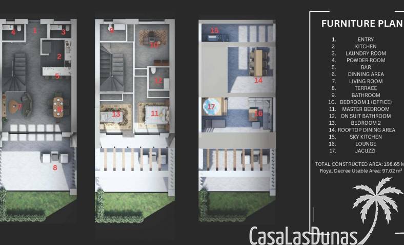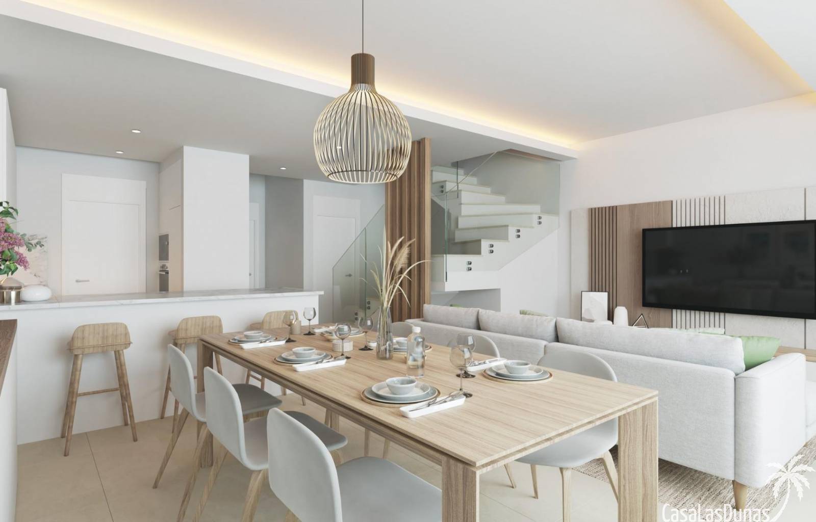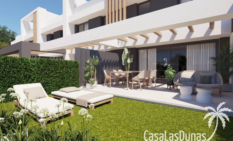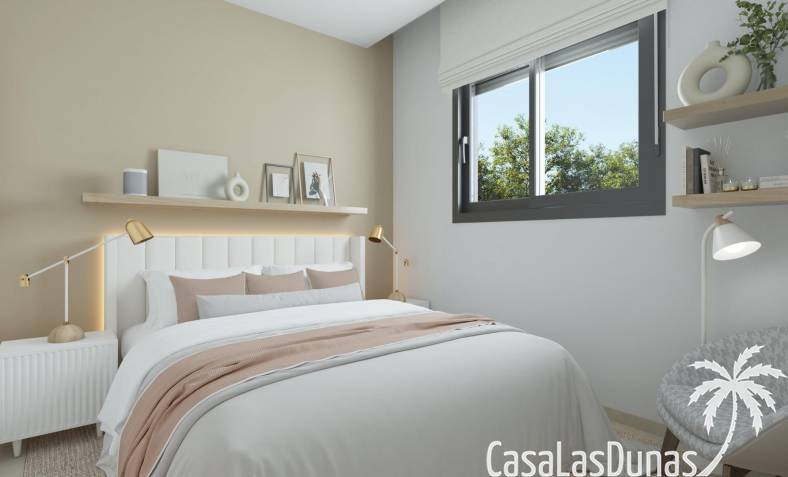 La promoción ofrece una selección de casas adosadas y unidades en esquina cuidadosamente diseñadas para maximizar la luz, el espacio y la privacidad. Cada vivienda se distribuye en dos plantas principales más un solárium privado en la azotea. En la planta baja se encuentra una sala de estar y comedor de planta abierta con cocina integrada, lavadero, aseo de invitados y acceso directo a la terraza y al jardín privado. La planta superior cuenta con tres dormitorios dobles y dos baños, incluido un dormitorio principal con baño en suite.