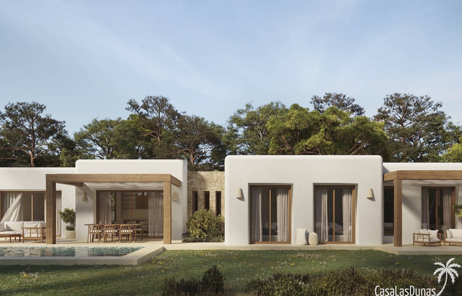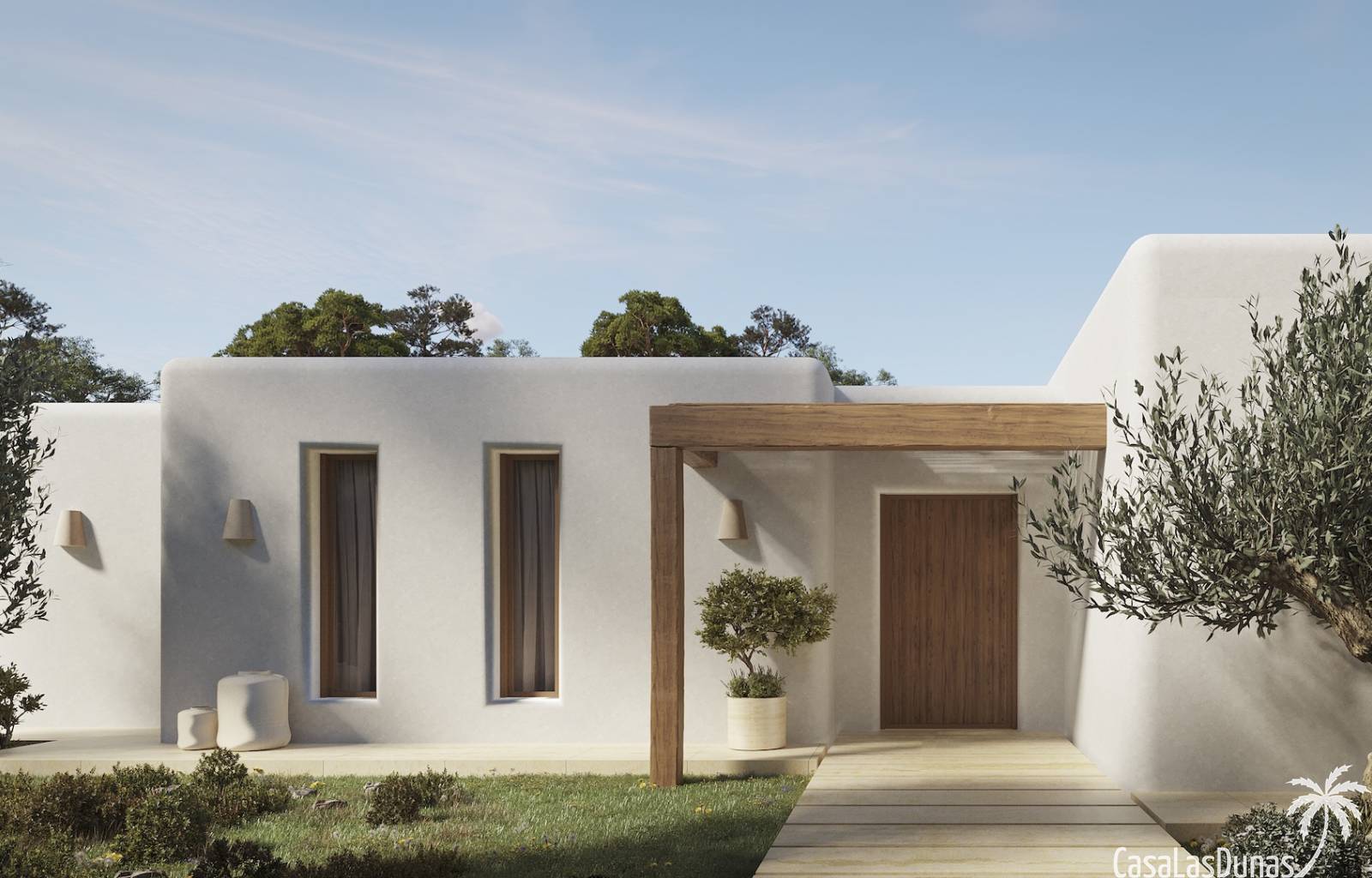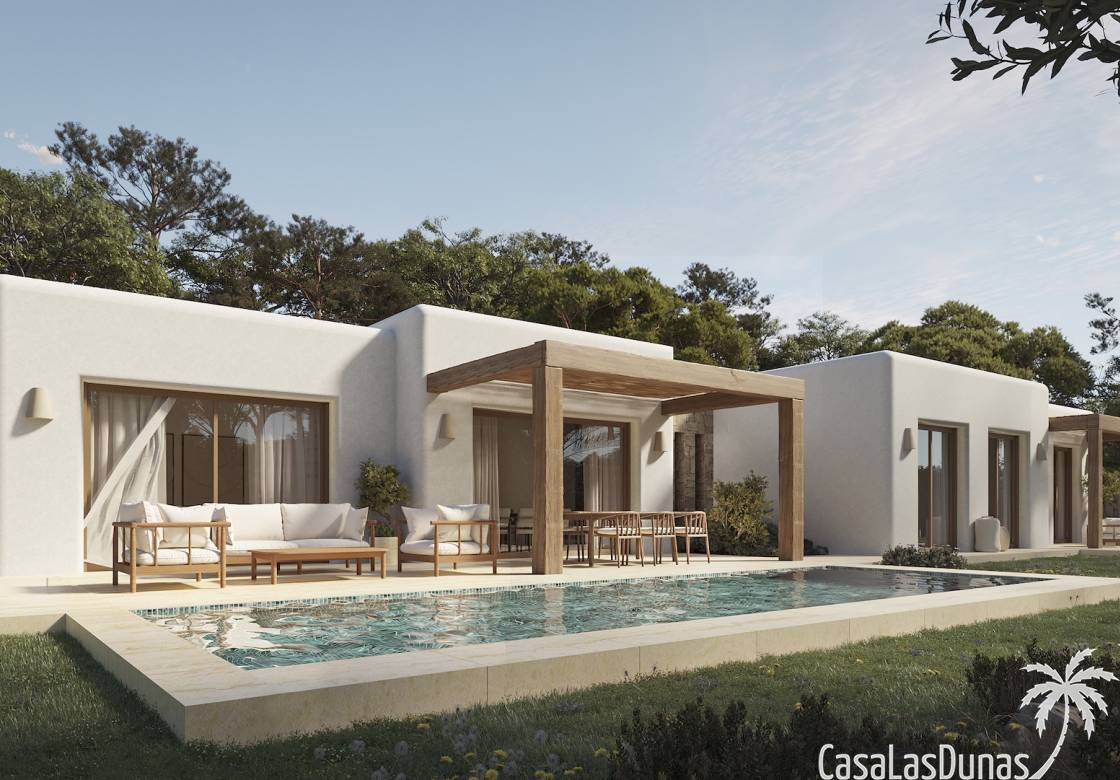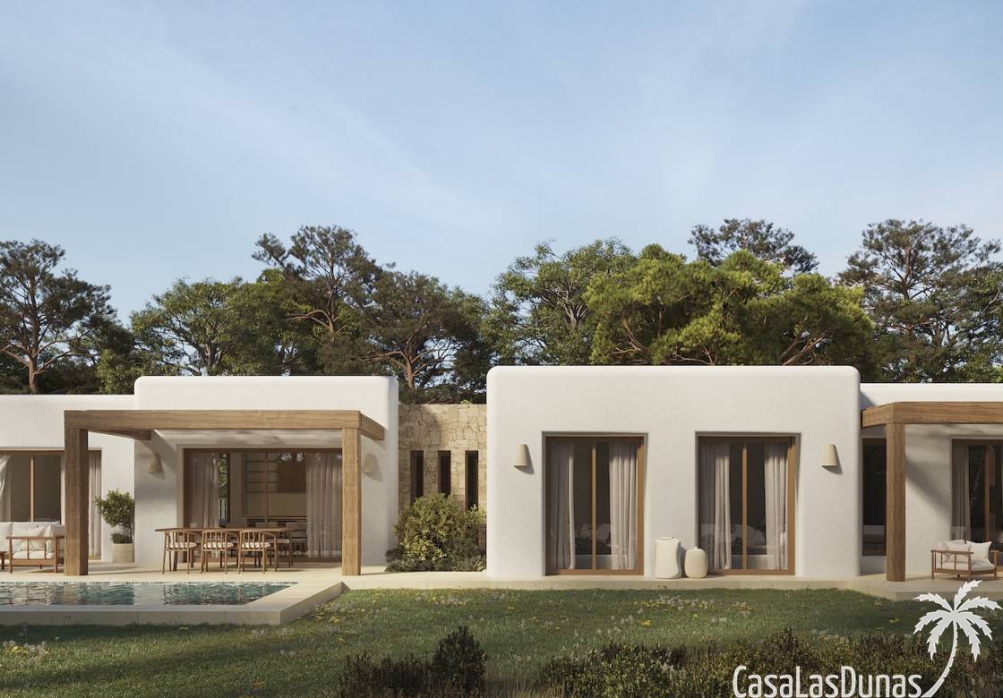 Cette élégante villa de style Ibiza est projetée sur un magnifique terrain dans le quartier exclusif de La Fustera à Benissa Costa, à quelques pas de la plage du même nom. Au total, quatre maisons de luxe seront construites ici et chaque villa a été soigneusement conçue pour s'intégrer parfaitement dans le magnifique environnement naturel, créant une atmosphère de tranquillité et de raffinement. L'architecture s'inspire de lignes épurées, de volumes cubiques et d'une sélection de matériaux naturels tels que le bois et la pierre naturelle. De grandes fenêtres panoramiques inondent l'intérieur de lumière naturelle et relient harmonieusement les espaces de vie intérieurs et extérieurs. Un jardin paysager luxuriant augmente l'intimité et transforme la maison en une oasis de tranquillité. Chaque villa est de plain-pied et dispose d'une superficie totale de 139 m2 + 68 m2 de terrasses avec pergolas. Des finitions de haute qualité, des carreaux de céramique haut de gamme et des fenêtres personnalisées contribuent à une maison conçue à la fois pour l'esthétique et la fonctionnalité. La cuisine entièrement équipée, avec des appareils Bosch et d'élégants plans de travail Silestone, est directement reliée au salon ouvert. Les chambres à coucher se composent d'une chambre principale avec salle de bains privative et de deux chambres doubles avec salle de bains commune. Pour plus de confort, les villas sont également équipées de volets roulants électriques et de stores enrouleurs électriques. Chaque villa dispose d'une piscine privée de 29 m2 qui vous invite à vous détendre sous le soleil méditerranéen. De vastes terrasses offrent le cadre idéal pour les repas en plein air et les rassemblements au coucher du soleil, tandis que le jardin magnifiquement aménagé renforce le sentiment de retraite.