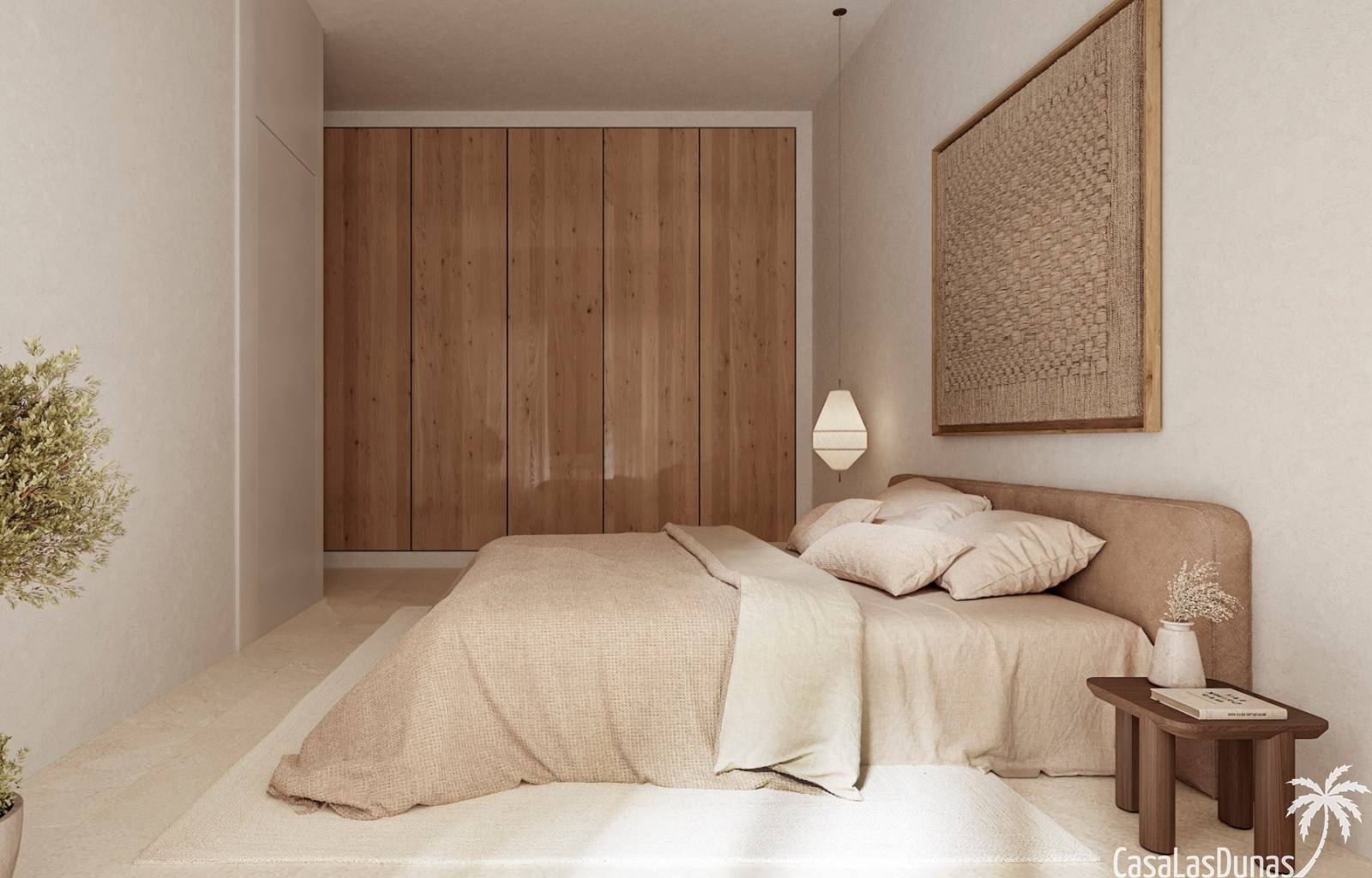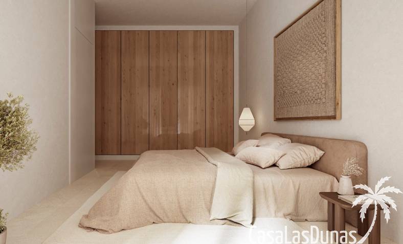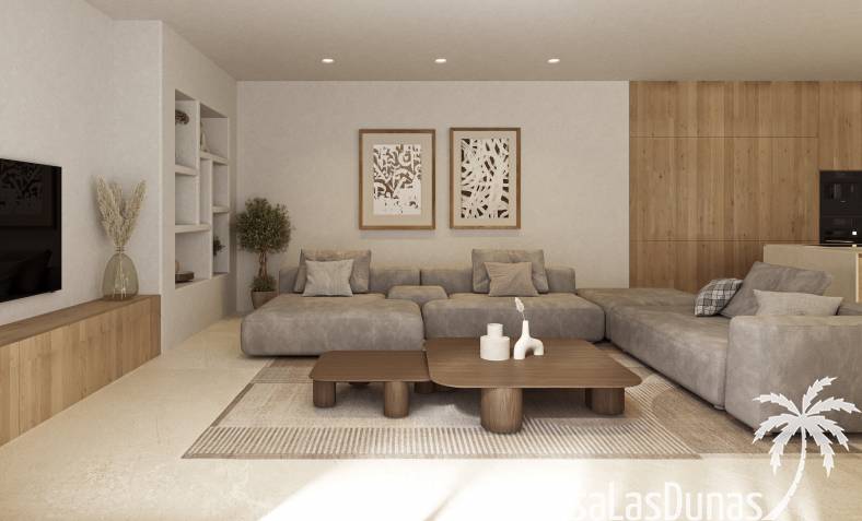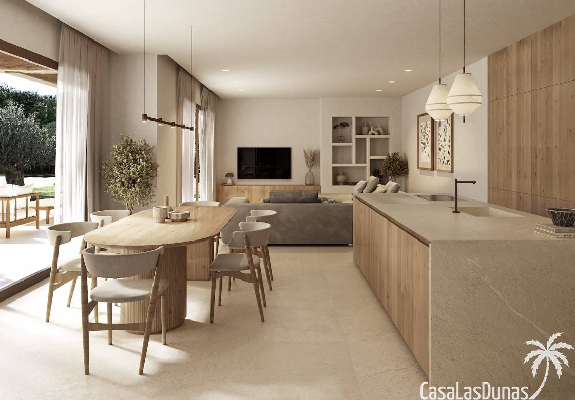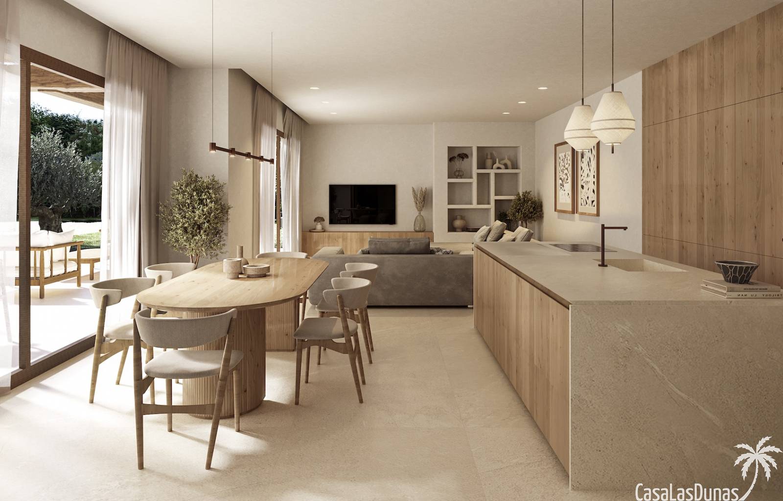Cette élégante villa de style Ibiza est projetée sur un magnifique terrain dans le quartier exclusif de La Fustera à Benissa Costa, à quelques pas de la plage du même nom. Au total, quatre maisons de luxe seront construites ici et chaque villa a été soigneusement conçue pour s'intégrer parfaitement dans le magnifique environnement naturel, créant une atmosphère de tranquillité et de raffinement. L'architecture s'inspire de lignes épurées, de volumes cubiques et d'une sélection de matériaux naturels tels que le bois et la pierre naturelle. De grandes fenêtres panoramiques inondent l'intérieur de lumière naturelle et relient harmonieusement les espaces de vie intérieurs et extérieurs. Un jardin paysager luxuriant augmente l'intimité et transforme la maison en une oasis de tranquillité. Chaque villa est de plain-pied et dispose d'une superficie totale de 139 m2 + 68 m2 de terrasses avec pergolas. Des finitions de haute qualité, des carreaux de céramique haut de gamme et des fenêtres personnalisées contribuent à une maison conçue à la fois pour l'esthétique et la fonctionnalité. La cuisine entièrement équipée, avec des appareils Bosch et d'élégants plans de travail Silestone, est directement reliée au salon ouvert. Les chambres à coucher se composent d'une chambre principale avec salle de bains privative et de deux chambres doubles avec salle de bains commune. Pour plus de confort, les villas sont également équipées de volets roulants électriques et de stores enrouleurs électriques. Chaque villa dispose d'une piscine privée de 29 m2 qui vous invite à vous détendre sous le soleil méditerranéen. De vastes terrasses offrent le cadre idéal pour les repas en plein air et les rassemblements au coucher du soleil, tandis que le jardin magnifiquement aménagé renforce le sentiment de retraite.