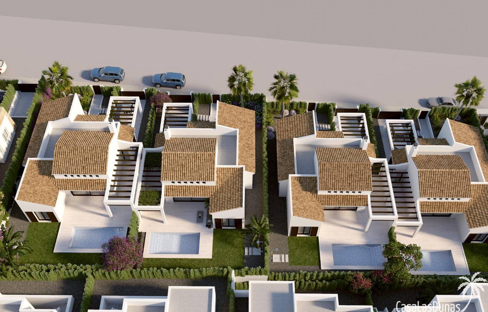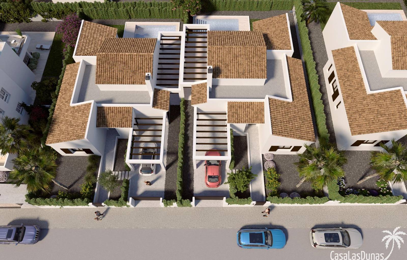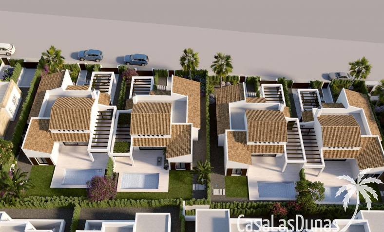 Villas neuves avec 3 chambres, 2 salles de bains, une cuisine ouverte sur le salon avec des portes-fenêtres donnant sur le jardin avec piscine et un parking hors route.