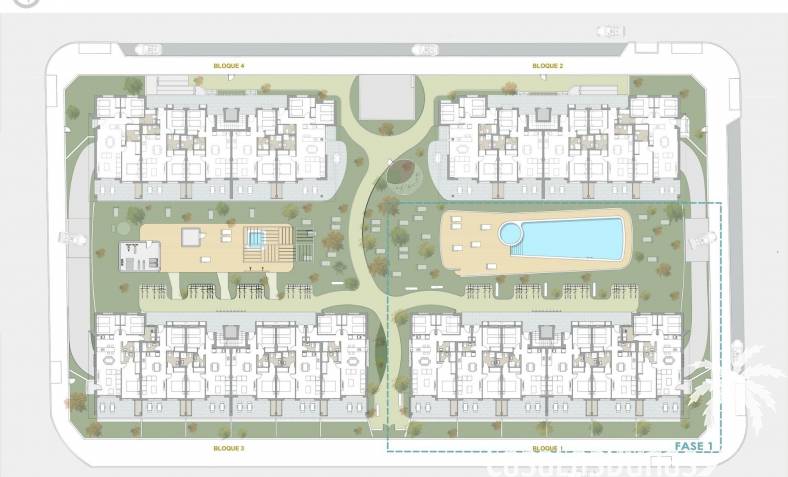 L'immeuble est entouré de jardins, il disposera également d'une piscine commune, d'un parking à l'intérieur du complexe et chaque propriété dispose de son propre local de stockage privé.