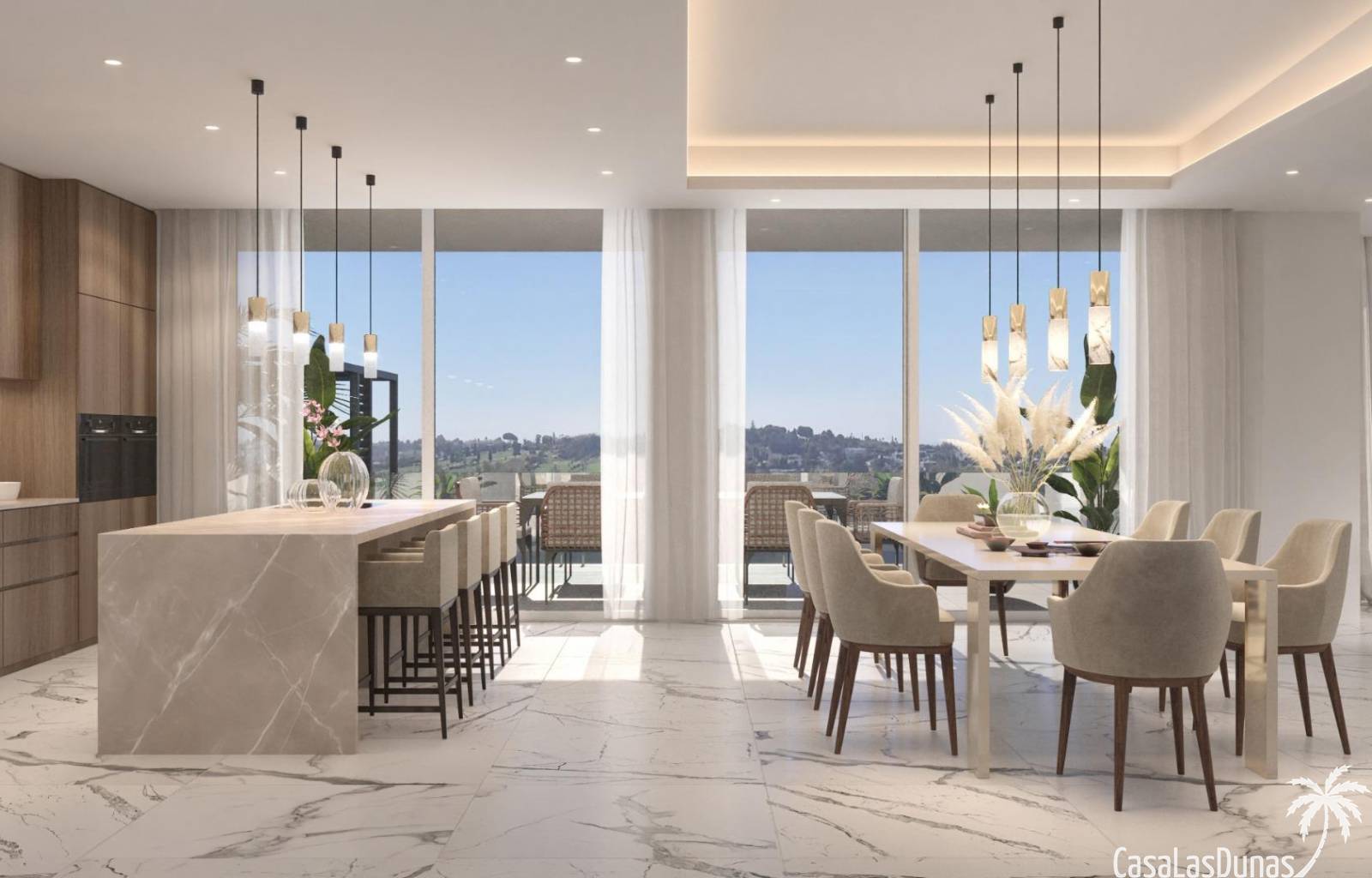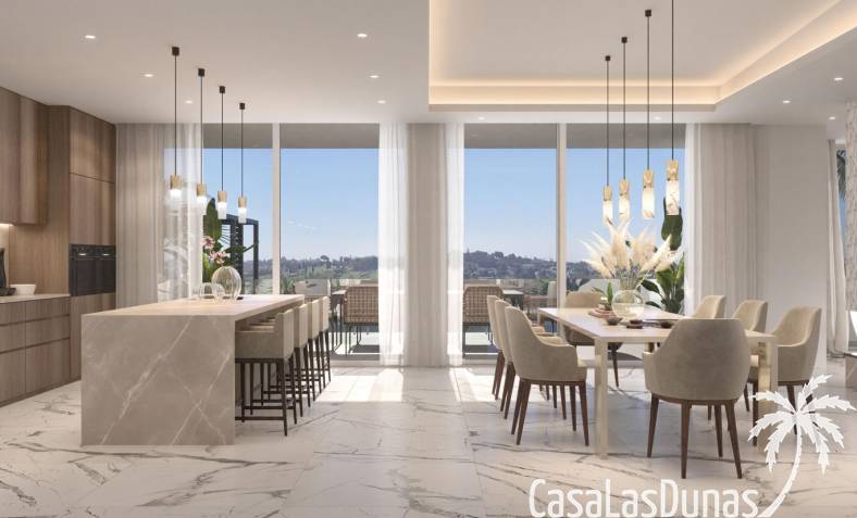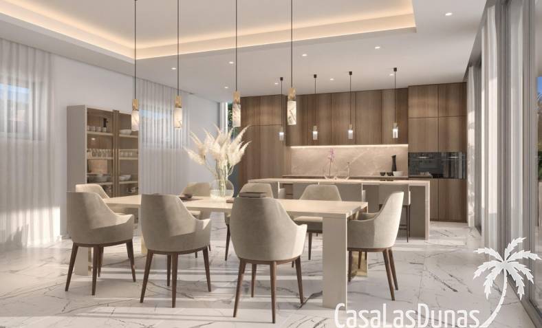 Cuisine de première qualité, selon la conception du projet. Avec îlot central, plan de travail en SILESTONE, appareils électroménagers de première marque.