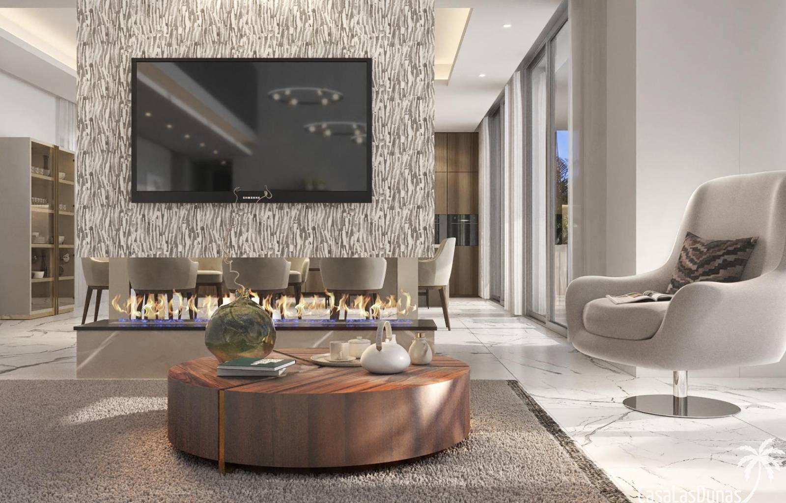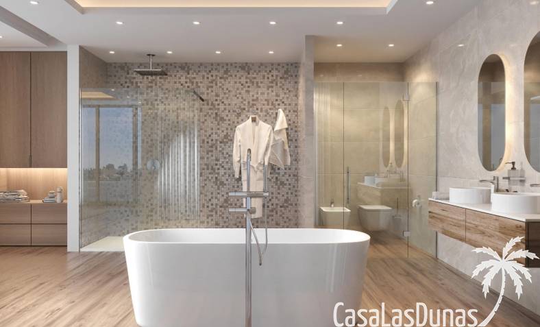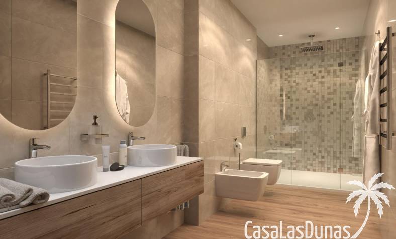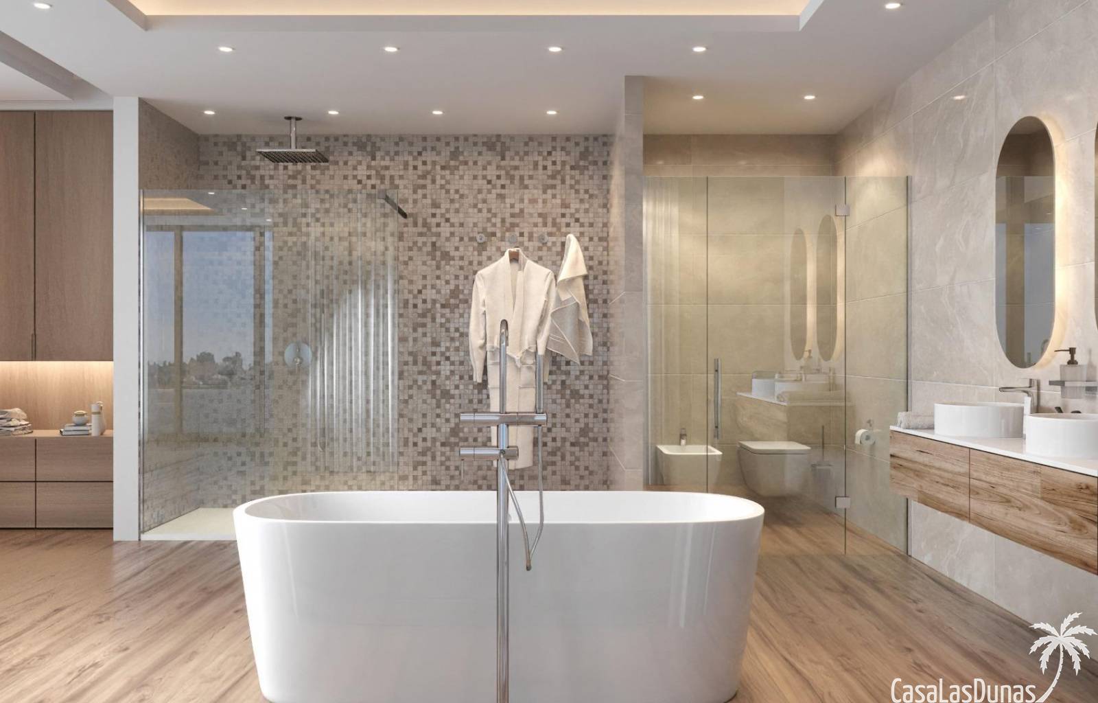 Sols en PORCELAINE de première qualité, dimensions 120x120cm, imitation marbre. Les chambres à coucher, la salle de bain principale et les distributeurs supérieurs seront en BOIS LAMINÉ de première qualité, couleur chêne blanc.