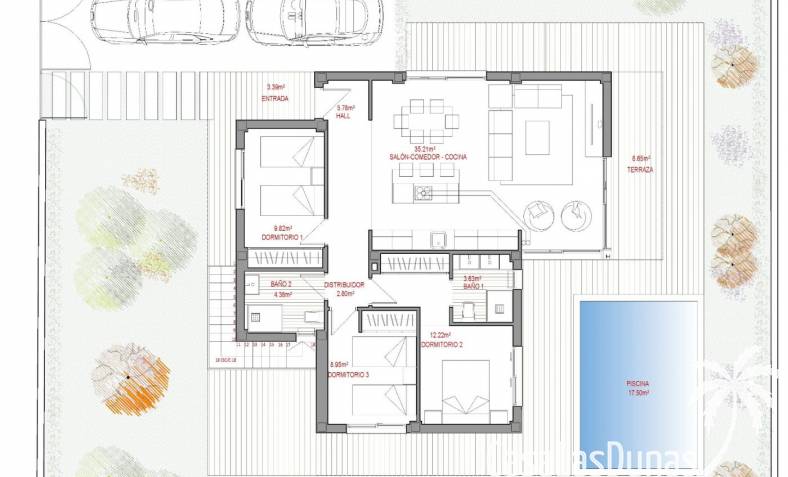 VILLA pensée et conçue pour tirer le meilleur parti des espaces, de plain-pied avec un terrain minimum de 400 m2, terrain indépendant, périmètre fermé, piscine privée, parking, accès motorisé, jardin fini avec gravier et plantes ornementales.