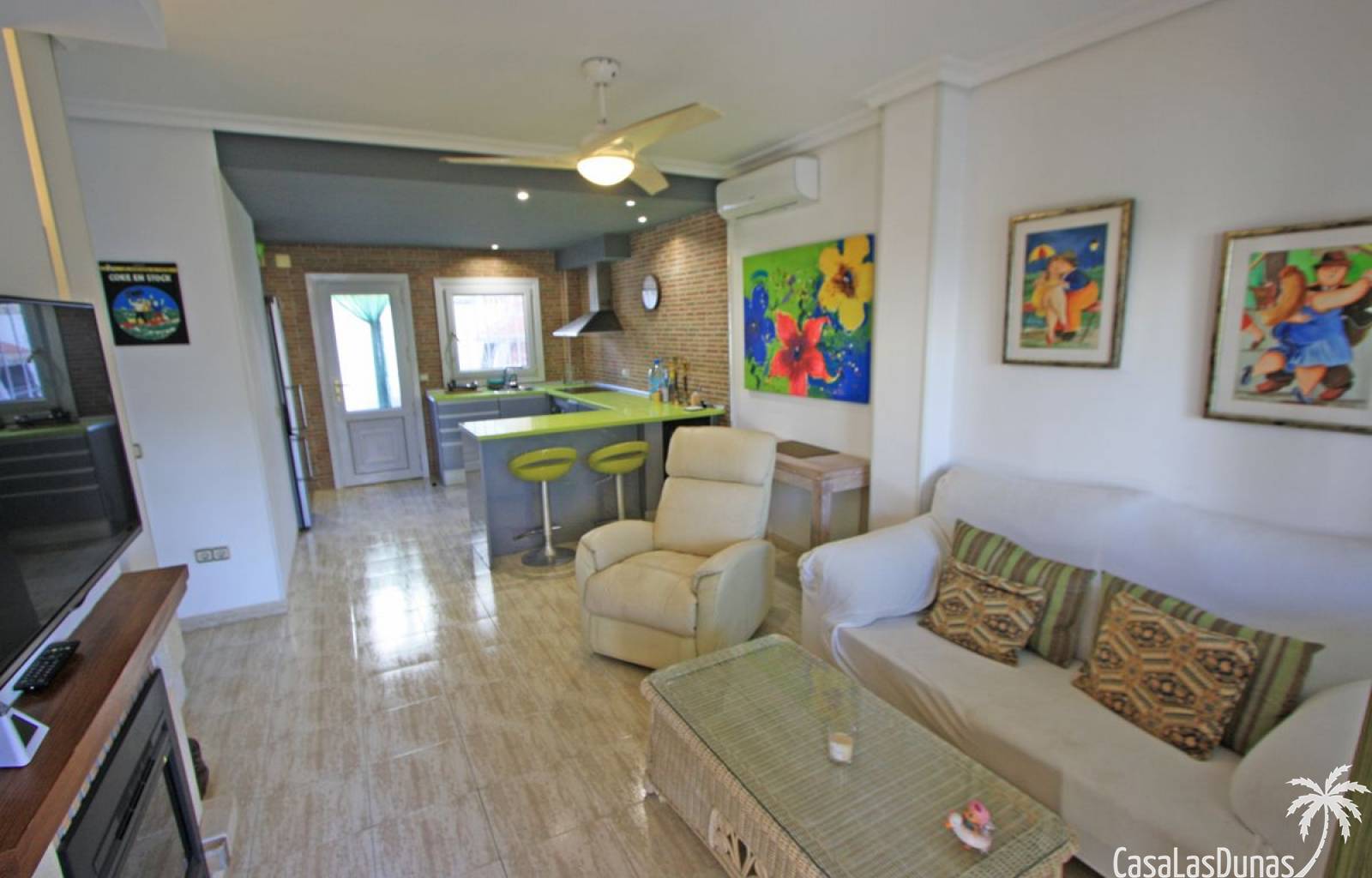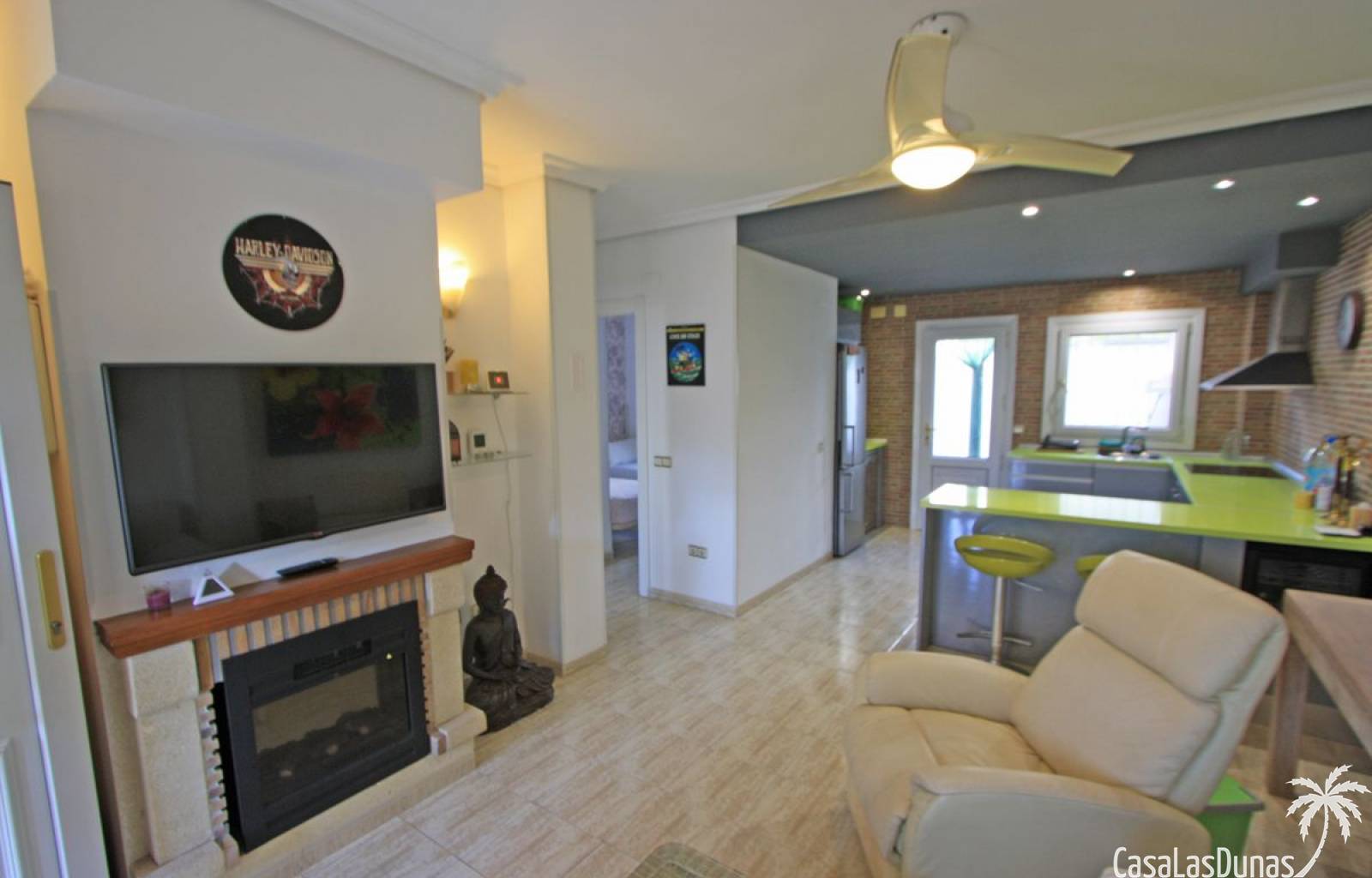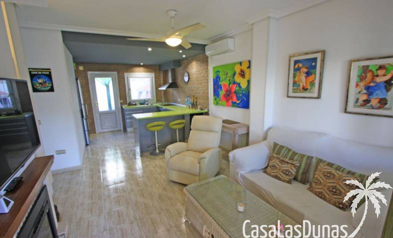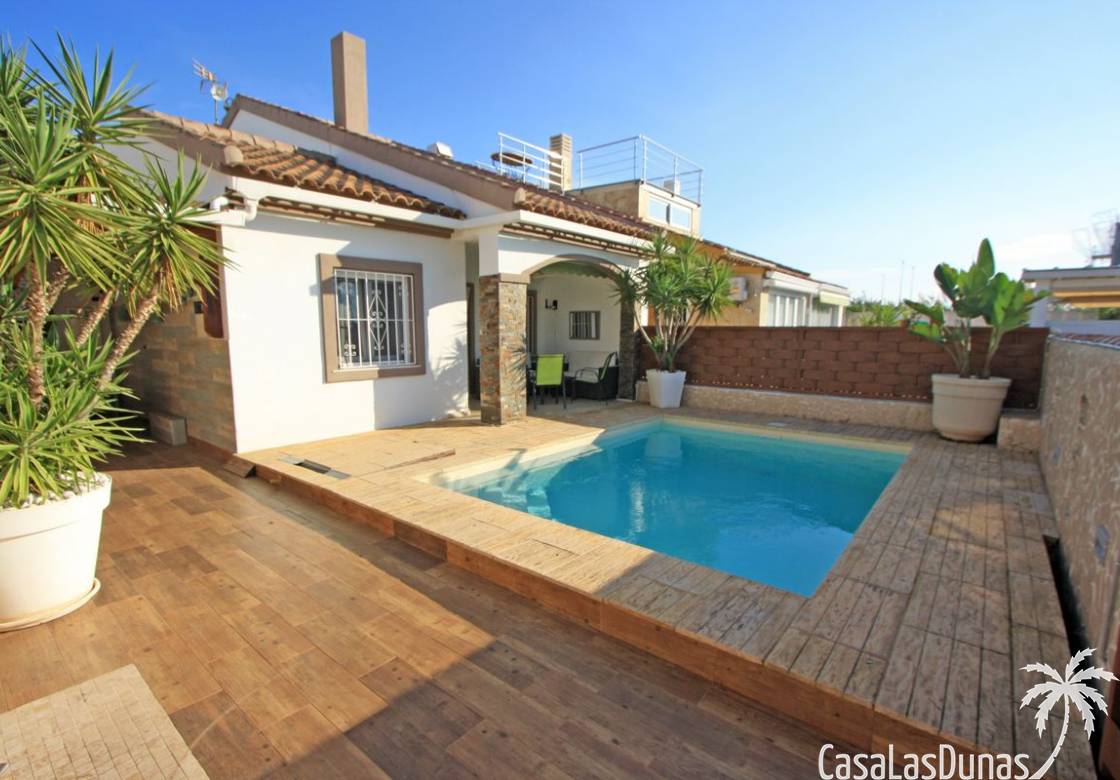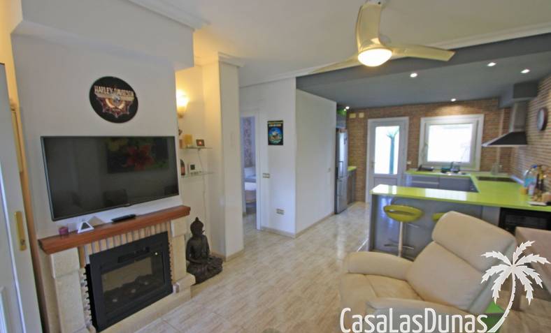 Charmante villa mitoyenne avec petite piscine privée, située à 500 mètres des vastes plages de sable d'El Vergel. Le rez-de-chaussée comprend un séjour/salle à manger avec cuisine ouverte et accès à une terrasse couverte à l'avant et à un patio à l'arrière. On y trouve également deux chambres et une salle de bains. À l'étage (avec accès indépendant), se trouve une chambre d'amis avec salle de bains et terrasse sur le toit.