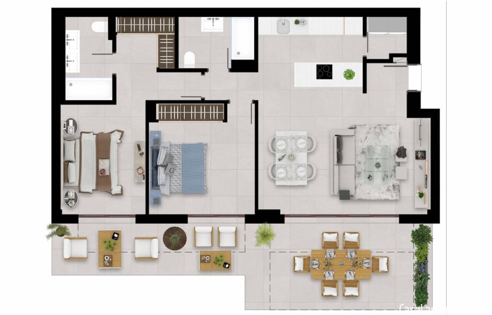 Les résidences proposent des agencements de 2 et 3 chambres avec des intérieurs ouverts qui optimisent l'espace, la lumière et la fonctionnalité. Les appartements du rez-de-chaussée et des étages intermédiaires disposent de terrasses spacieuses, tandis que les penthouses comprennent des solariums privés offrant une vue imprenable sur la mer ou la forêt.
