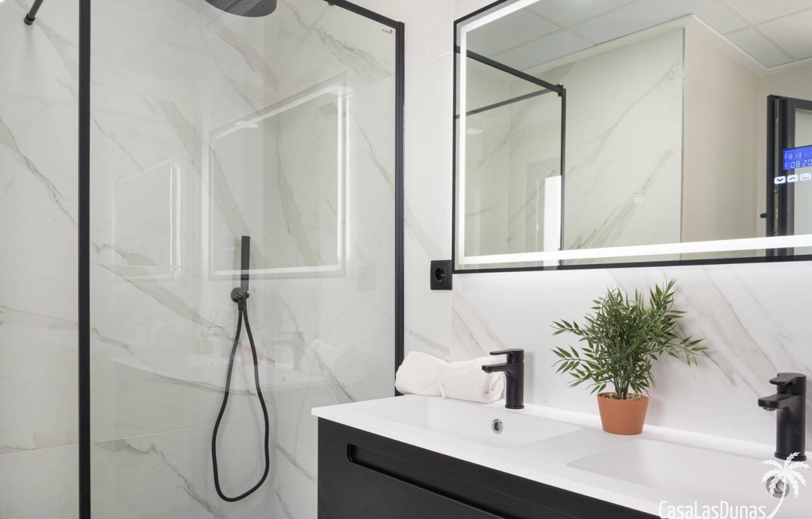 Wyposażone łazienki z podświetlanymi lustrami i meblami