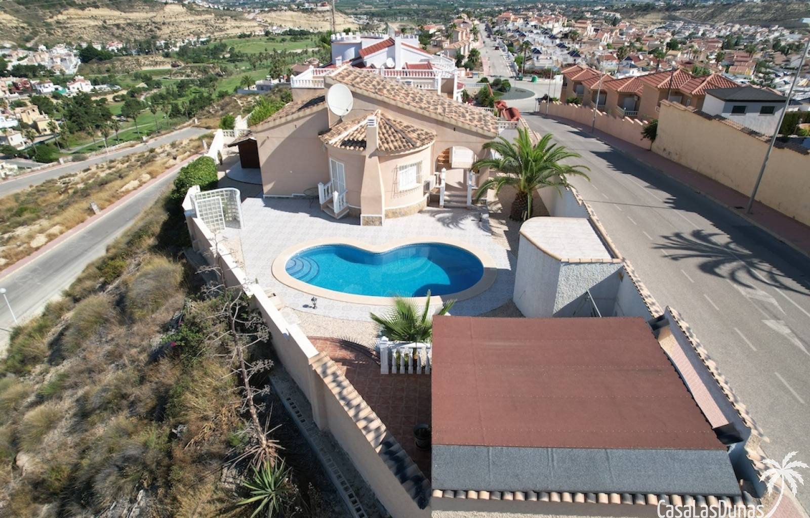 Fristående hus i gott skick i söderläge i urbaniseringen Ciudad Quesada, kommun Rojales. Fastigheten, byggd 2004, ligger på en tomt på 500 m2 med stenlagd trädgård, 2 parkeringsplatser (av dem täckt), en privat pool med utomhusdusch, grill och lusthus. Här finns även ett förråd med poolpump och gästtoalett. Byggytan är 140m2, boarean är ca 126m2. Du kan komma in i huset via terrassen. Längre fram finns ett ljust vardagsrum/matsal, ett öppet kök, ett master bedroom med ett eget badrum med dagsljus och dusch, ytterligare 2 sovrum och ett ljust badrum med badkar och separat dusch. Andra funktioner i fastigheten inkluderar inbyggda garderober, tvåglasfönster med externa persienner, en öppen spis i vardagsrummet och luftkonditionering. Från den privata takterrassen kan du njuta av vacker utsikt över omgivningarna. Klubben "La Marquesa Golf" ligger cirka 1 km bort. Om det behövs kan du snabbt nå Ciudad Quesadas centrum med många bekvämligheter. De berömda sandstränderna i kommunen, som belönats med den berömda Blå Flagg, ligger cirka 5 kilometer bort. Alicante "El Altet" flygplats är lättillgänglig via riksväg N332 eller medelhavsmotorvägen AP-7.