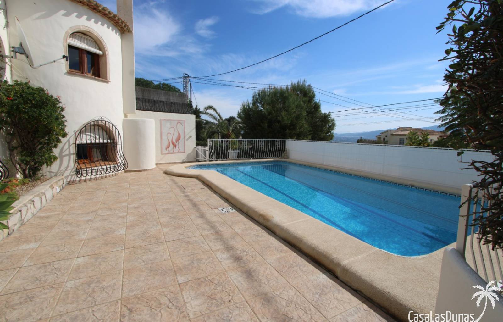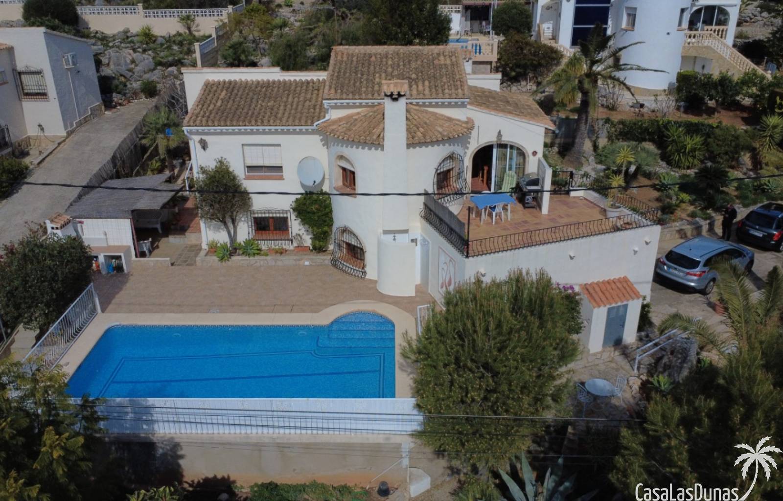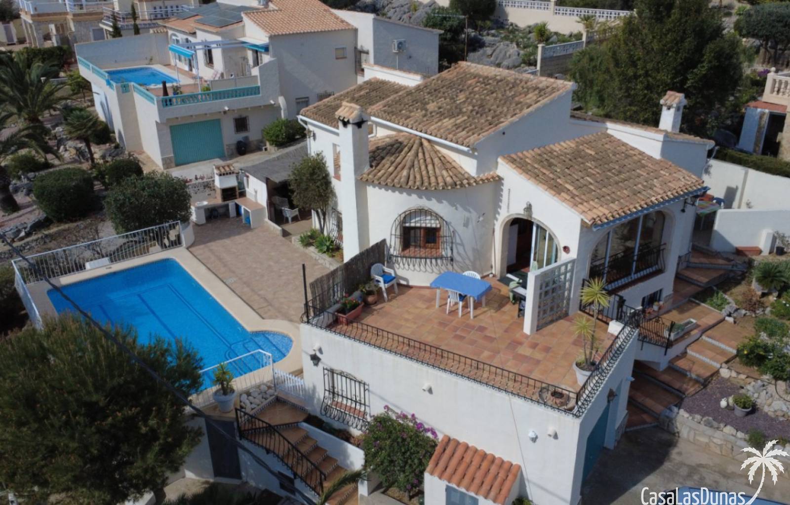 Chalet med privat pool till salu i Sanet y Negrals, helt i söderläge och med panoramautsikt. Villan har två separata våningar: bottenvåningen med ett rymligt vardagsrum, öppet kök, täckt terrass, två sovrum och ett badrum, och en gästlägenhet på nedervåningen med vardagsrum, kök, två sovrum och ett badrum. Bekvämligheter inkluderar luftkonditionering, gasvärme, öppen spis och dubbelglas. Utomhus finns en 10x5 meter stor pool, en utomhusdusch, en grill, ett garage för en bil och ytterligare parkering för två fordon.